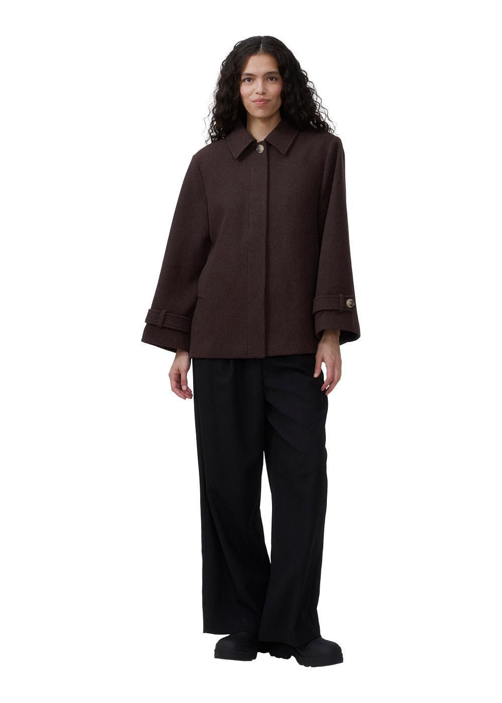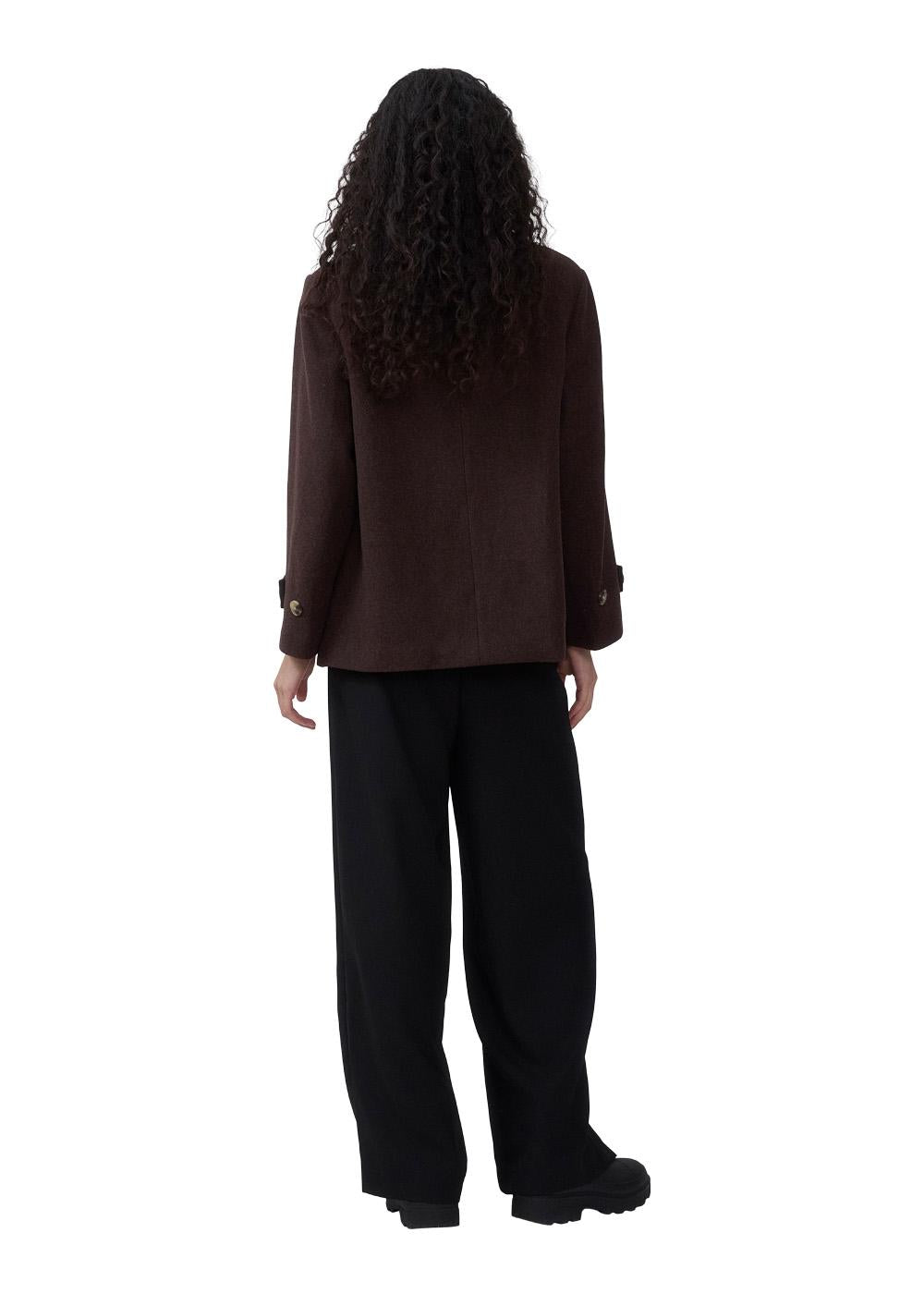 Denne jakke kombinerer en afslappet silhuet med klassiske detaljer. Den varme uldblanding og den dybe brune farve gør den til et alsidigt valg, der fuldender ethvert outfit med et stilfuldt udtryk.