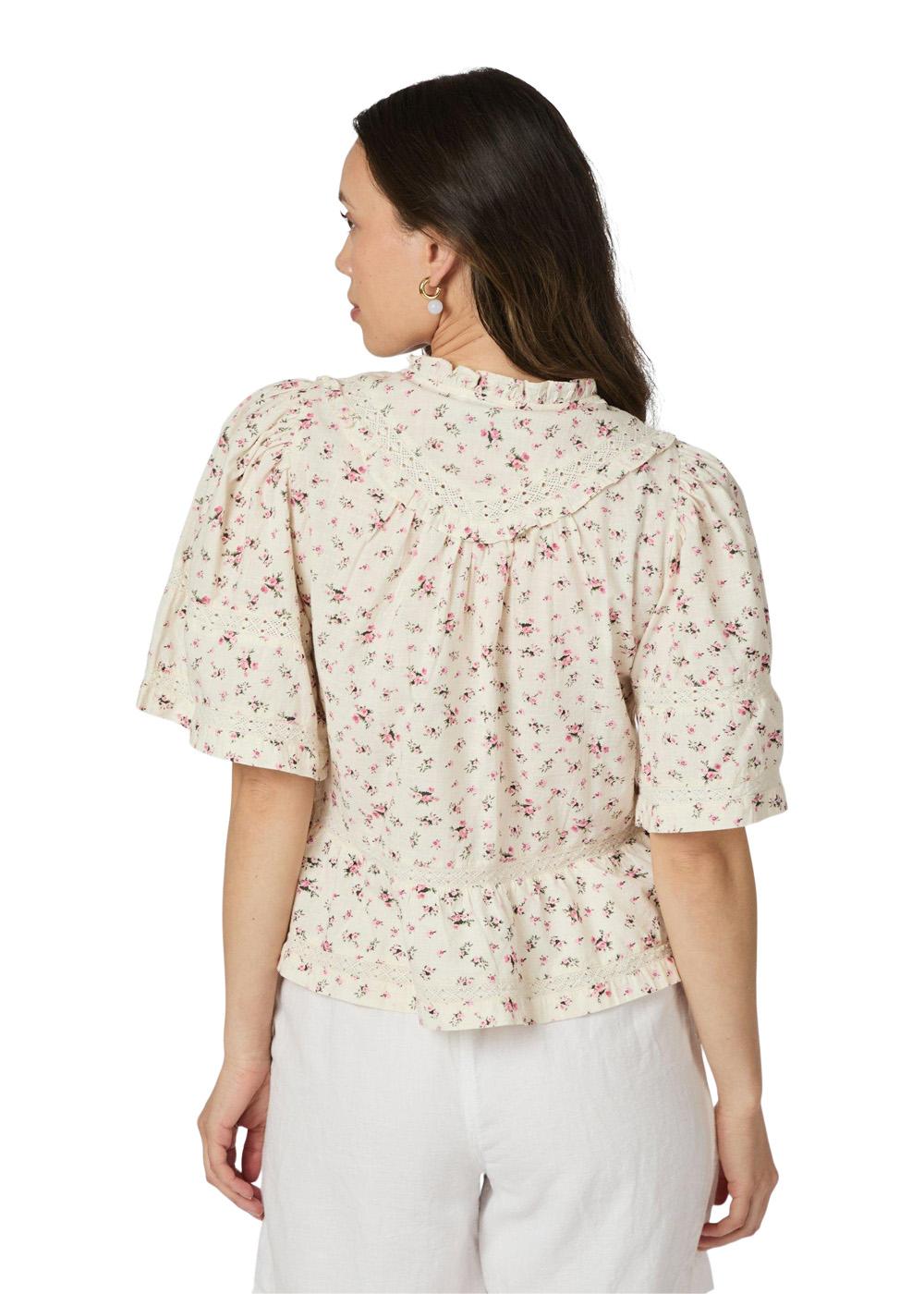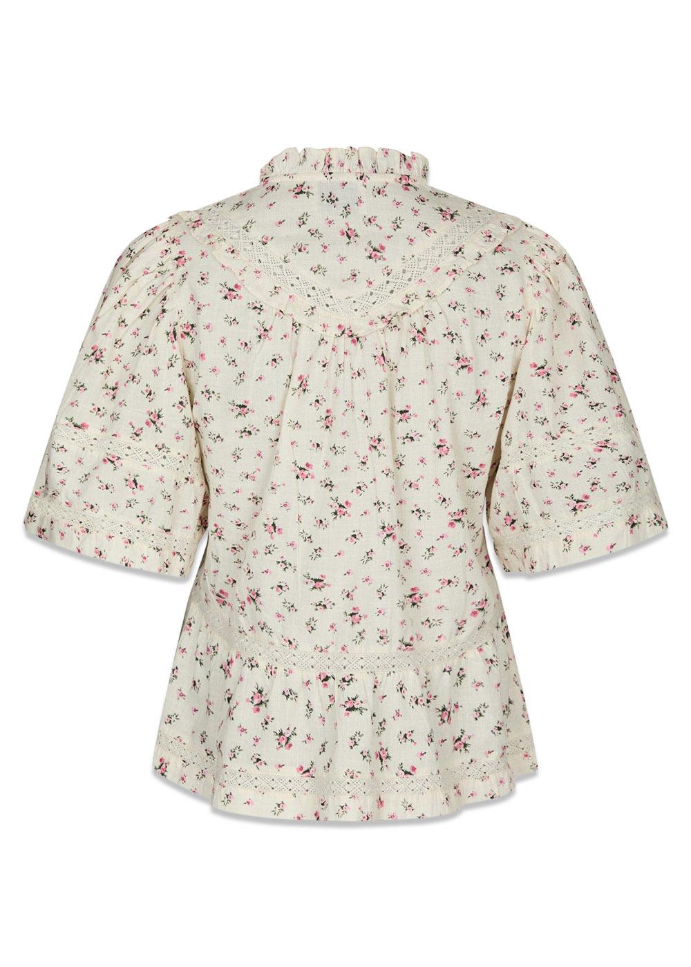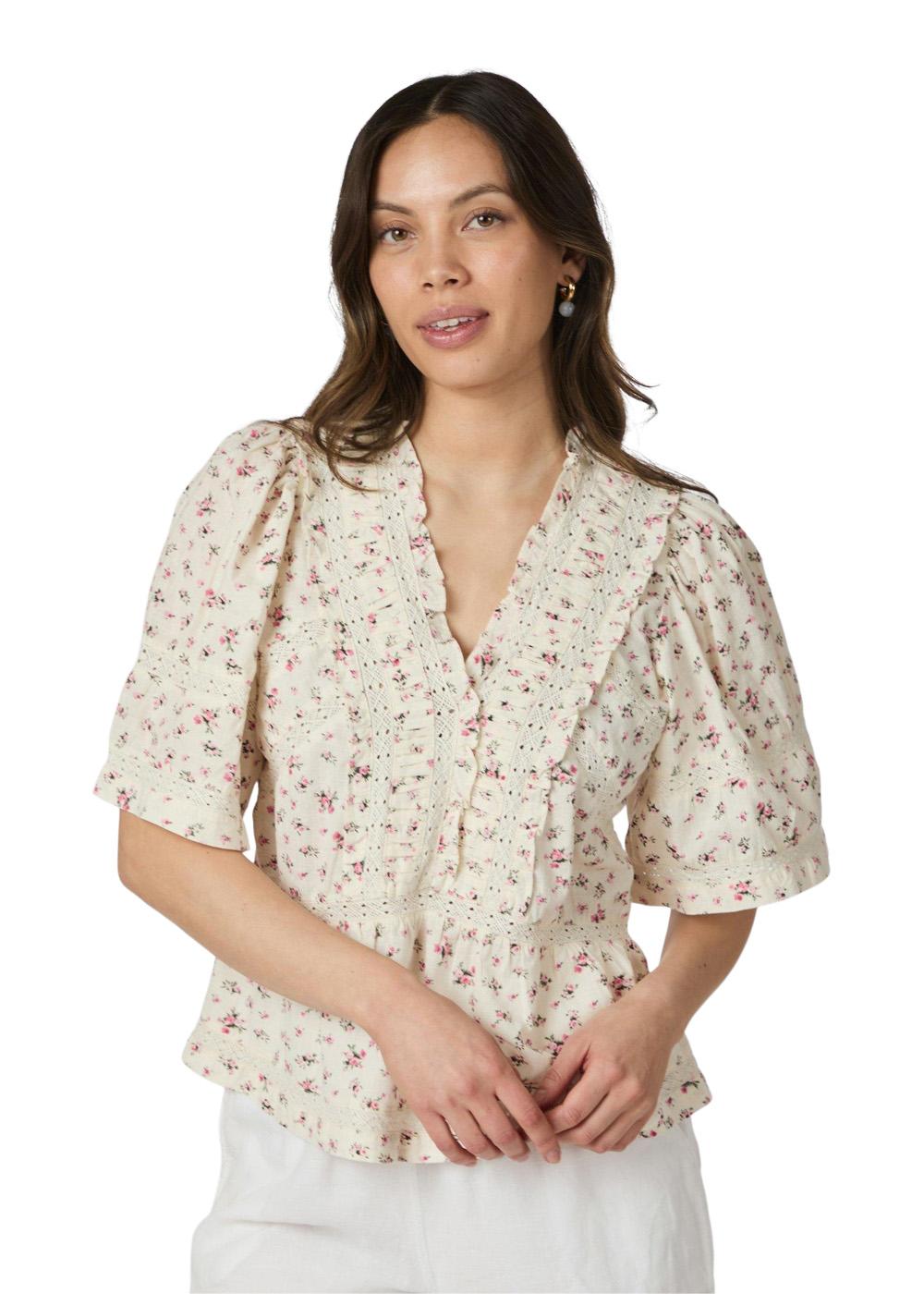Evienne Floral Blush Top fra Neo Noir er en retro-inspireret bluse med et fint rosa blomsterprint. Den har elegante flæsedetaljer, broderi og en feminin V-udskæring, som giver et romantisk og let udtryk.
