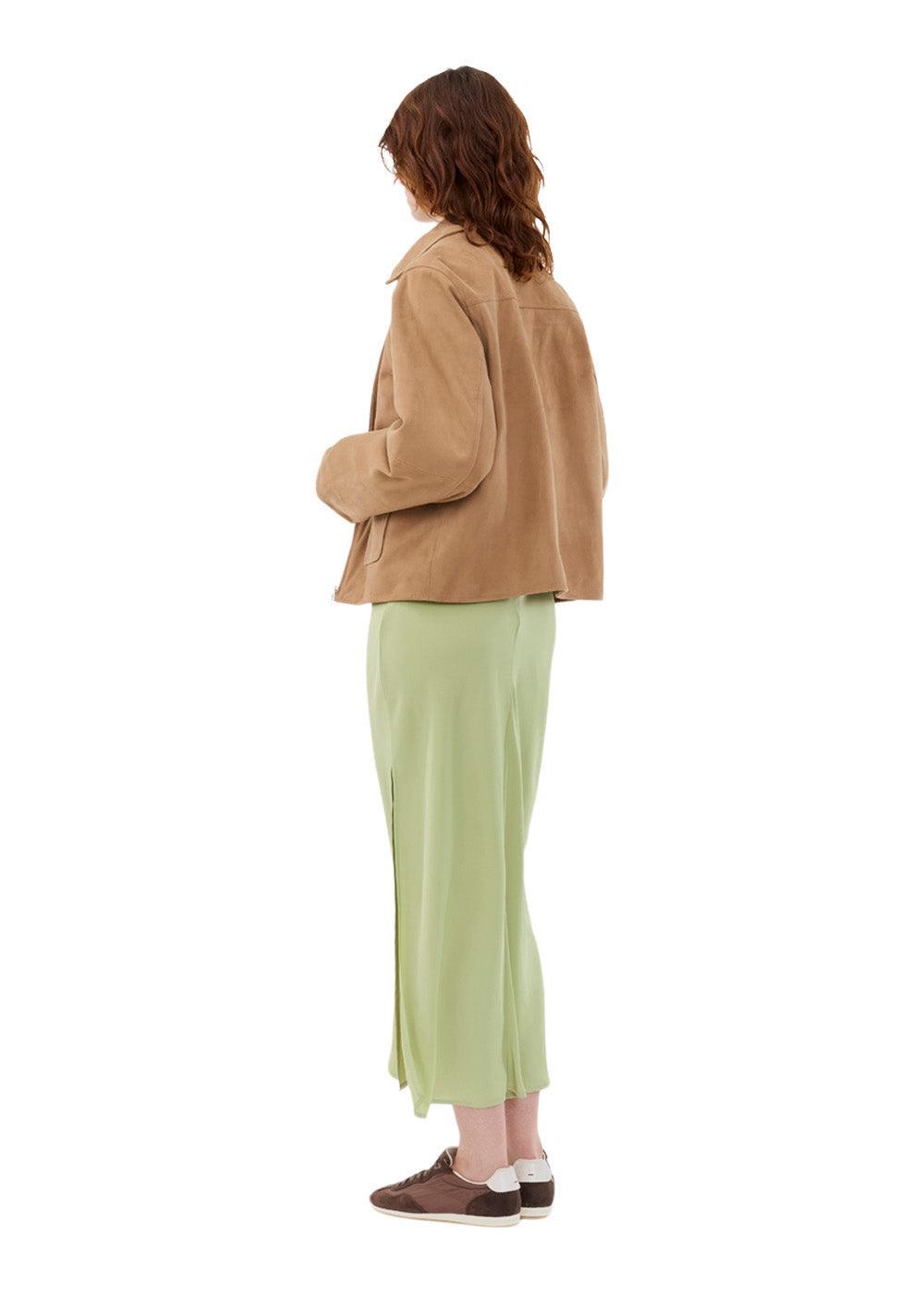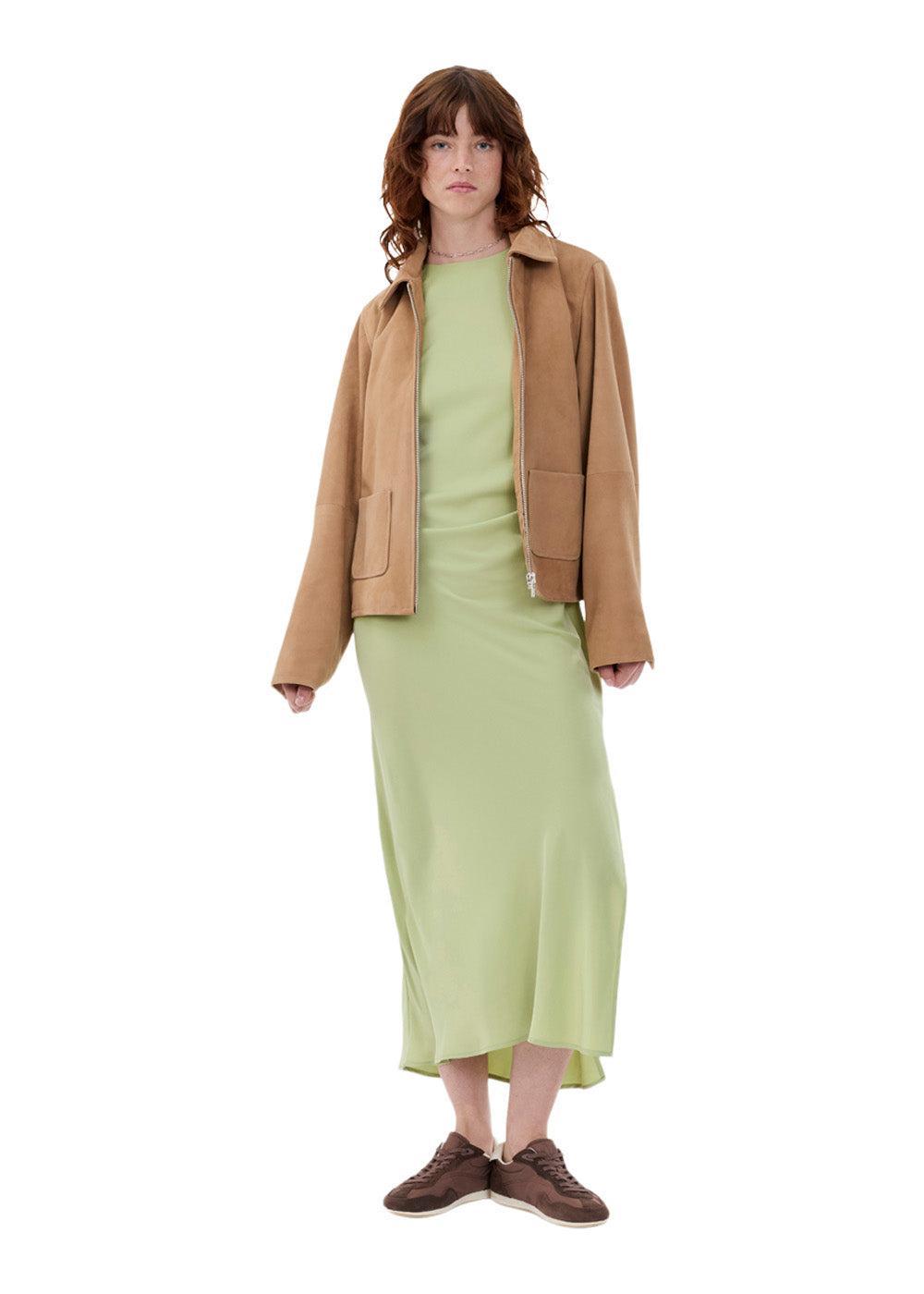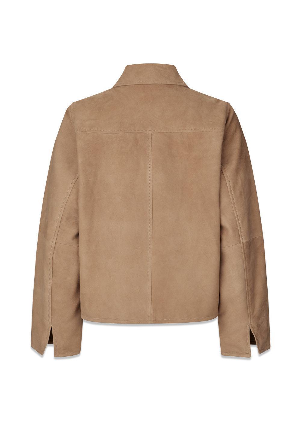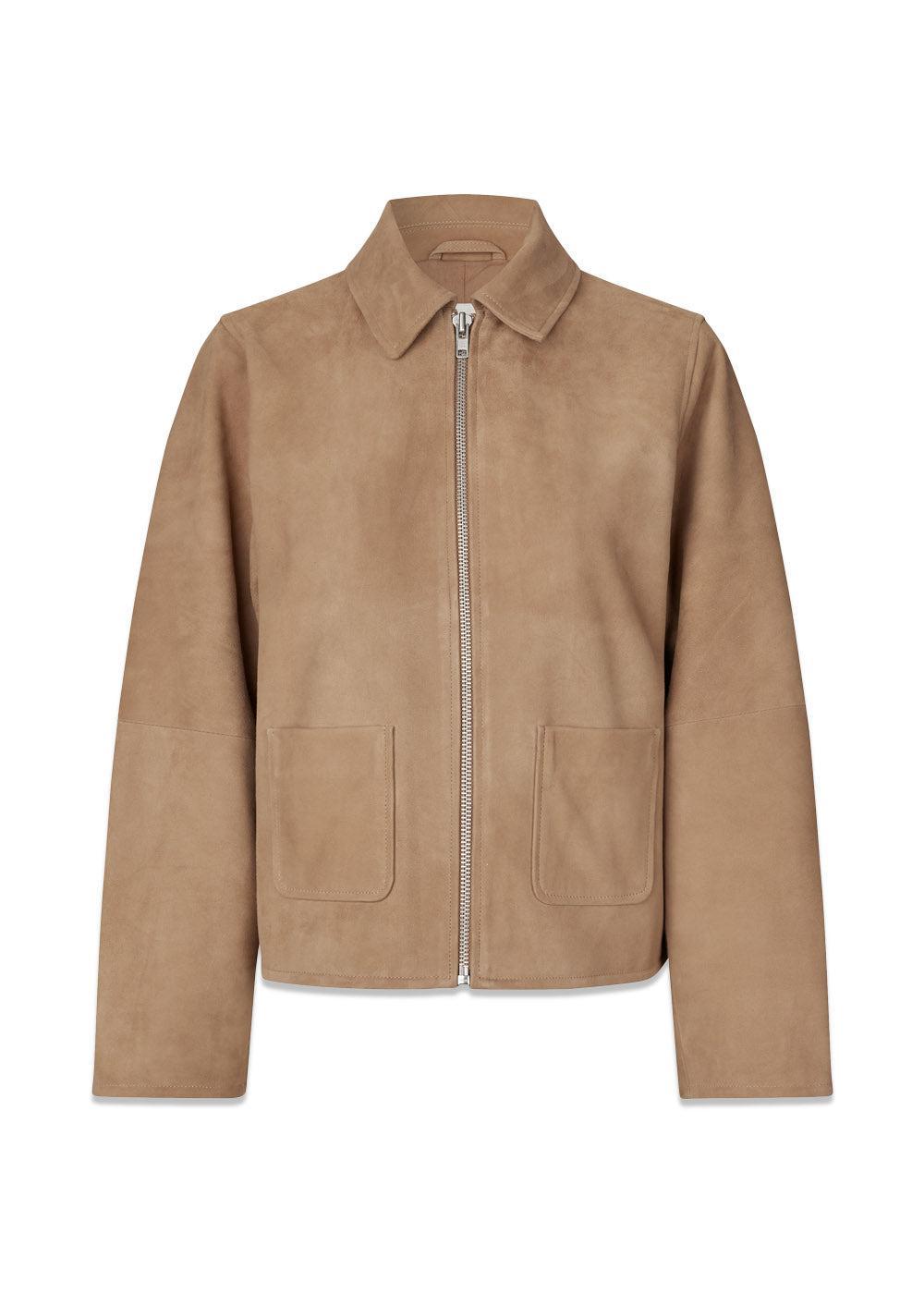Klassisk ruskindsjakke fra Modström i en smuk, ensfarvet camel. Jakken har et stilrent design med en moderne, boxy pasform, lynlåslukning og påsatte forlommer, der skaber et tidløst og elegant udtryk.