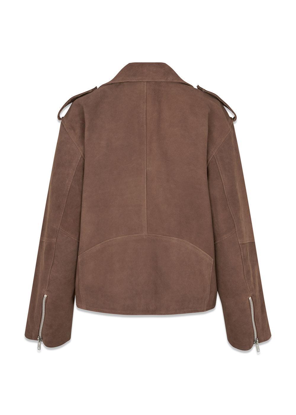 Opdag denne klassiske bikerjakke fra Modström, udført i luksuriøst brunt ruskind. Jakken har en moderne boxy pasform og er designet med en asymmetrisk lynlås og markante revers, der tilføjer et råt og stilfuldt udtryk.