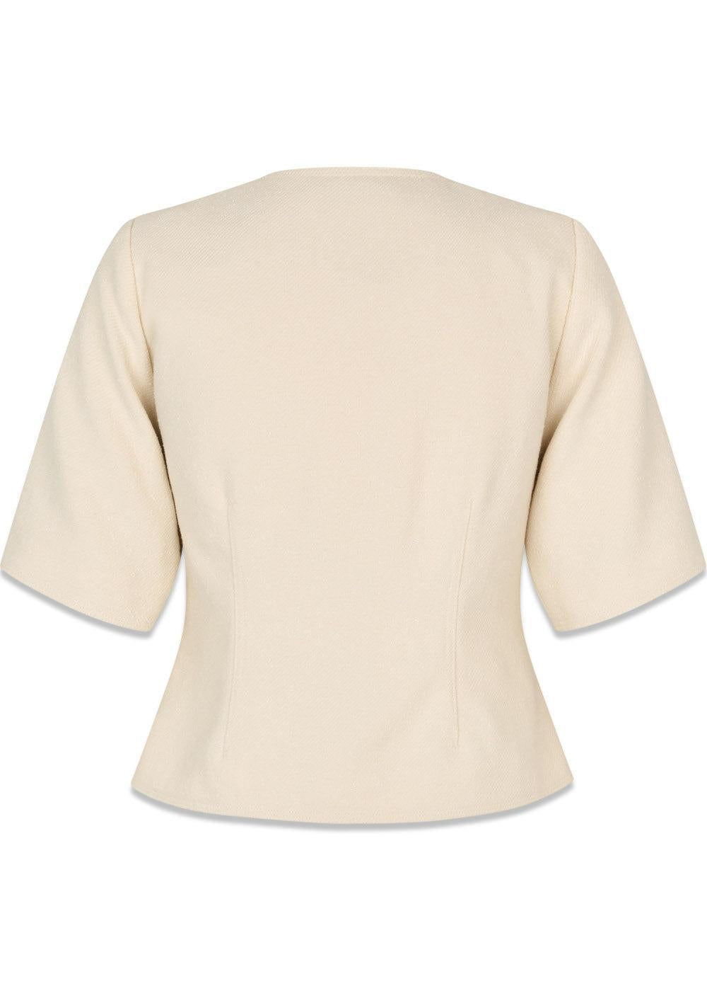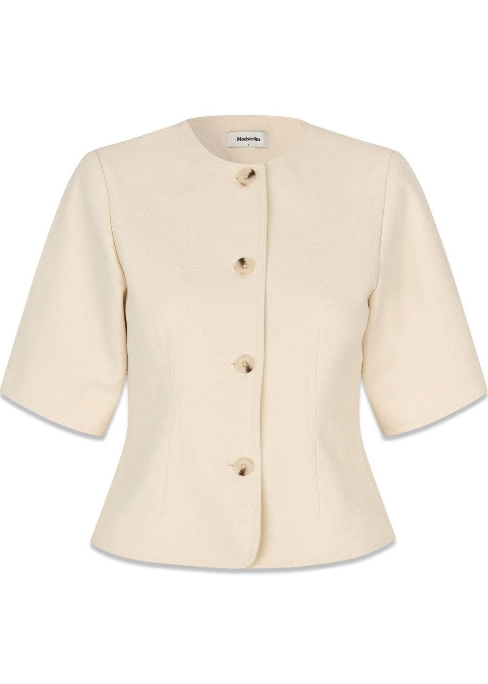Vesmd blazeren fra Modström er en stilfuld, cropped blazer i en elegant cremefarve. Den har et retro-inspireret design med korte ærmer, kontrastknapper og en enkeltradet lukning, der skaber et moderne og skarpt udtryk.