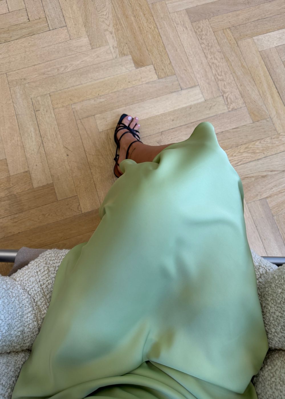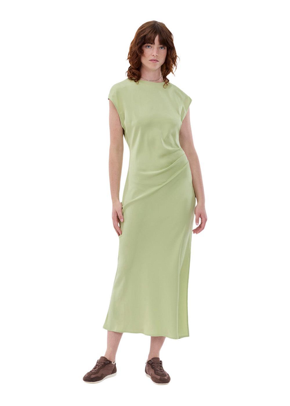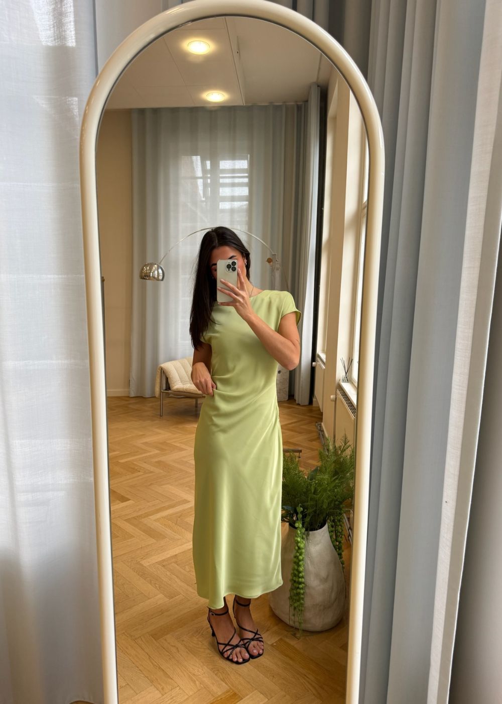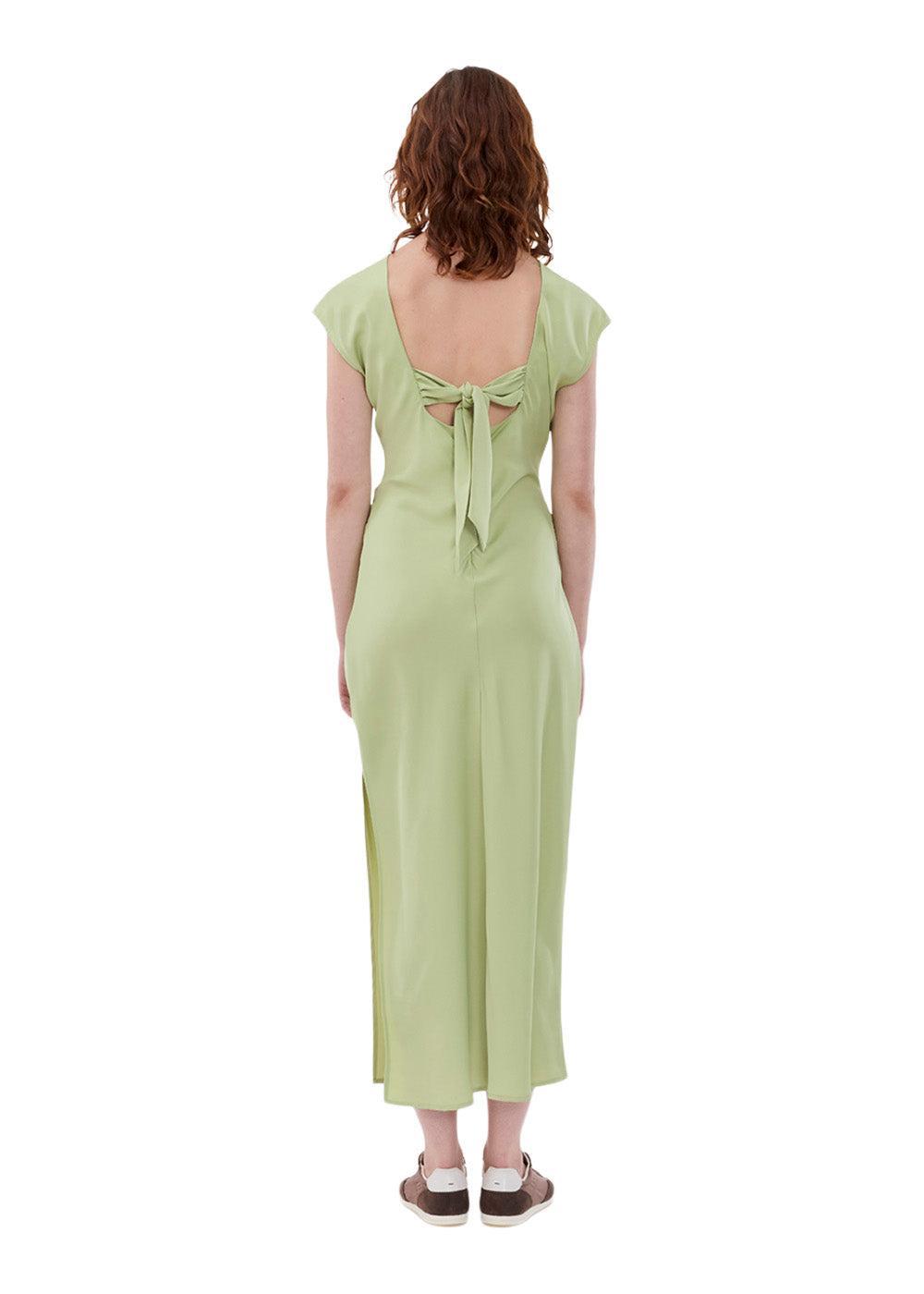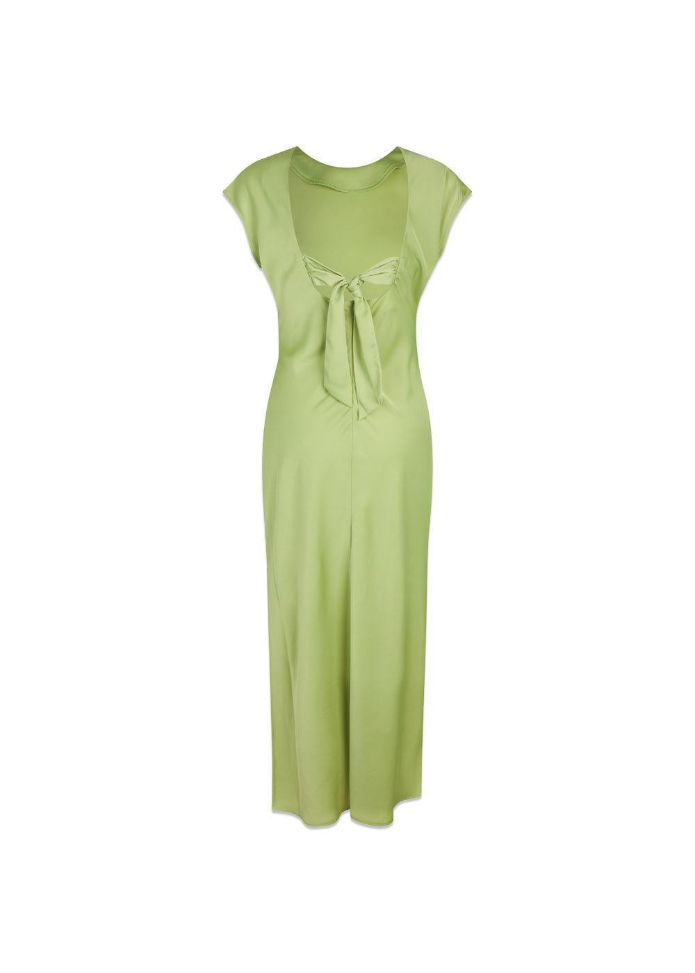 Unitymd er en elegant midikjole fra Modström i en smuk, lysegrøn farve. Kjolen har en enkel forside med rund hals og en flot, åben ryg med et dekorativt bindebånd, der giver et raffineret udtryk.