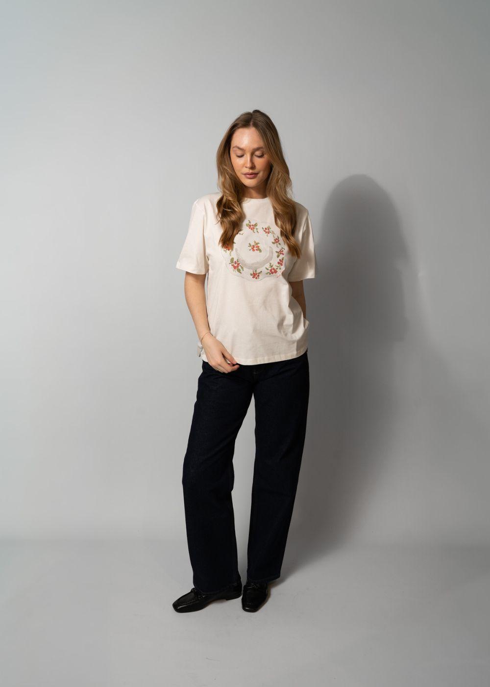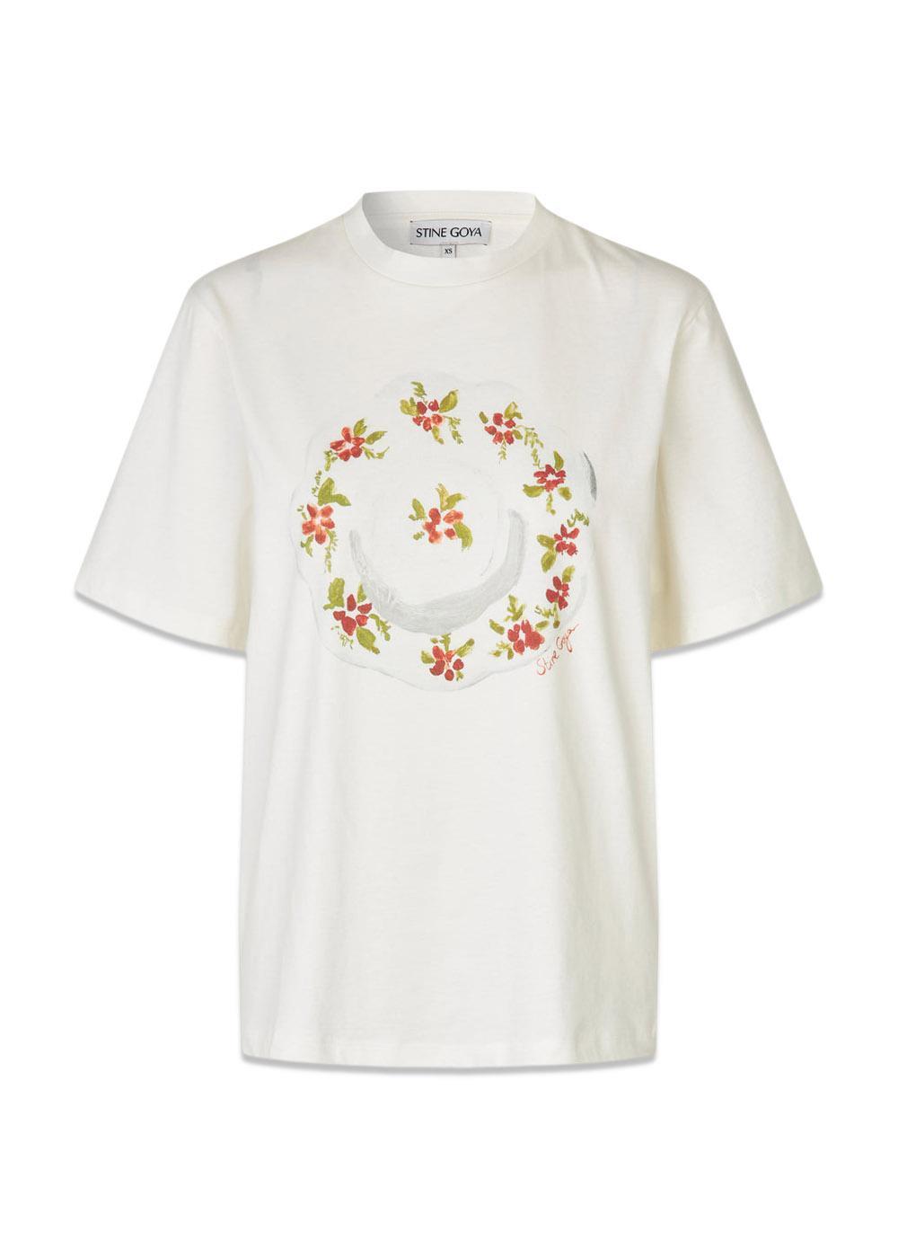 Denne klassiske T-shirt fra Stine Goya er designet i en cremehvid farve med et unikt, blomstret print. Den har en moderne boxy pasform, der giver et afslappet og stilfuldt udtryk til hverdagsbrug.