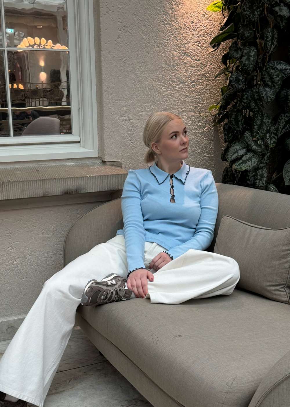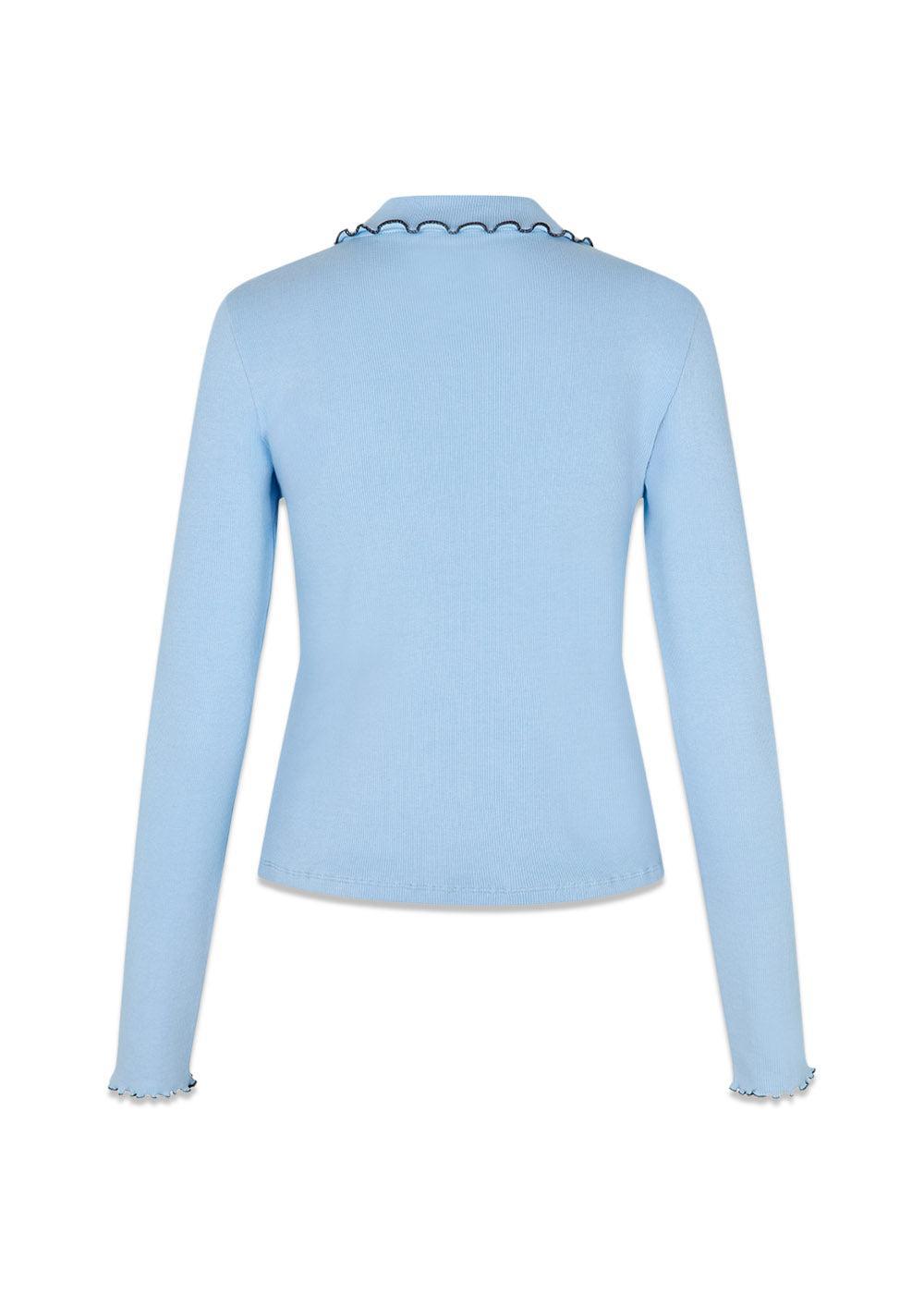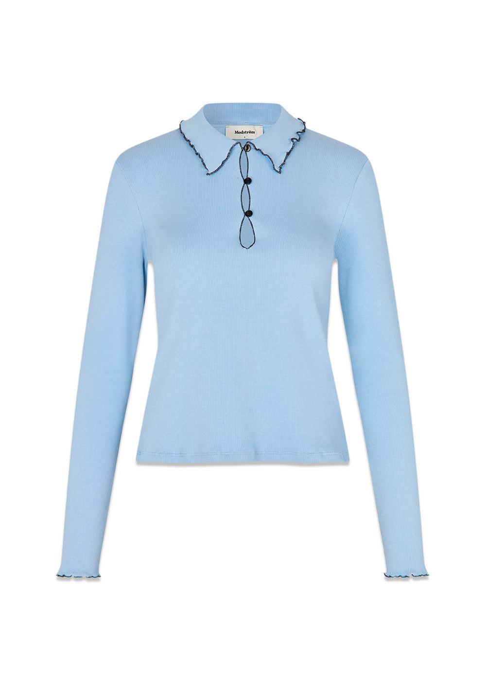 Urdmd Ls Top fra Modström er en langærmet bluse i en fin lyseblå farve. Den har en polokrave og er designet med kontrastbroderi og unikke knapper, der giver et Y2K-inspireret look.