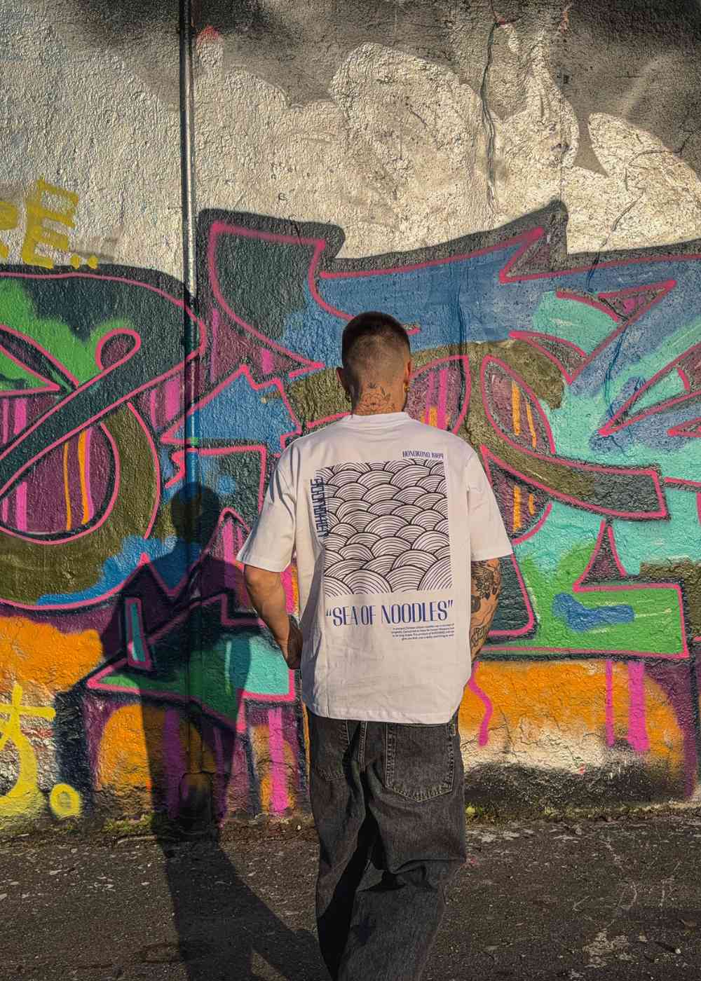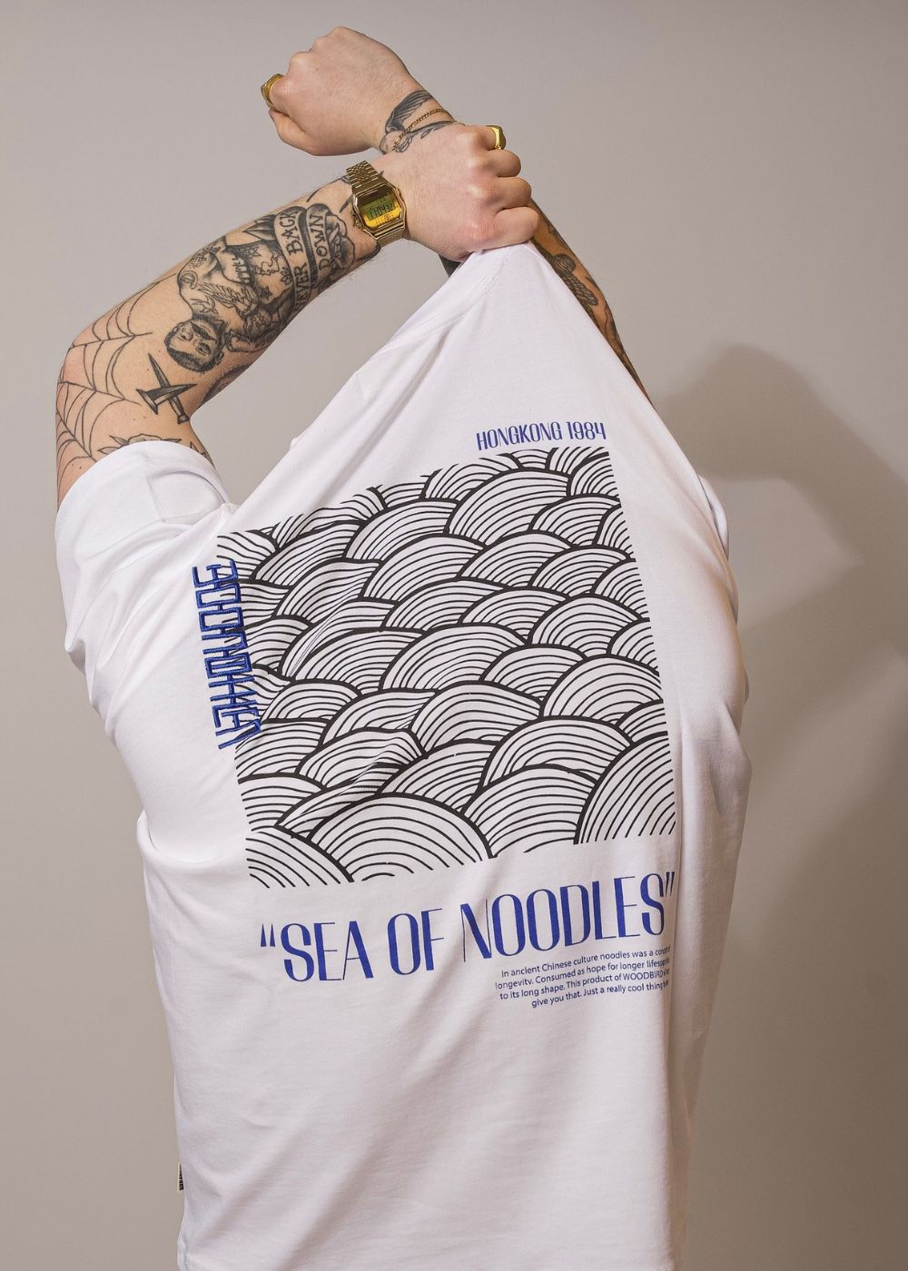 - Stort grafisk 'Sea of Noodles' print på ryggen.