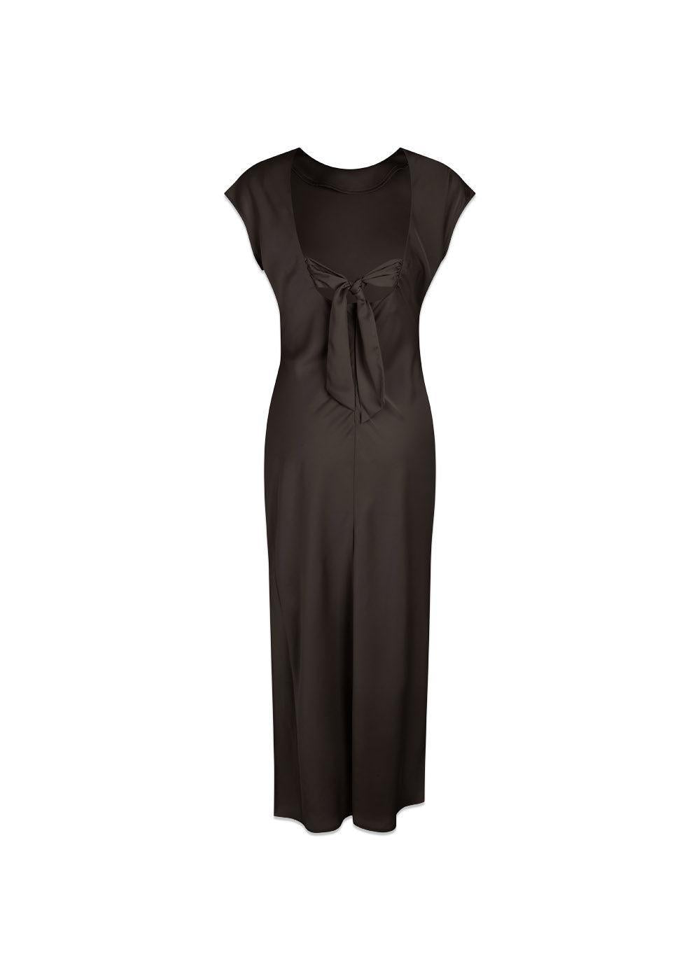 Unitymd er en elegant, formel kjole fra Modström i en dyb brun nuance med en glansfuld finish. Den har en smuk drapering i siden og en iøjnefaldende åben ryg med sløjfedetalje.