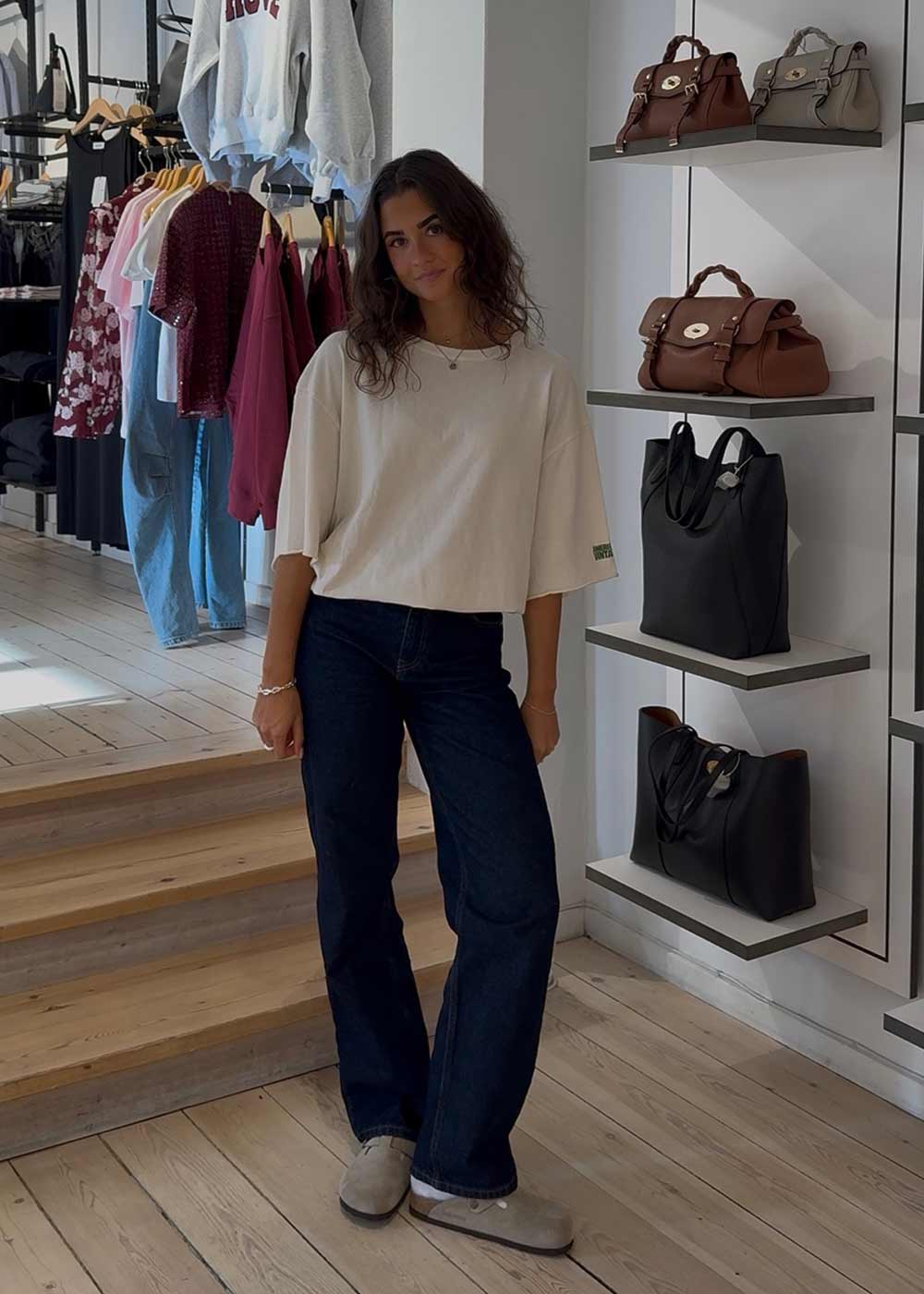 Oplev komfort og stil med denne boxy, cropped T-shirt i hvid og creme. Perfekt til både hverdag og afslapning derhjemme.