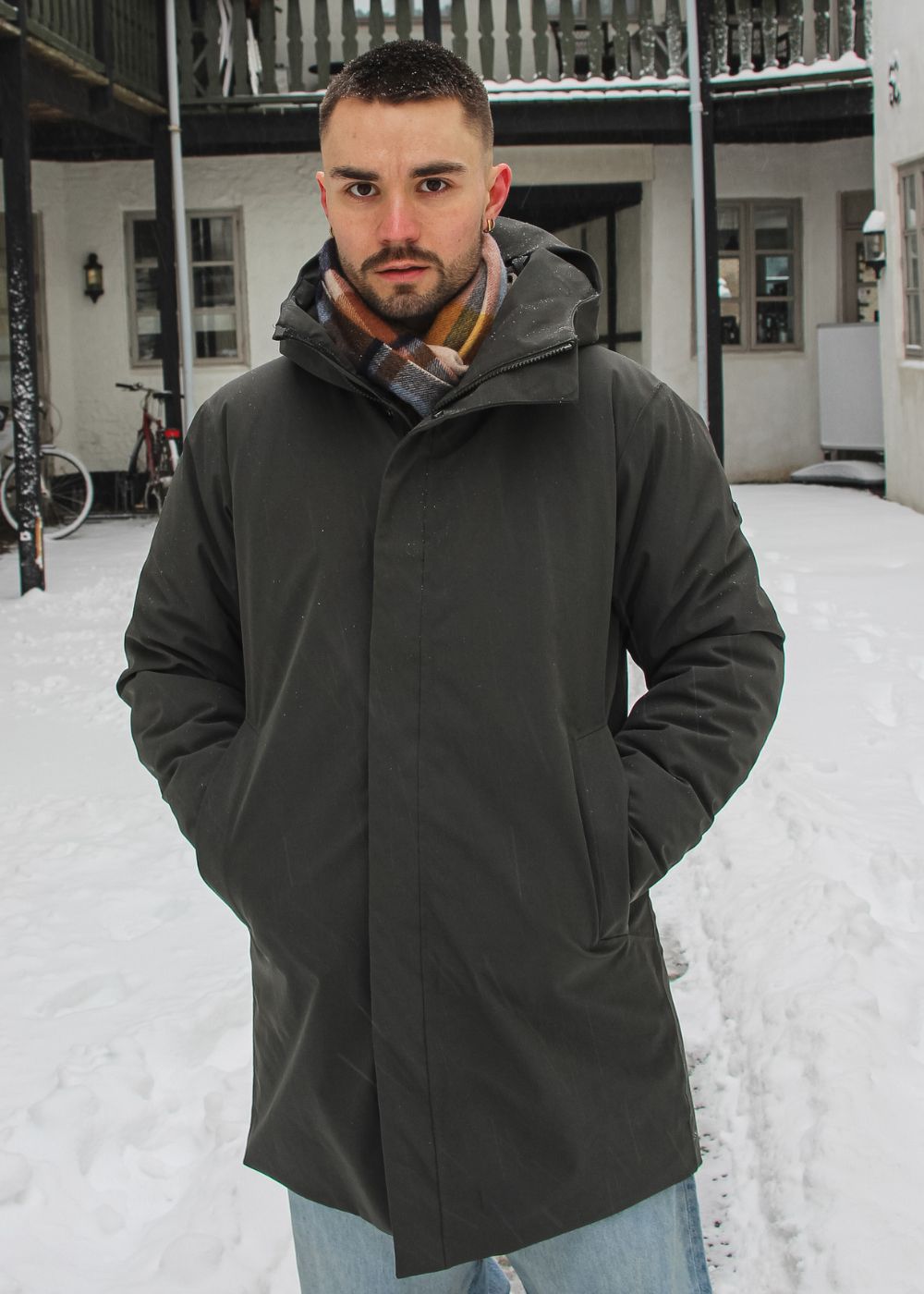 Oplev Loft II fra Scandinavian Edition, en klassisk knælang jakke i en dyb, mørkegrøn farve. Det ensfarvede design med fast hætte og lynlåslukning giver et stilrent og funktionelt udtryk til hverdagsbrug.