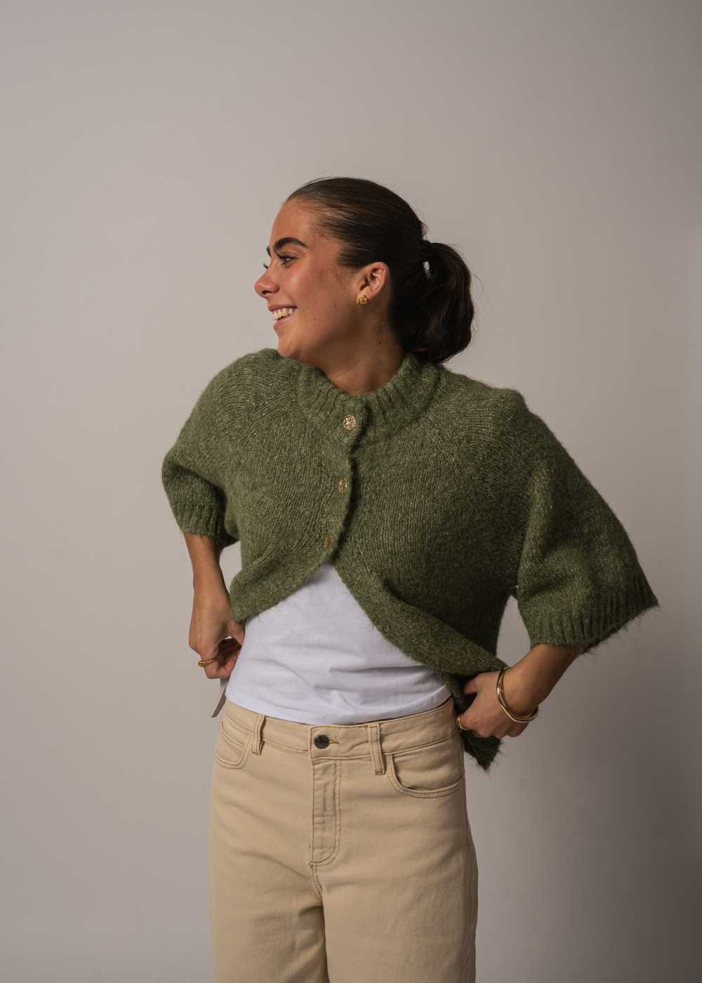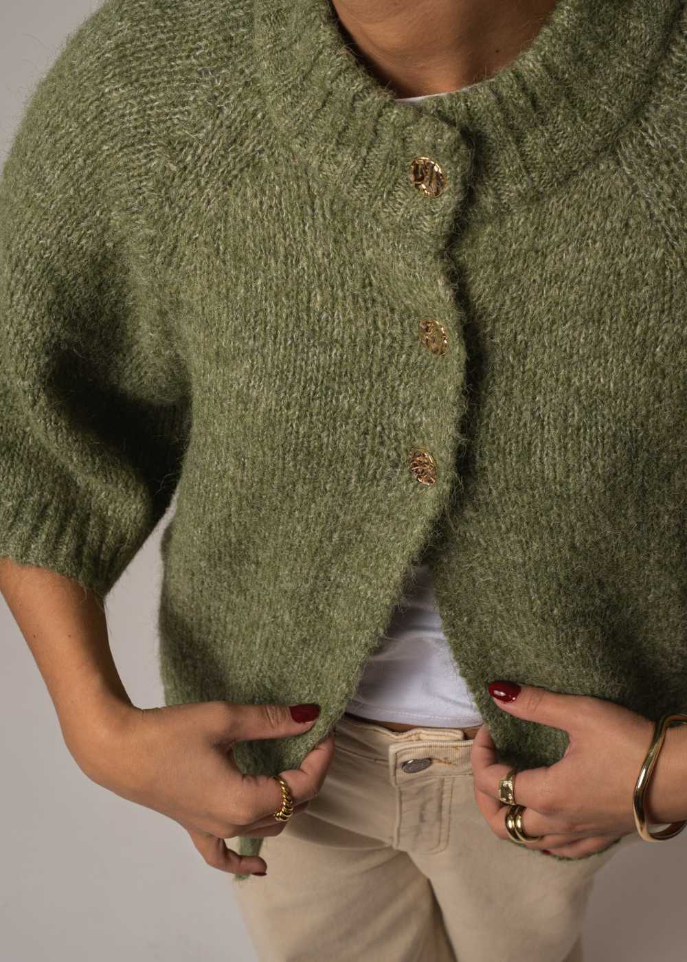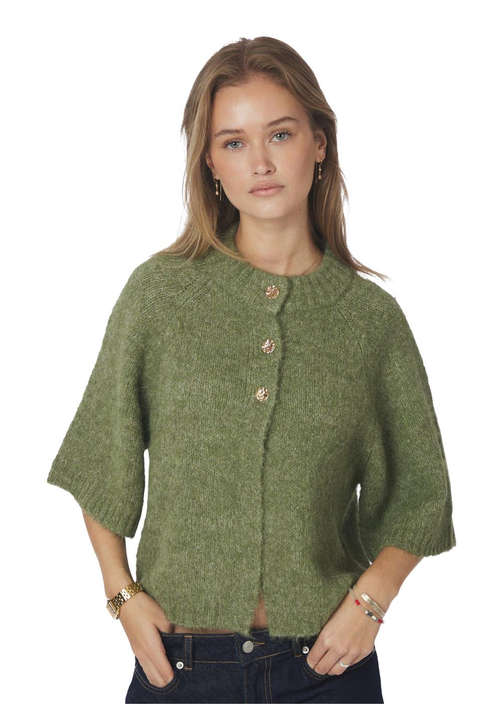 Benuta Fluffy Knit Cardigan er en charmerende strik i retro-stil. Den kommer i en smuk, støvet grøn farve og har et lækkert, fluffy udtryk. De smukke kontrastknapper foran fuldender det unikke design.