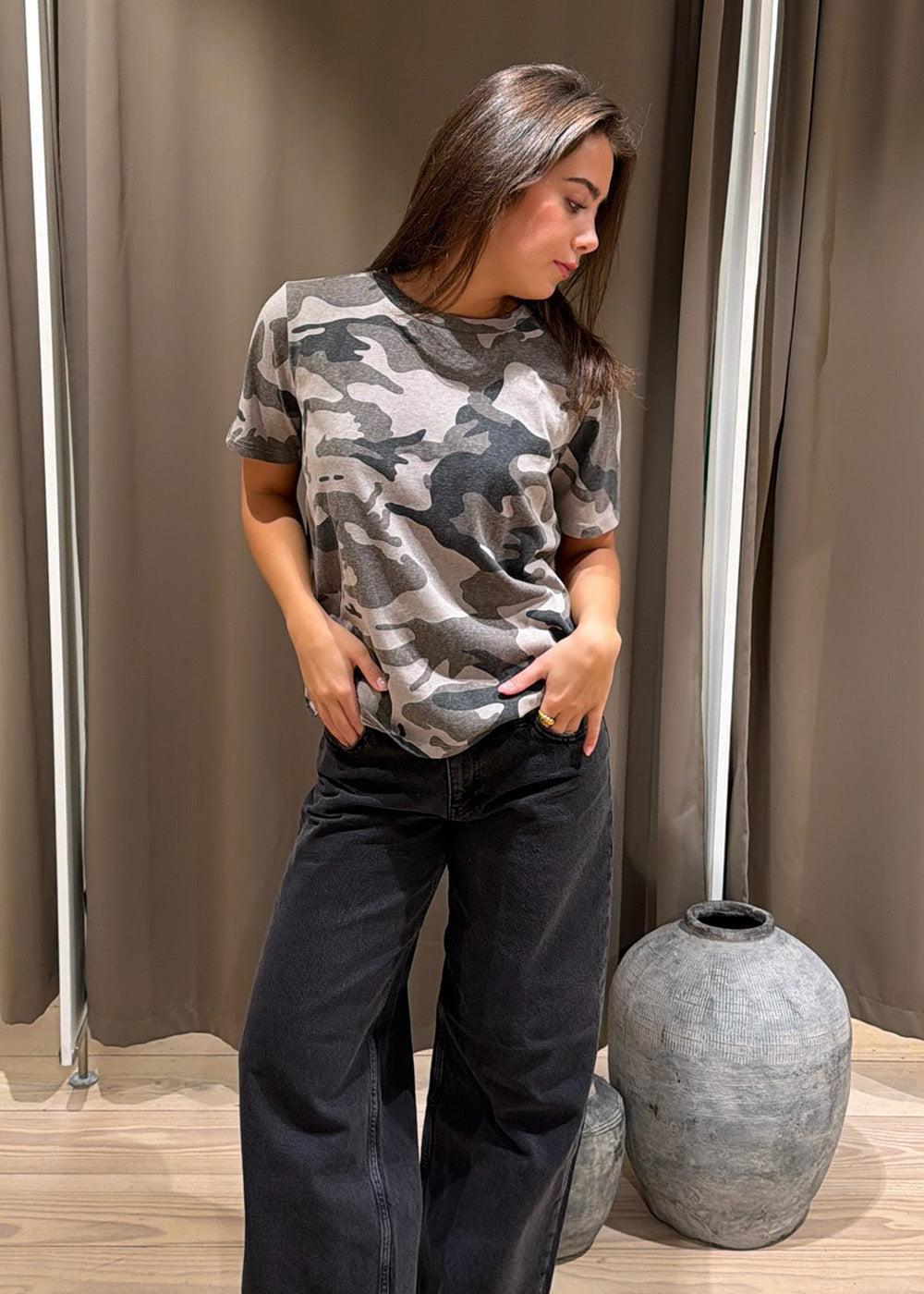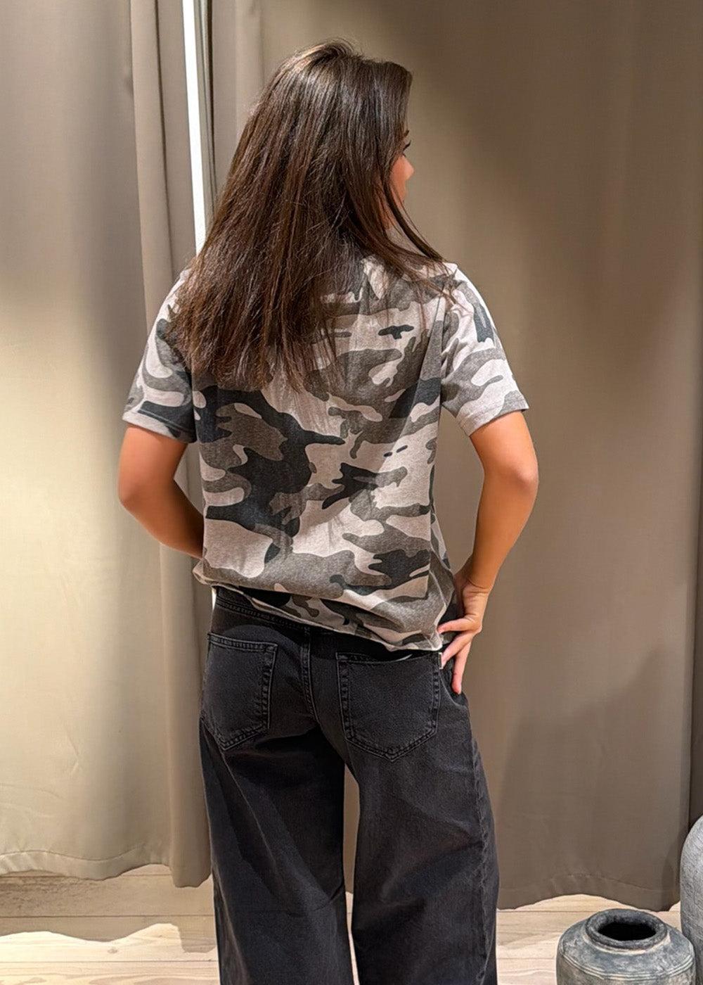 Opgrader din garderobe med Malin Mili Tee fra Neo Noir. Denne T-shirt har et iøjnefaldende camouflageprint i multifarvede grå nuancer, der giver et råt og moderne streetwear-udtryk, perfekt til et afslappet hverdagslook.