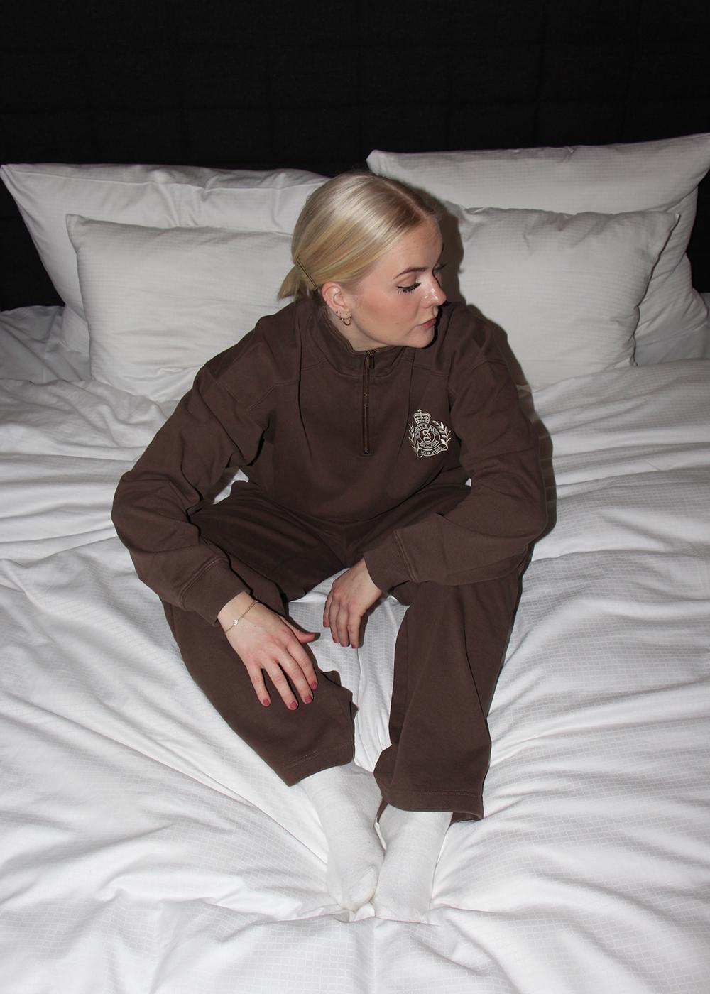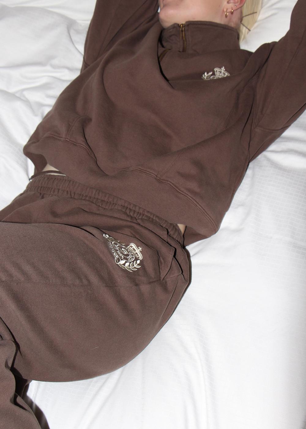 NY Crest Embroidered Quarter Zip fra Sporty & Rich er en sporty sweatshirt i en dyb chokoladebrun farve. Den har en cropped, boxy pasform, 1/4 lynlås og et broderet logo på brystet.