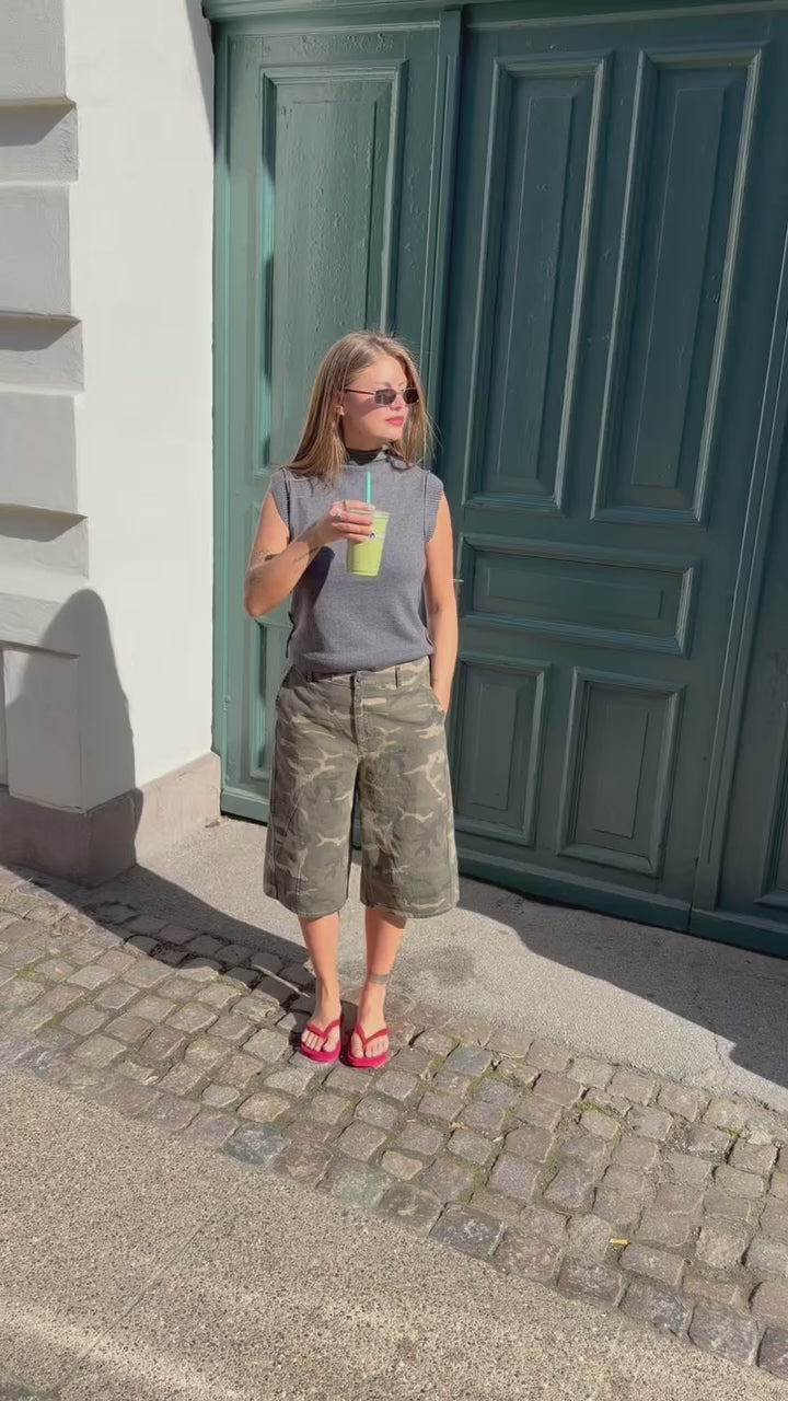 Athenemd long shorts fra Modström er knælange shorts i et løst snit med camouflage-mønster i grønne og brune nuancer. Designet har et streetwear-udtryk med synlige snitlinjer, knaplukning og lynlås.