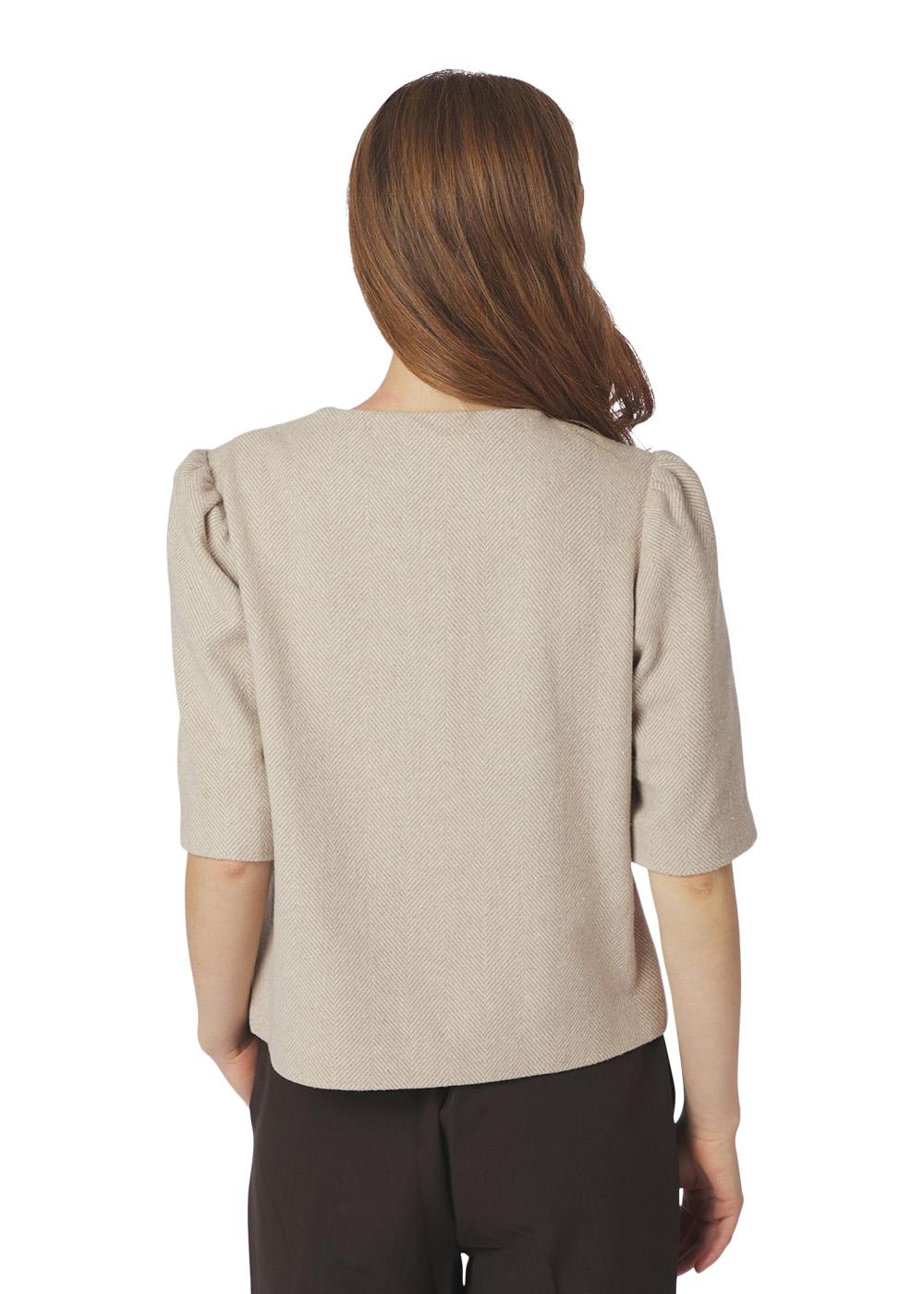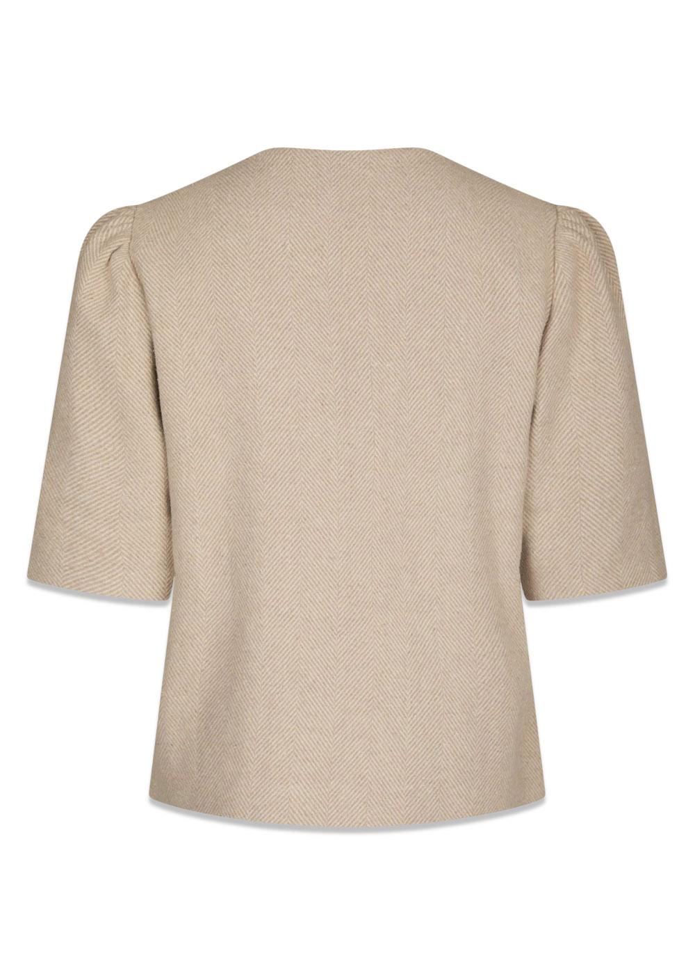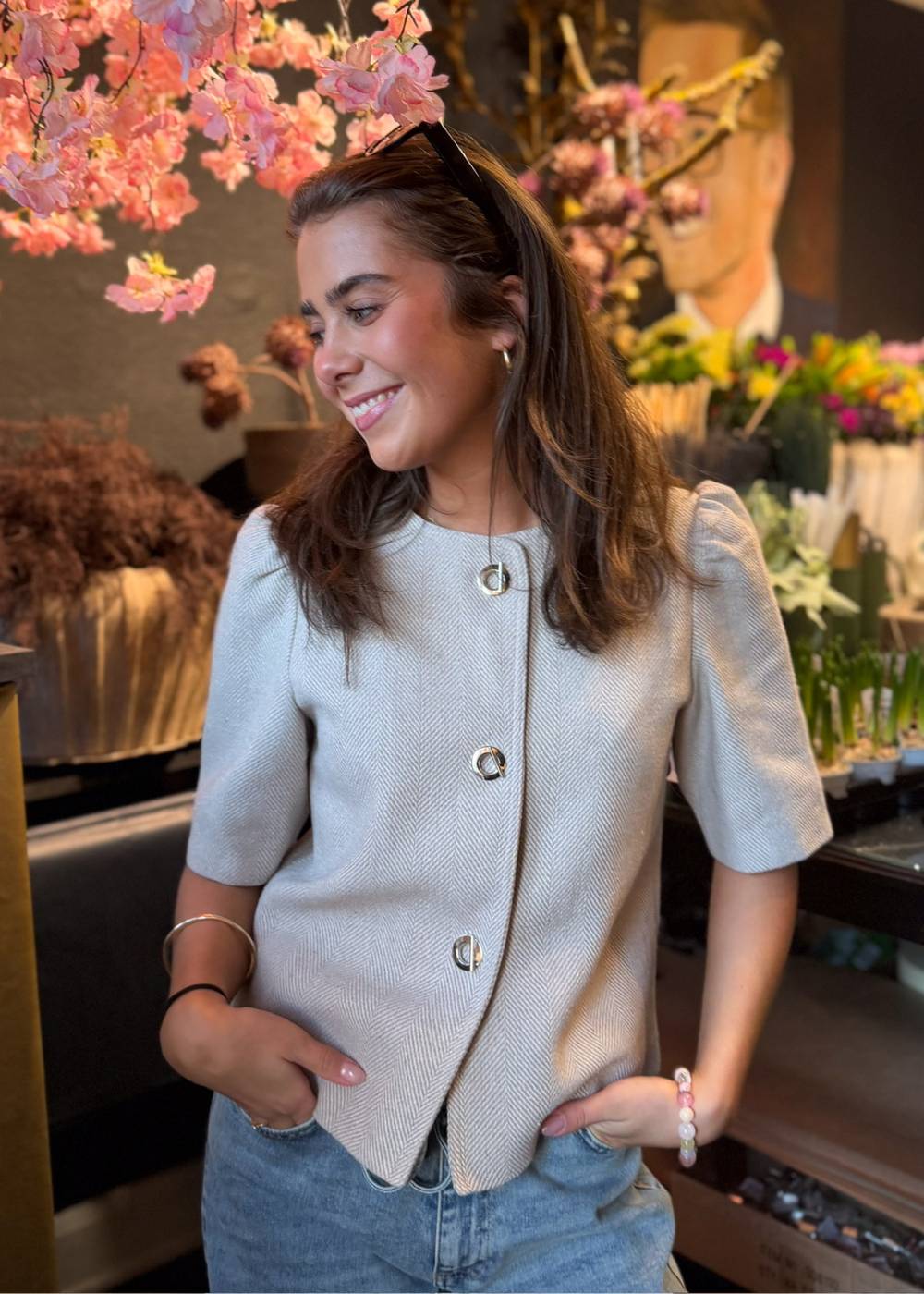 Elegant blazer fra Neo Noir i en smuk sildebenskvalitet. Jakken har en kort, boxy pasform med 3/4-ærmer, skulderpuder og dekorative kontrastknapper, der giver et formelt og stilfuldt udtryk i en fin sandfarve.
