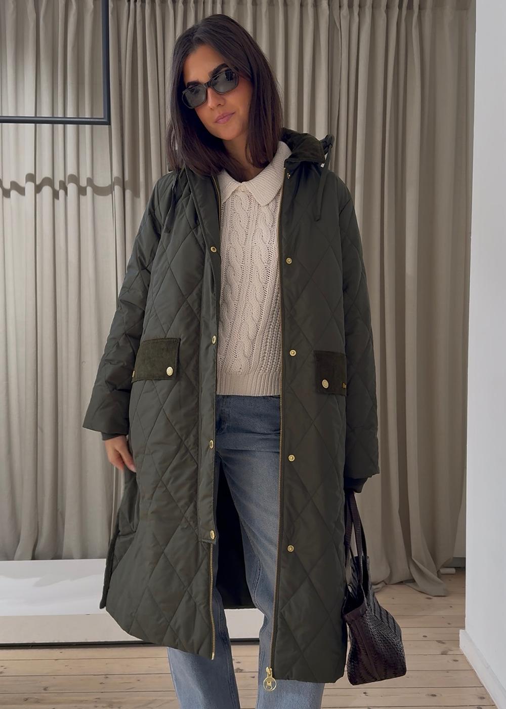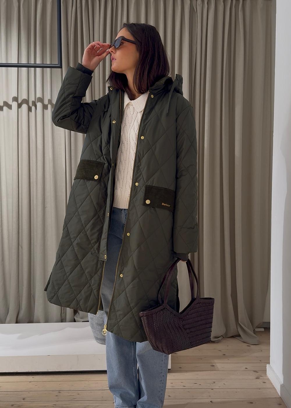 Barbour Meredith Quilted Jacket er en lang, quiltet frakke i en klassisk olivengrøn farve. Den kombinerer et tidløst design med praktiske detaljer som en fast hætte og et karakteristisk tartanfor, perfekt til hverdagsbrug.