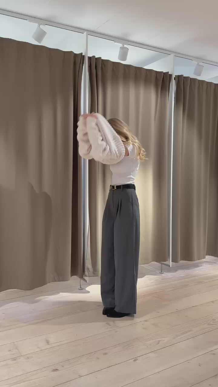 Leone Mini Polo er en klassisk kabelstrikket sweater i en smuk cremefarve. Den har en elegant polokrave og en moderne, cropped pasform, der giver et tidløst og stilfuldt udtryk til din garderobe.