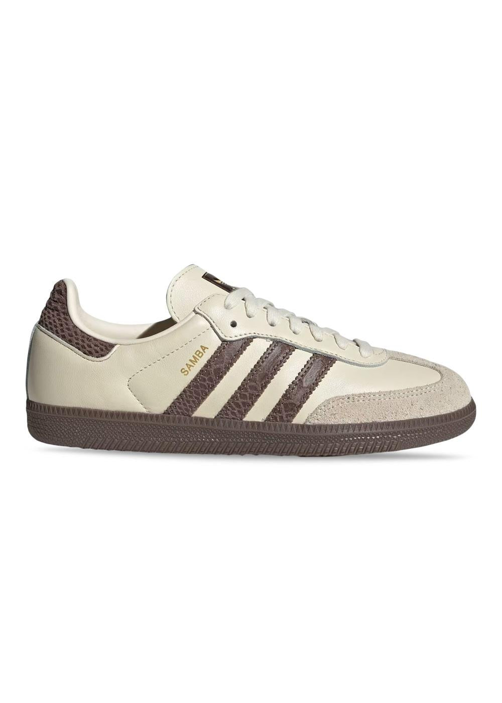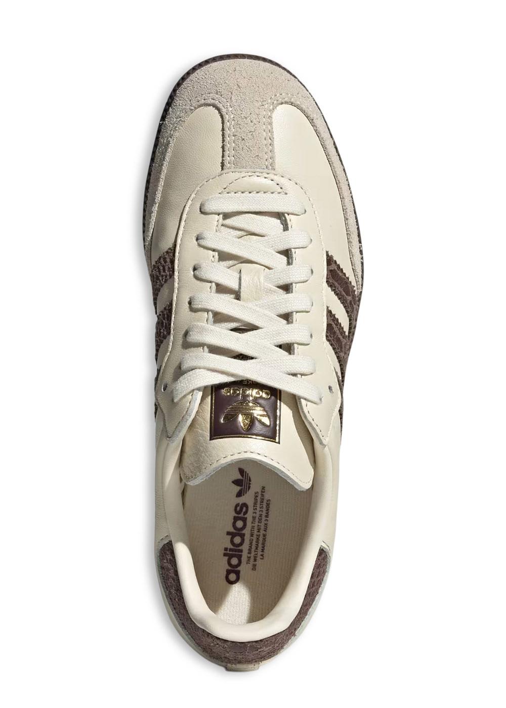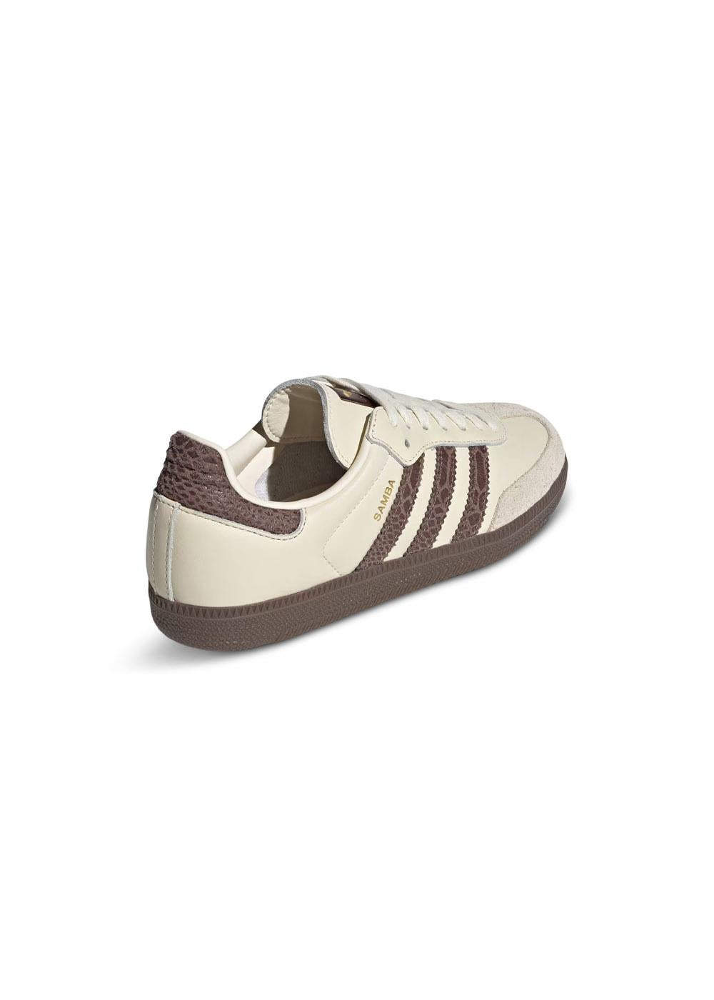 Opdag den ikoniske Adidas Originals Samba OG W sneaker i en elegant cremefarvet nuance. Denne version er opdateret med unikke kontrastdetaljer i dyreprint på de klassiske striber, som giver et moderne og sofistikeret twist.