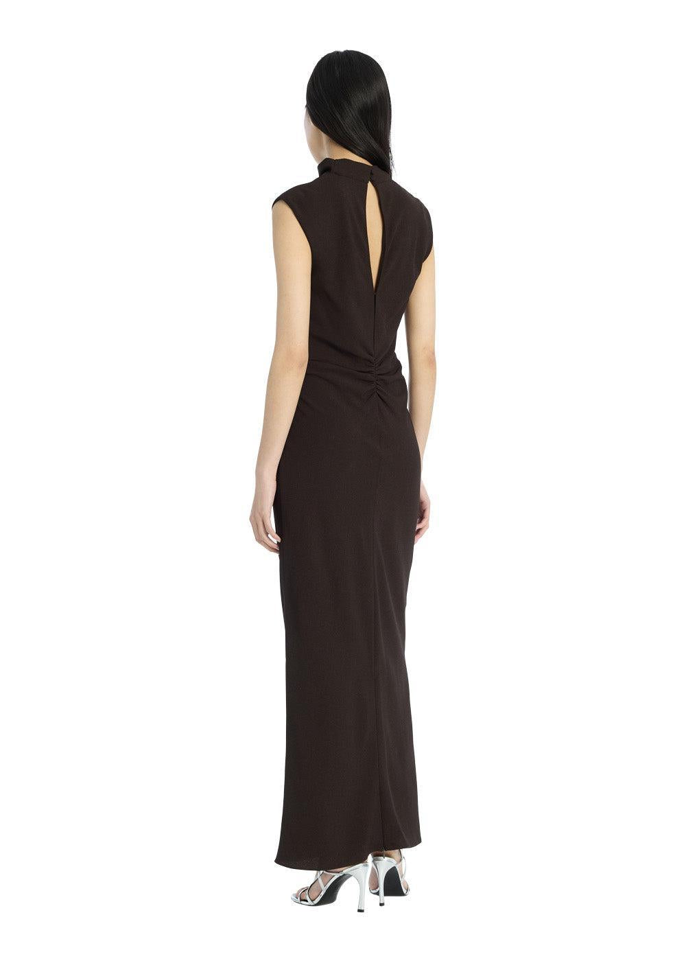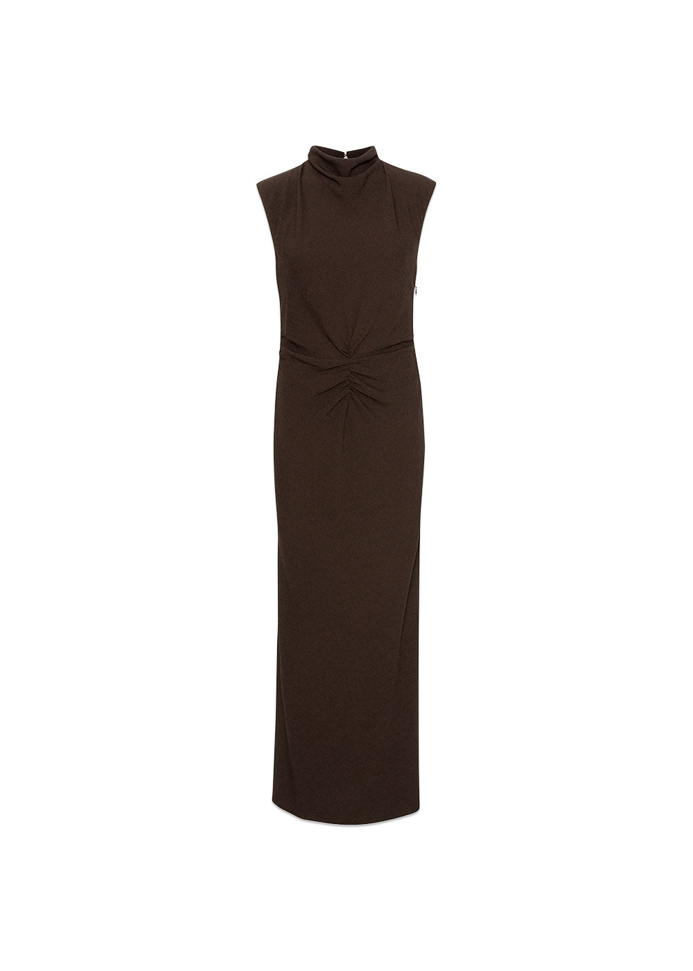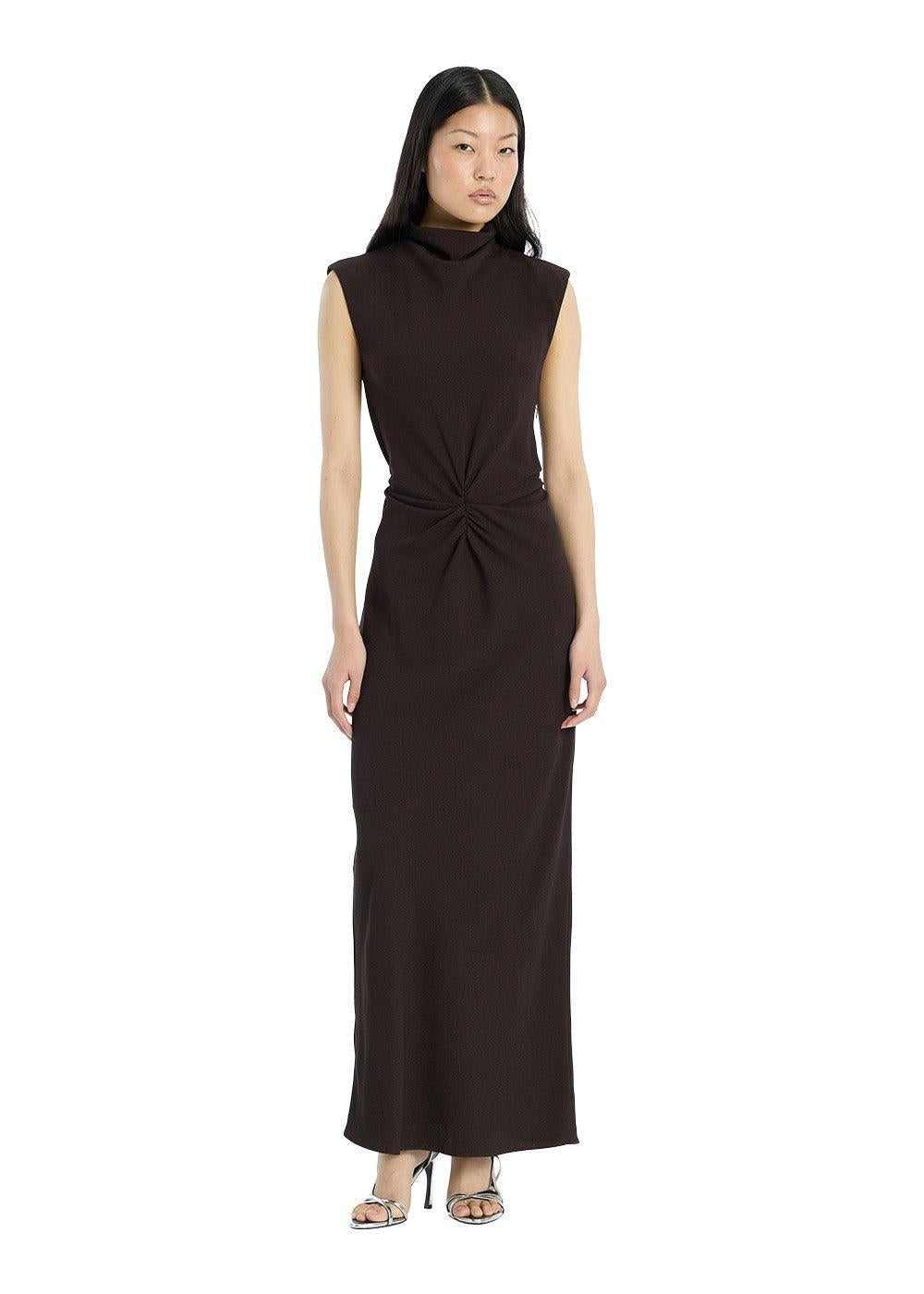 Elegant midikjole fra Rotate i en dyb, ensfarvet brun. Kjolen har en slank pasform med høj hals og smukke rynkedetaljer i taljen, der skaber en flatterende silhuet til formelle anledninger.