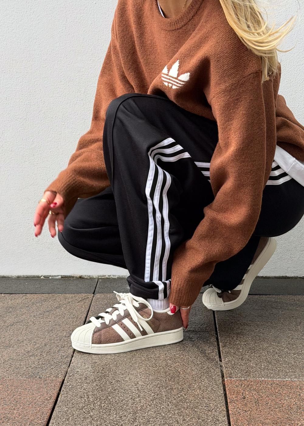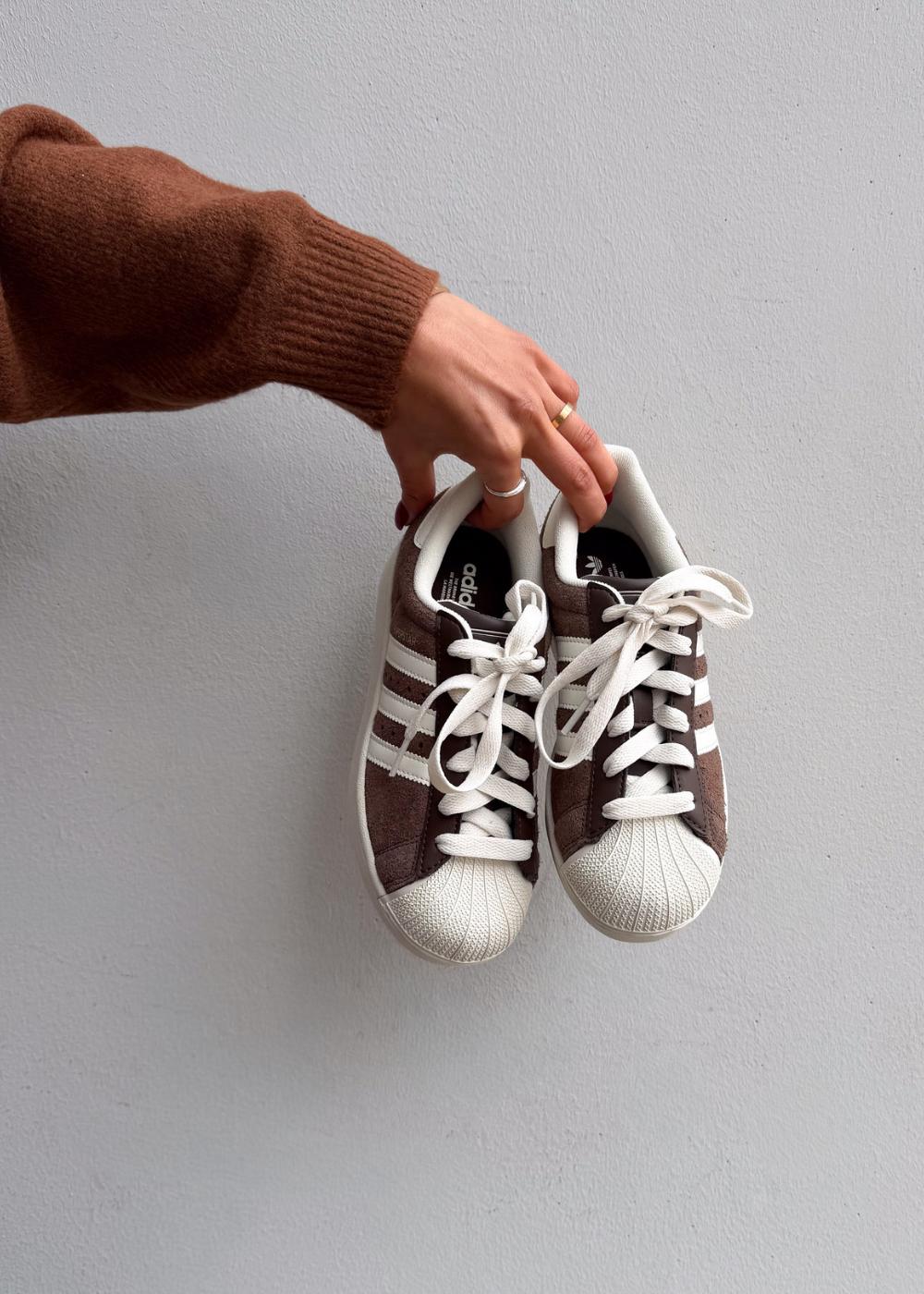 Adidas Superstar II W er en klassisk low-top sneaker i farven Shadow Brown. Skoen har den karakteristiske shell toe i gummi og overdel i glat læder med kontrasterende striber og hælkappe.