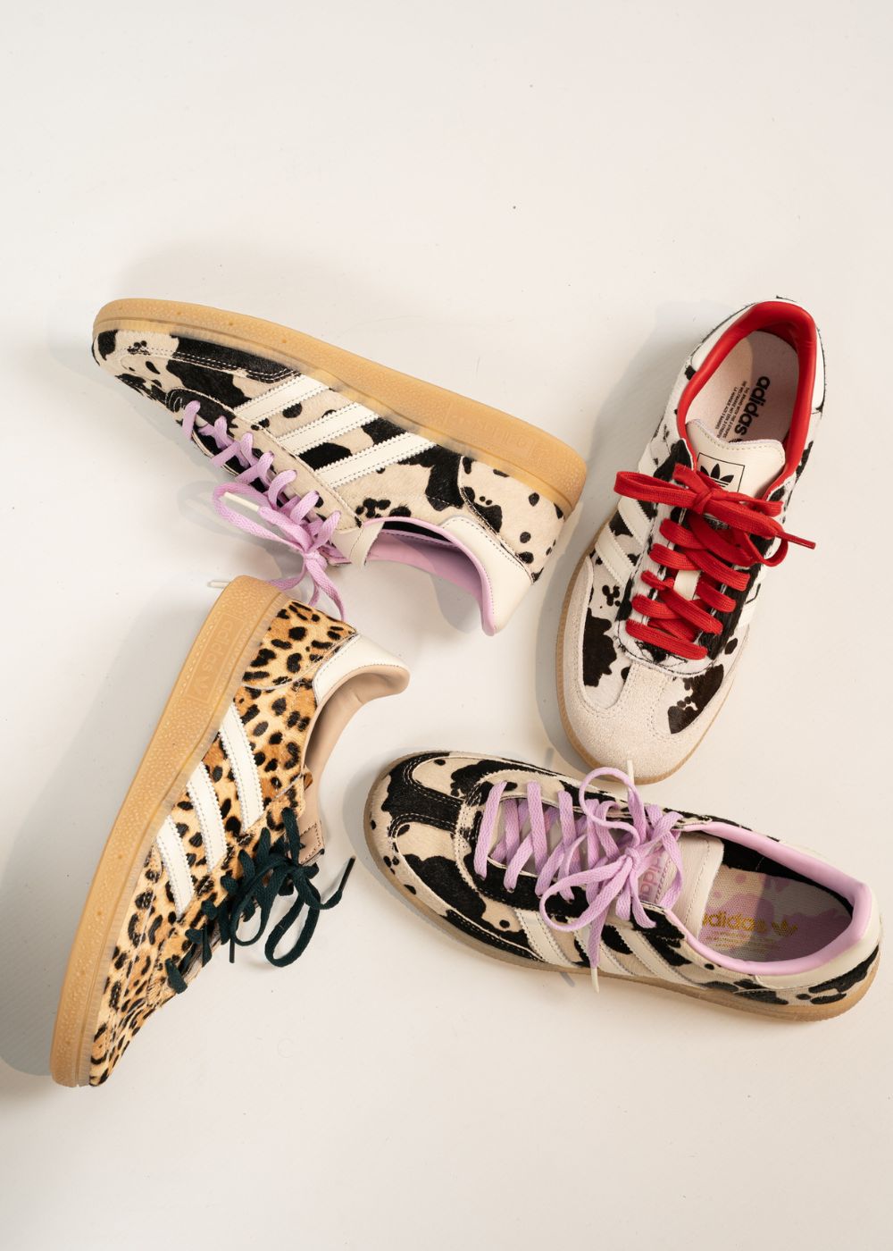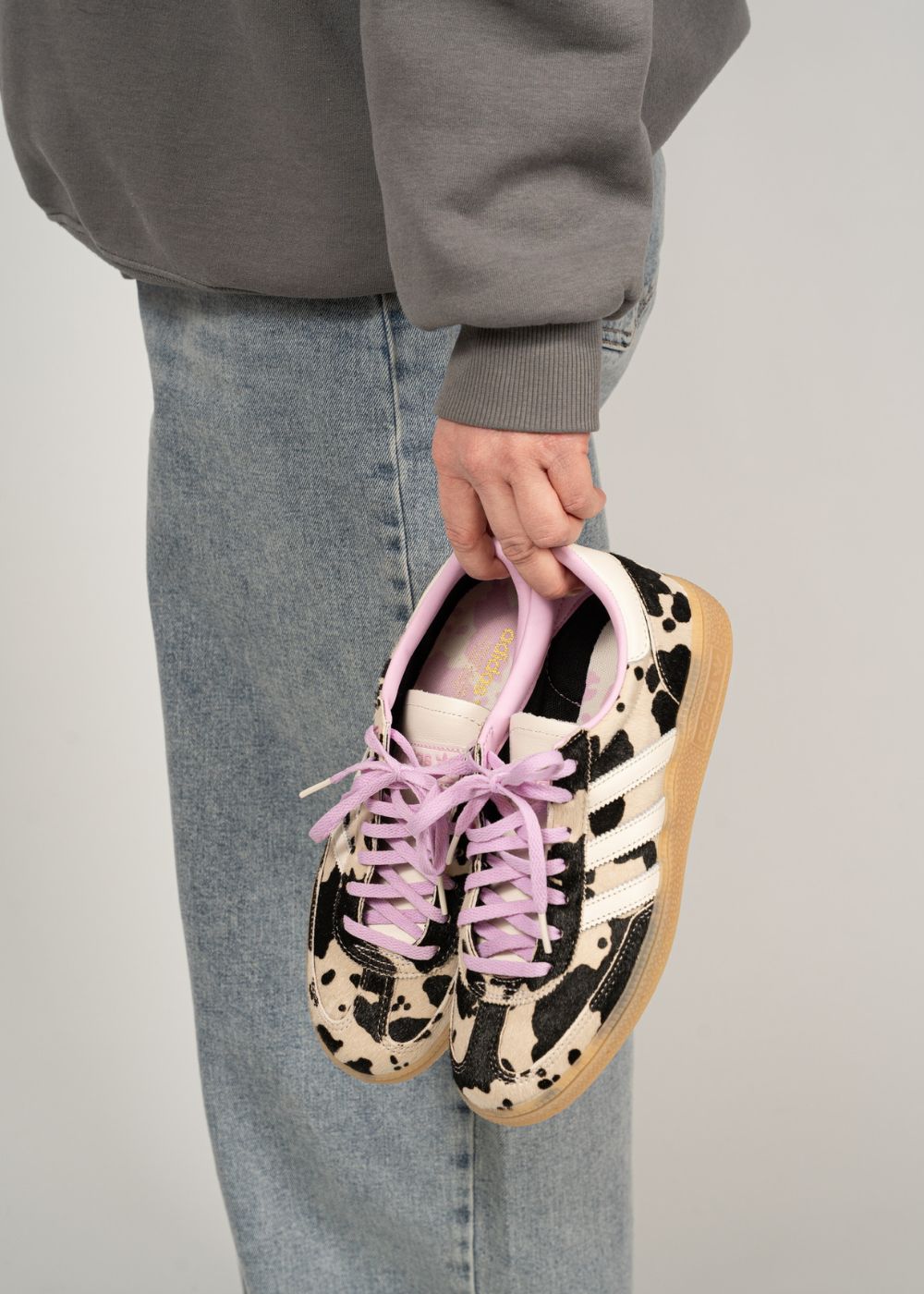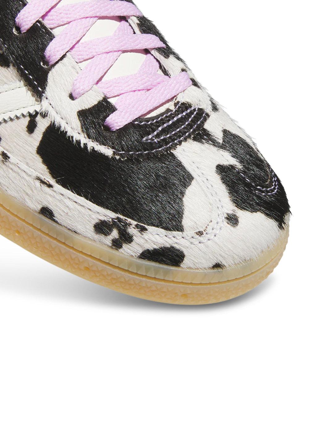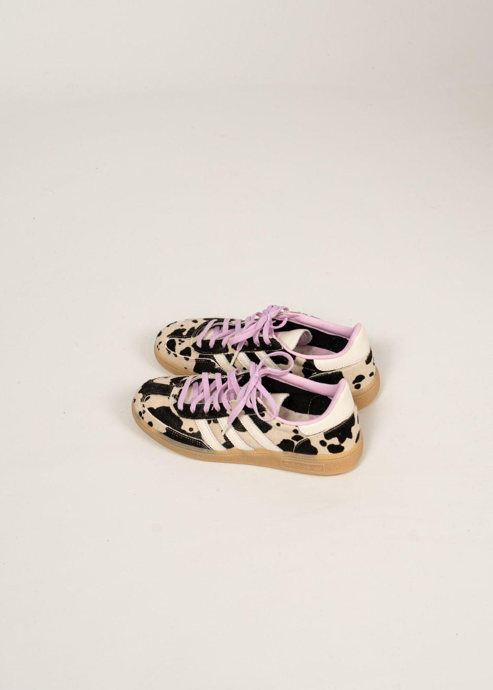 Adidas Originals Handball Spezial W er en flad sneaker med et markant dyreprint i sort og creme. Skoen har lilla snørebånd og detaljer, der kombineres med en klassisk brun gummisål.
