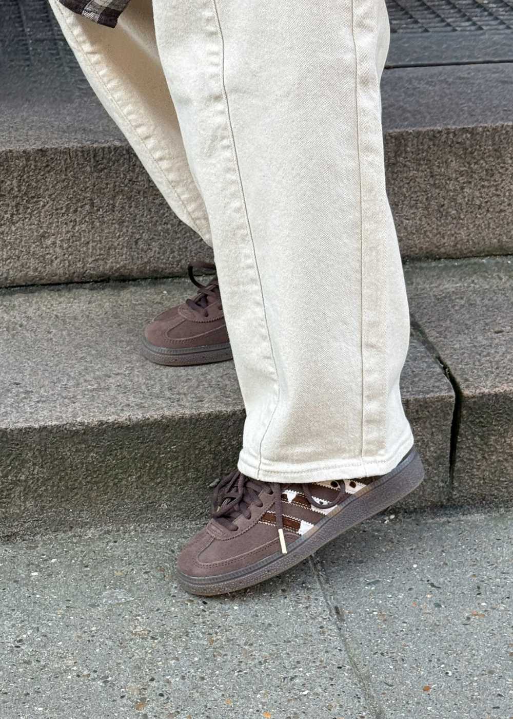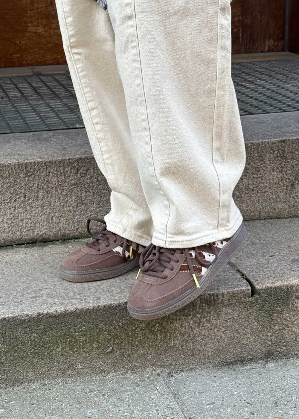 HANDBALL SPEZIAL W er en klassisk sneaker i brun ruskind med cremehvide detaljer og gummisål. Skoen har et markant mønster på de tre striber og hælkappen samt en flad profil.