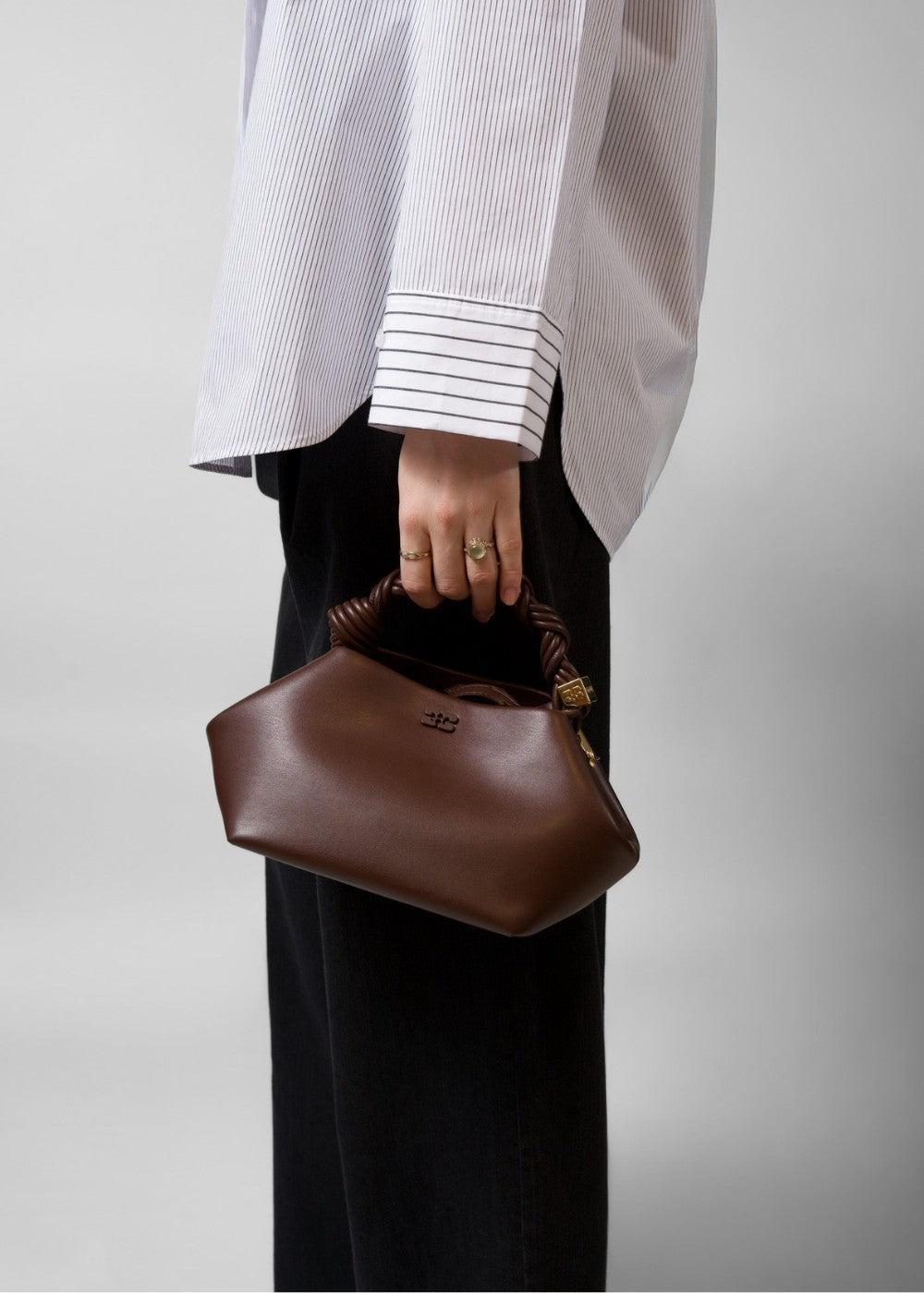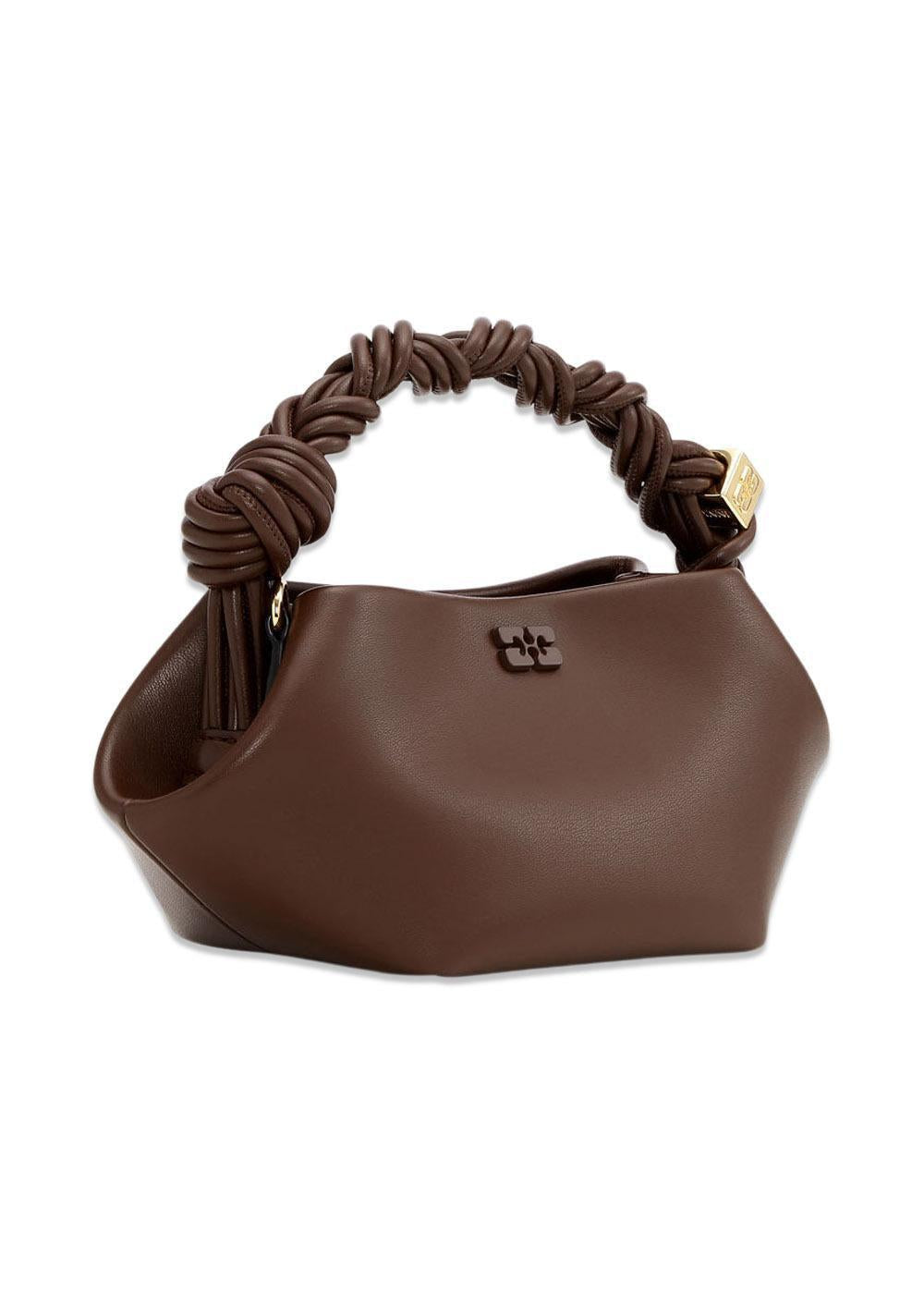 Ganni Bou Bag Mini er en stilfuld taske i en dyb chokoladebrun farve. Den har en unik sekskantet form, et flettet håndtag og et diskret Ganni-logo, der giver et moderne og elegant udtryk.