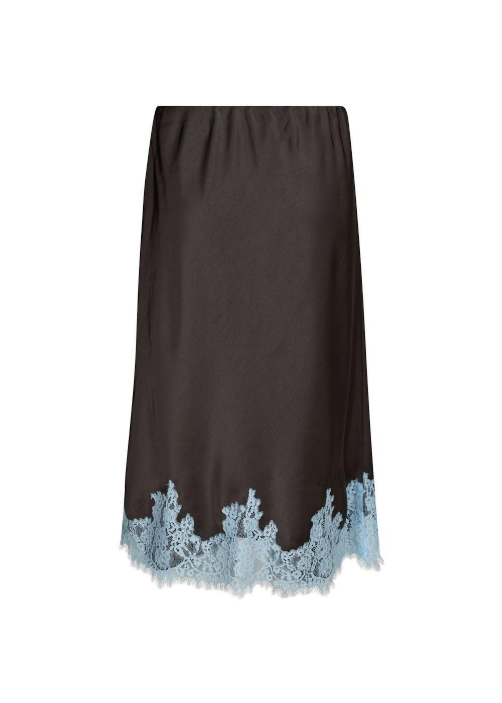 Lang nederdel med elastik indvendig i taljen. Nederdelen er skåret på skrå og har en fin blonde detalje ved bunden af nederdelen. Modellen er 176 cm og bærer en størrelse 36