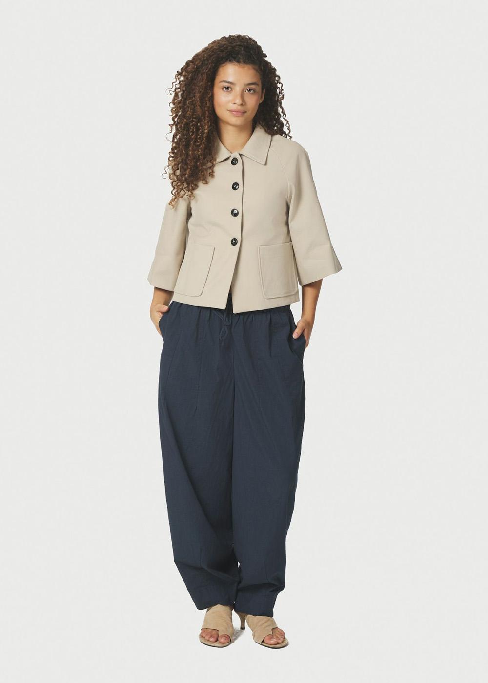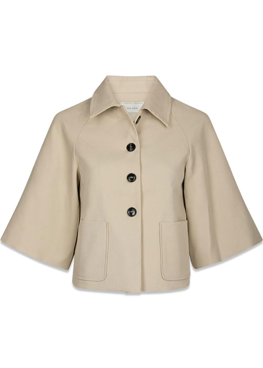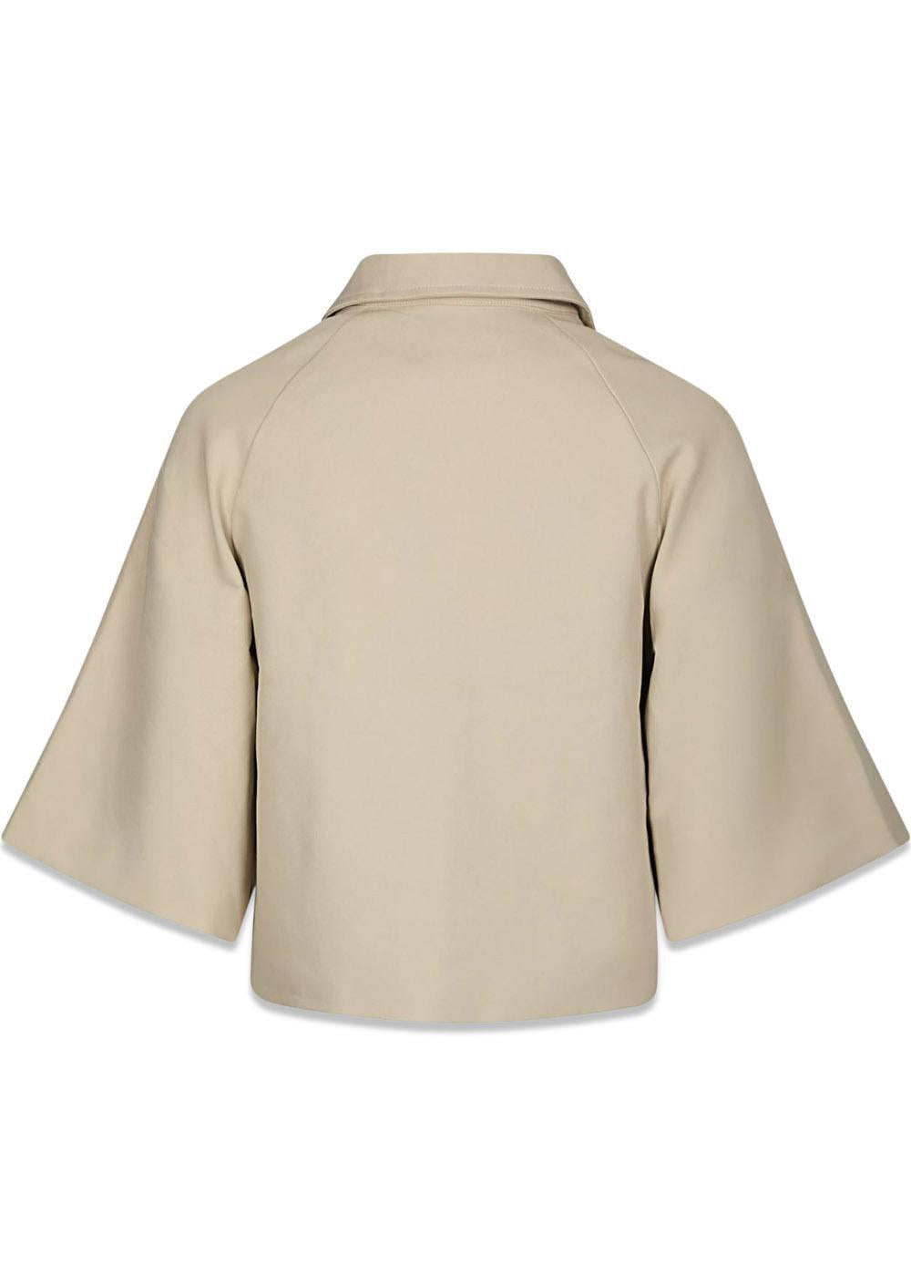 Kort jakke med korte brede ærmer i trench kvalitet. Jakken har krave og knapper langs fronten. Modellen er 176 cm høj og er iført en str. 36.