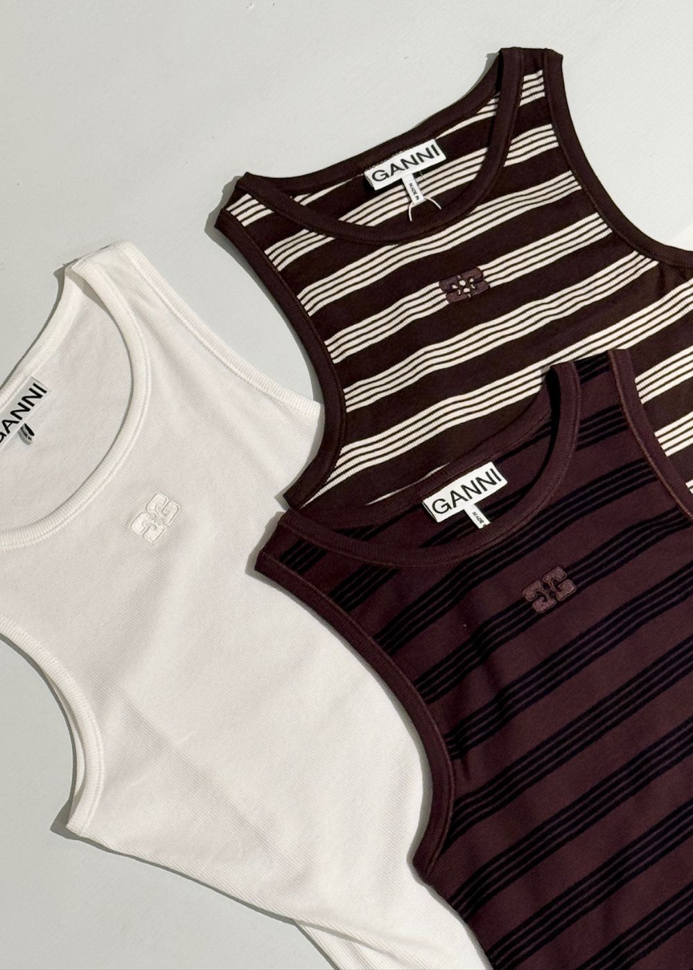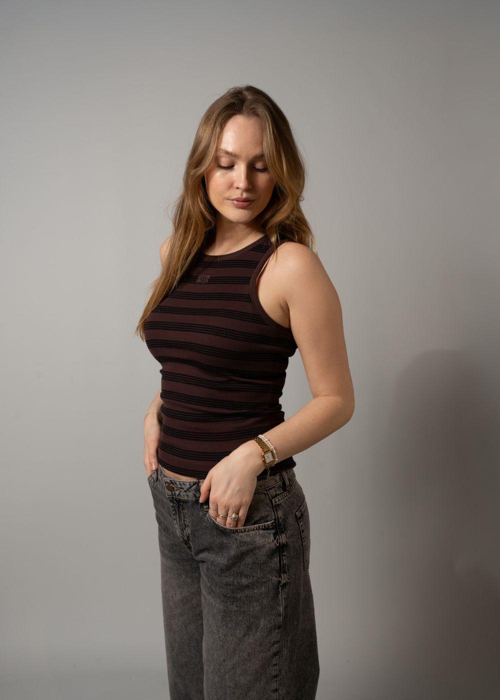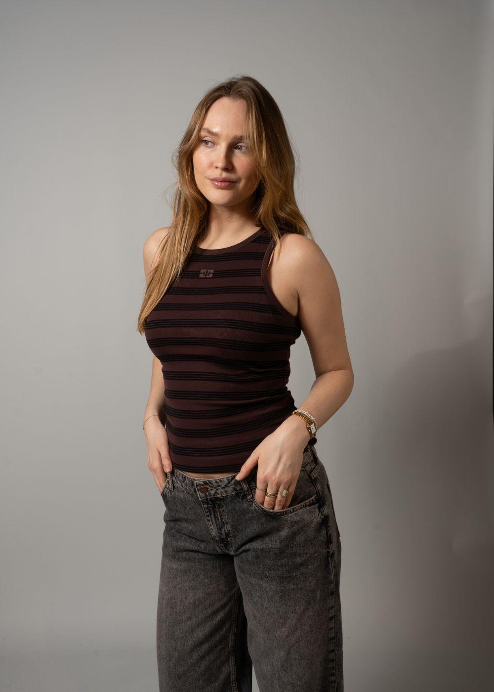 Denne stribede tanktop fra Ganni er lavet i en blød bomuldsrib. Toppen har en tætsiddende pasform og et broderet logo, der giver et diskret Y2K-inspireret udtryk i farven Chocolate Plum.