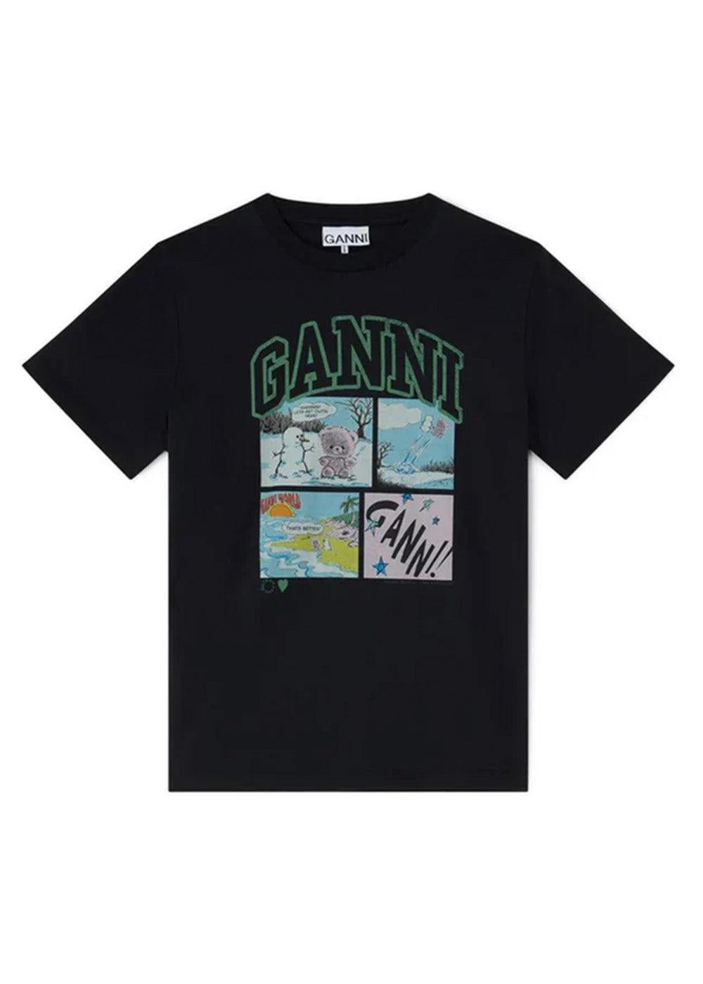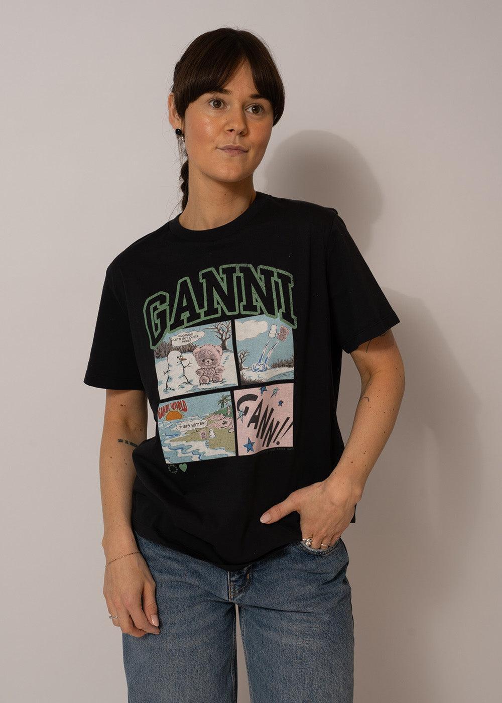 Opgrader din garderobe med denne sorte T-shirt fra Ganni. Den er fremstillet i blød bomuld og har et unikt, grafisk tegneserieprint, der tilføjer et legende og moderne udtryk til dit look.