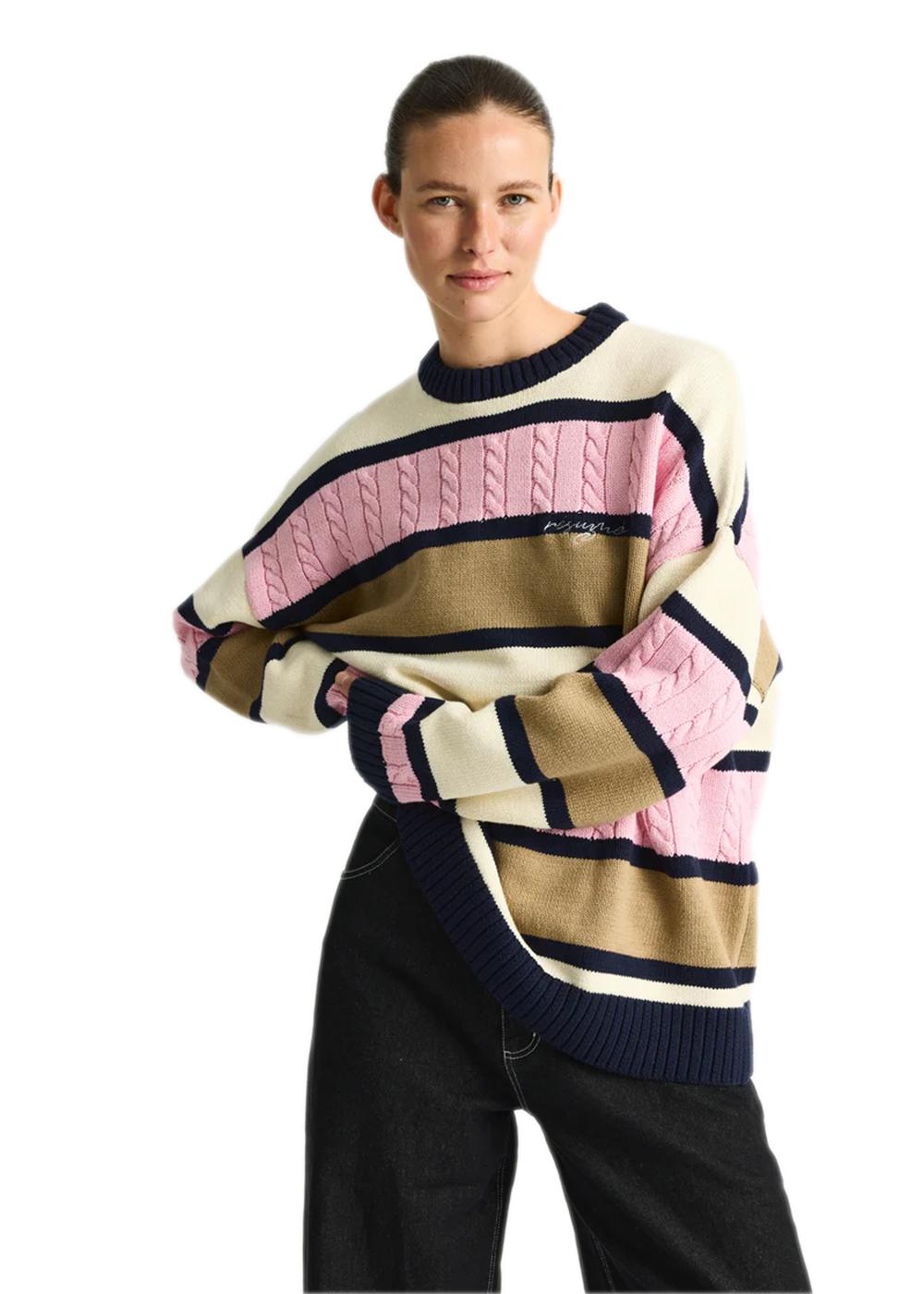 KarloRS Knit Pullover fra RÉSUMÉ er en klassisk striktrøje i et multifarvet, stribet design. Den har fine kabelstrik-detaljer og et diskret broderet logo på brystet, som tilføjer et unikt og stilfuldt præg.