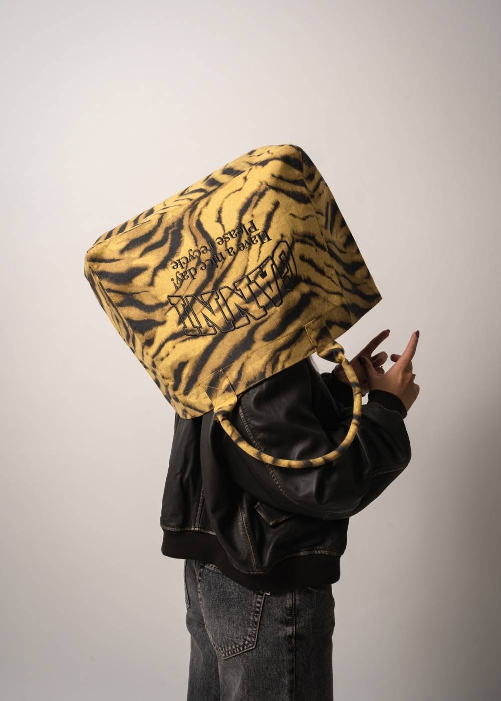 Denne Shopper XXL fra Ganni er en rummelig taske med et iøjnefaldende zebraprint i en khaki-farve. Den er designet med et stort Ganni-logo og en karakteristisk tekst på forsiden, der giver et unikt udtryk.