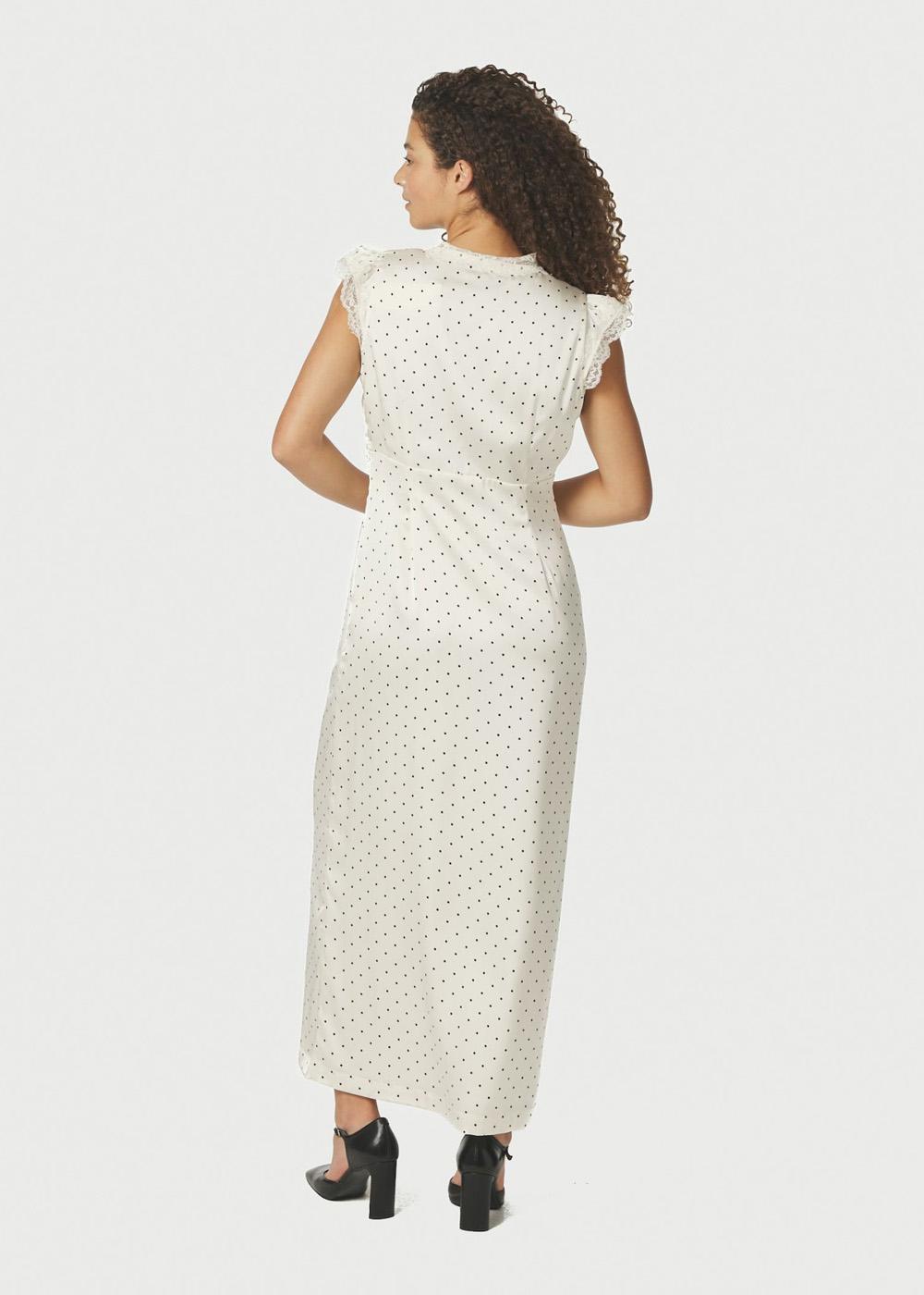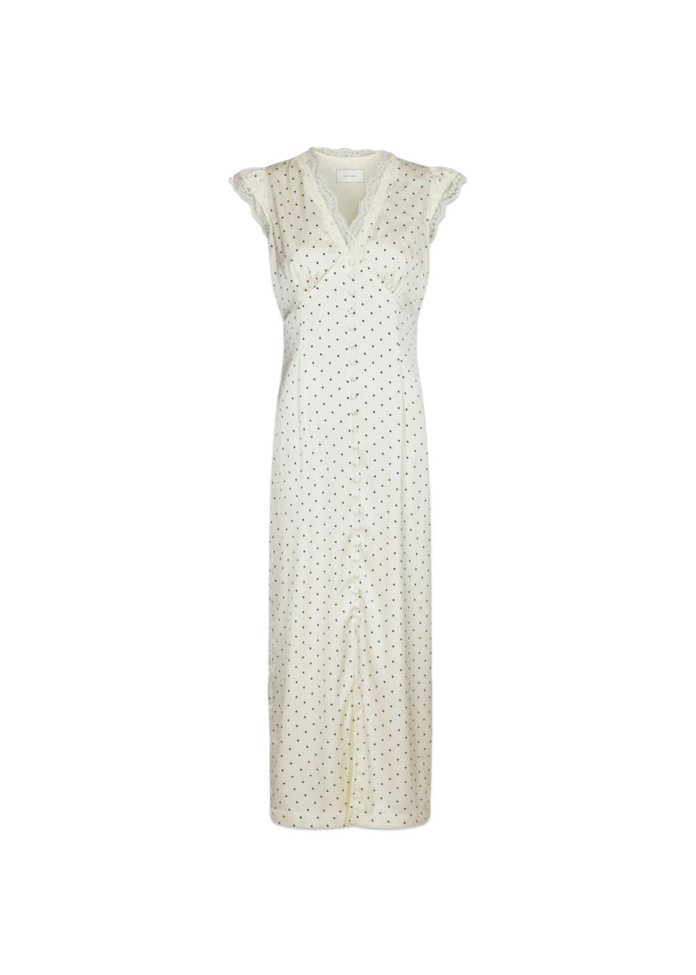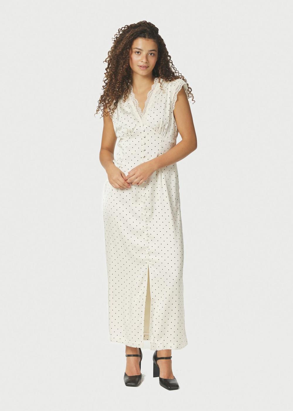 En lang kjole med knapdetailjer foran. Kjolen kommer i en satinqualitet med prikker og har blondekant ved halsudskæringen og på ærmerne. Modellen er 176 cm høj og har en str. 36 på.