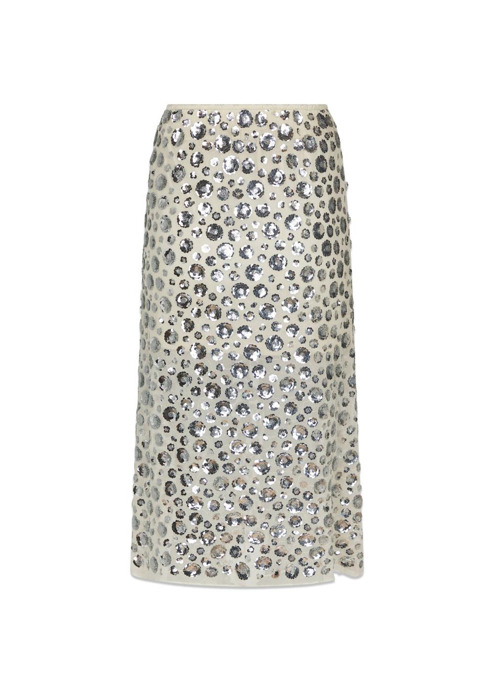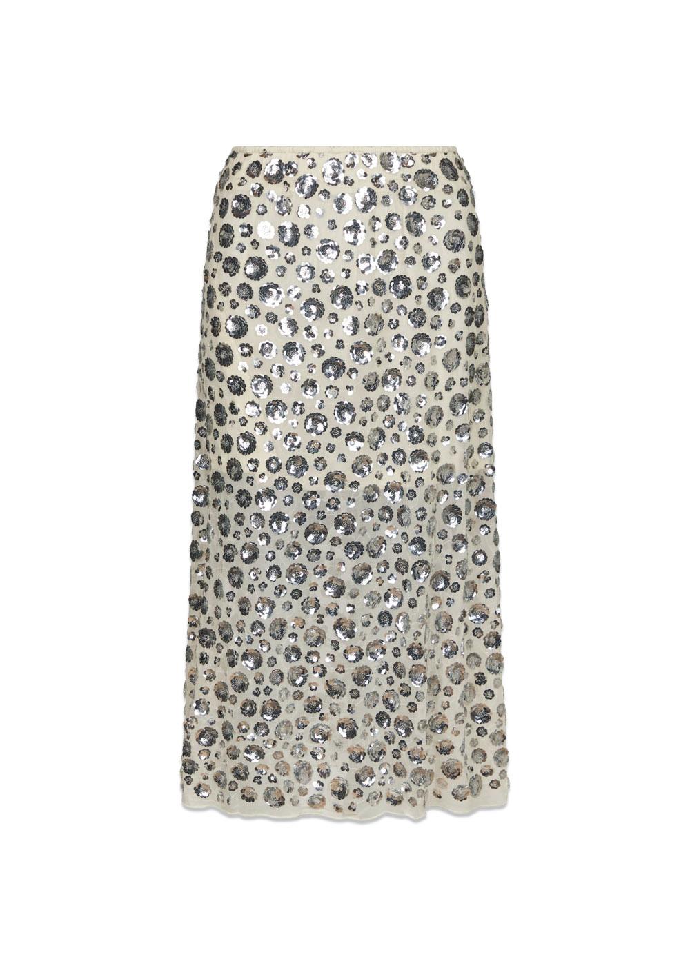 Nederdel med længde til under knæet. Nederdelen kommer i en flot pallietkvalitet med blomster og har elastik i livet. Modellen er 176cm og er iført en størrelse 36.