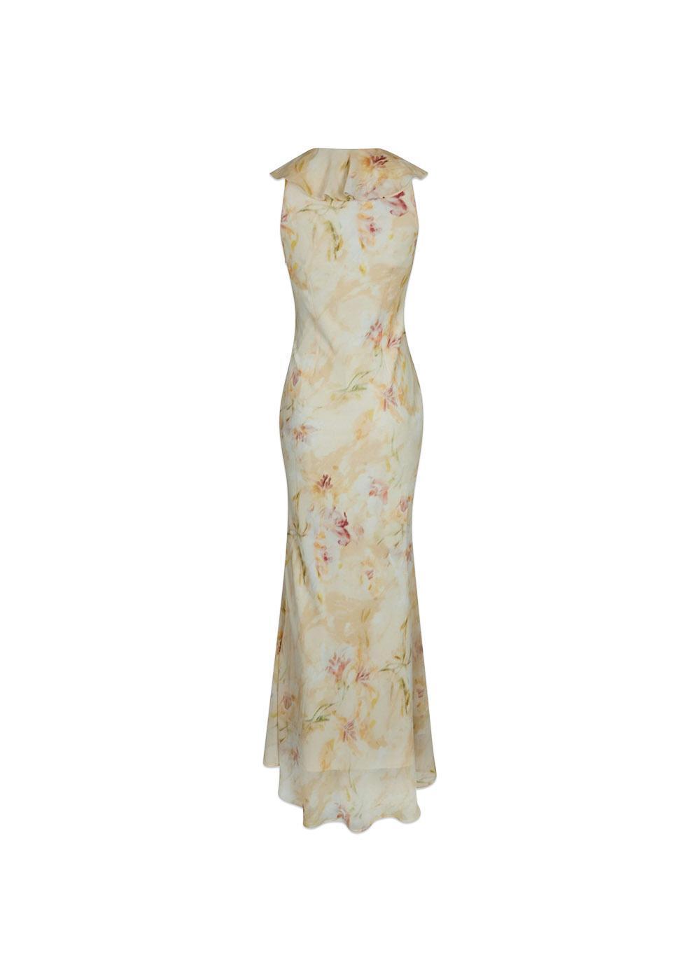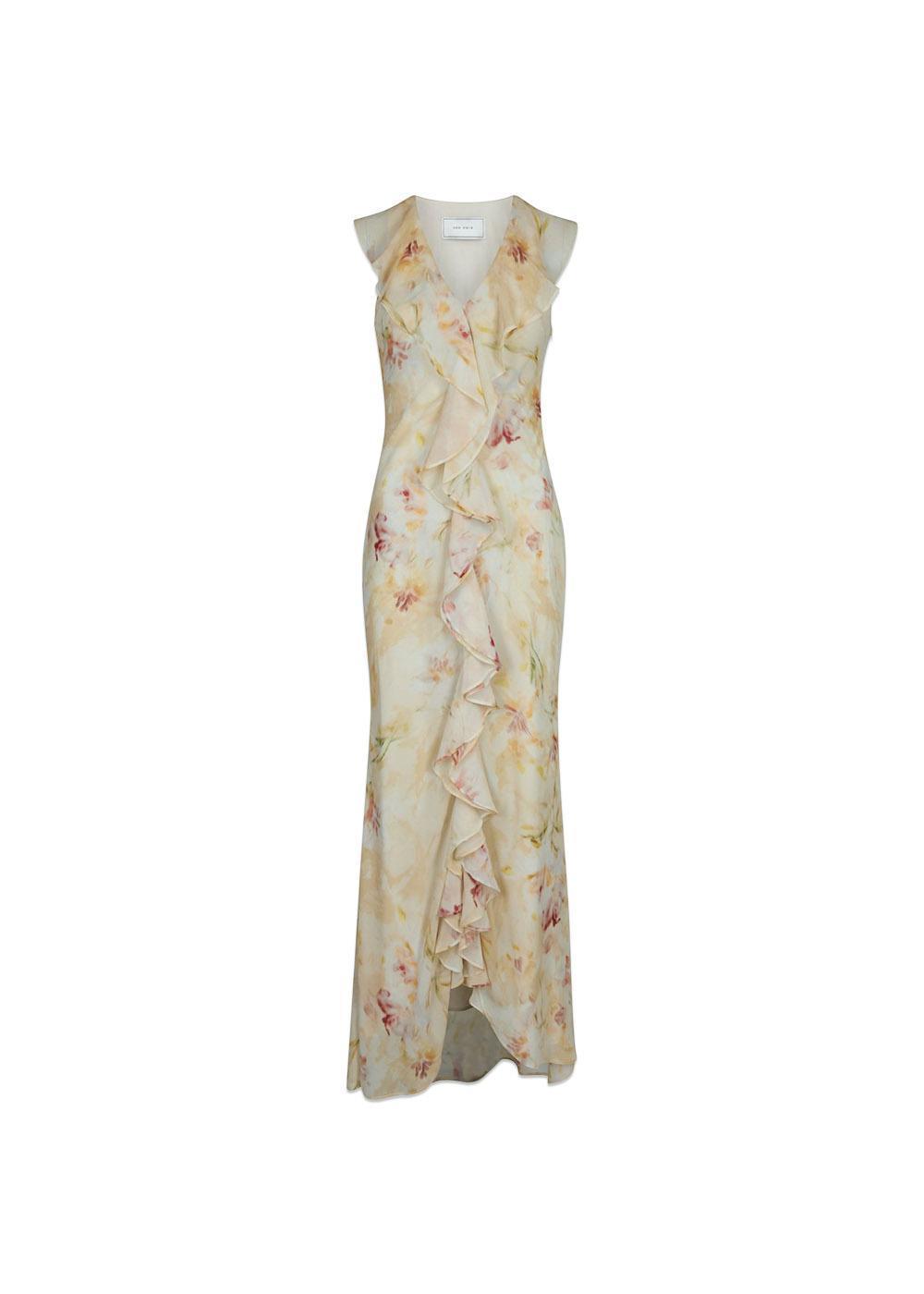 Lang kjole med flæset halsudskæring og slids foran. Modellen er 176 cm høj og har størrelse 36.