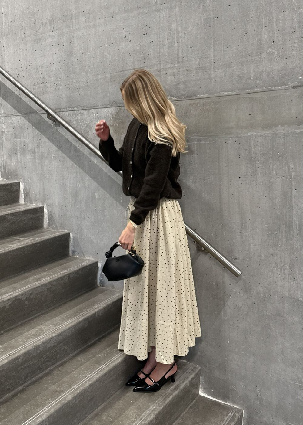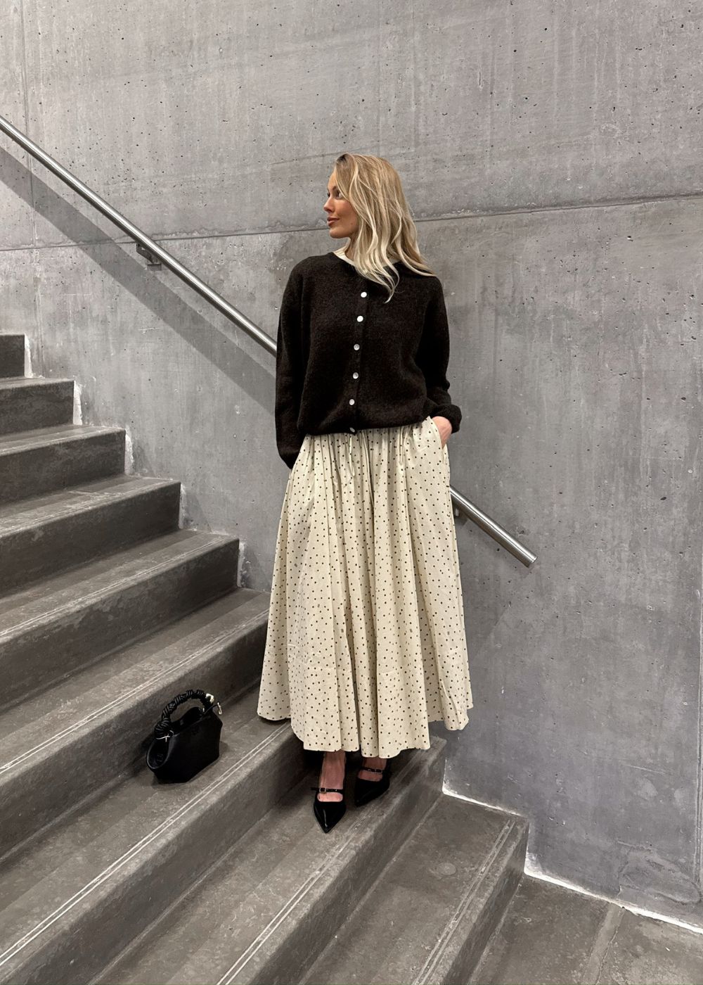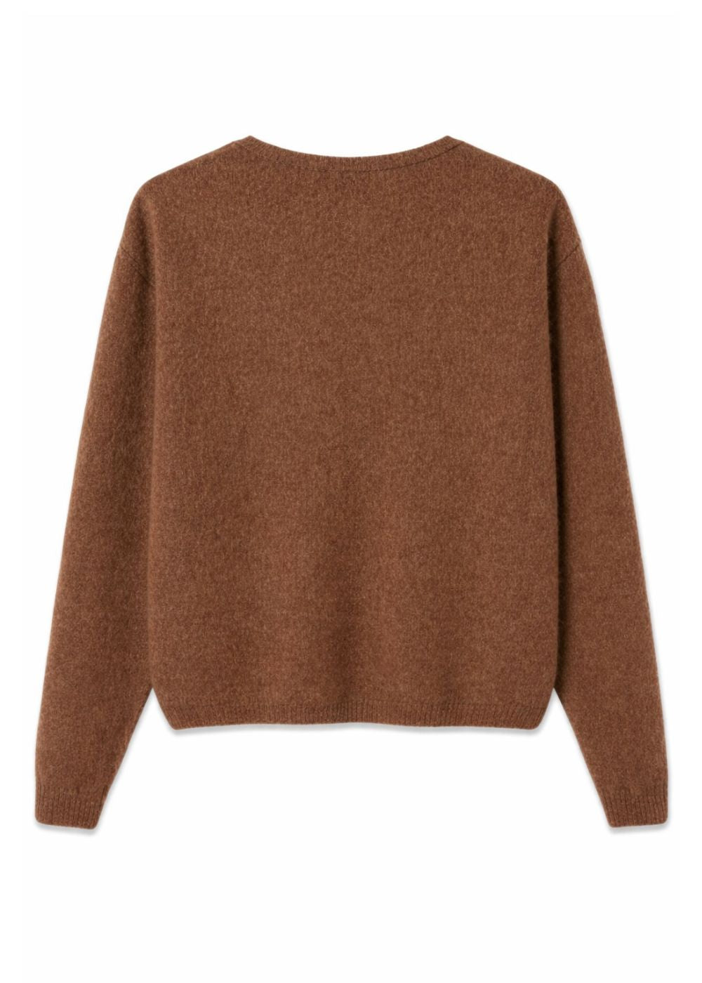 Opdag denne klassiske, finstrikkede cardigan fra American Vintage i en smuk chokoladebrun nuance. Det enkle design med kontrastknapper og en moderne, cropped pasform gør den til en alsidig favorit i garderoben.