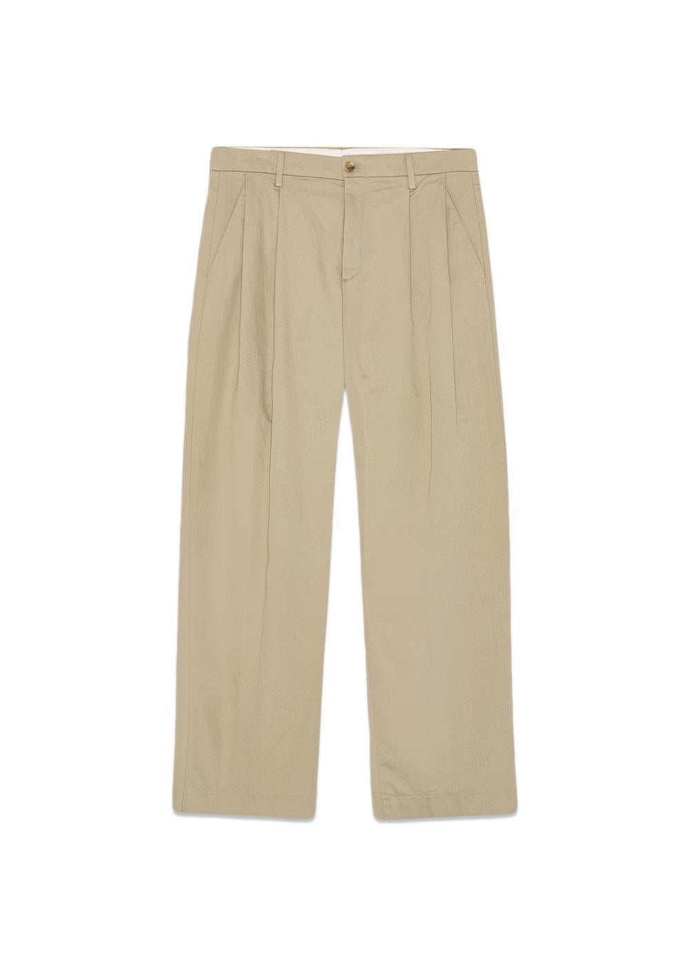 Relaxed fit trousers in a wide-leg silhouette made from organic cotton with a soft brushed finish and herringbone weave. Features double pleats and waistband buckle detailing for tailored elegance.