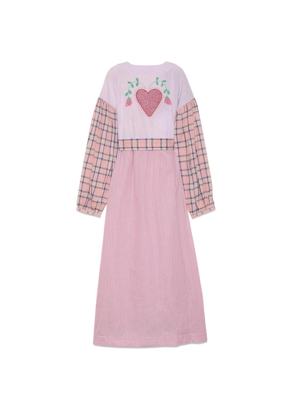 Paula Wrap Dress er en lilla mønstret slå-om-kjole i boho-stil. Den er fremstillet af patchwork-bomuld med voluminøse ærmer, broderi og perleudsmykning samt et broderet hjerte på ryggen.
