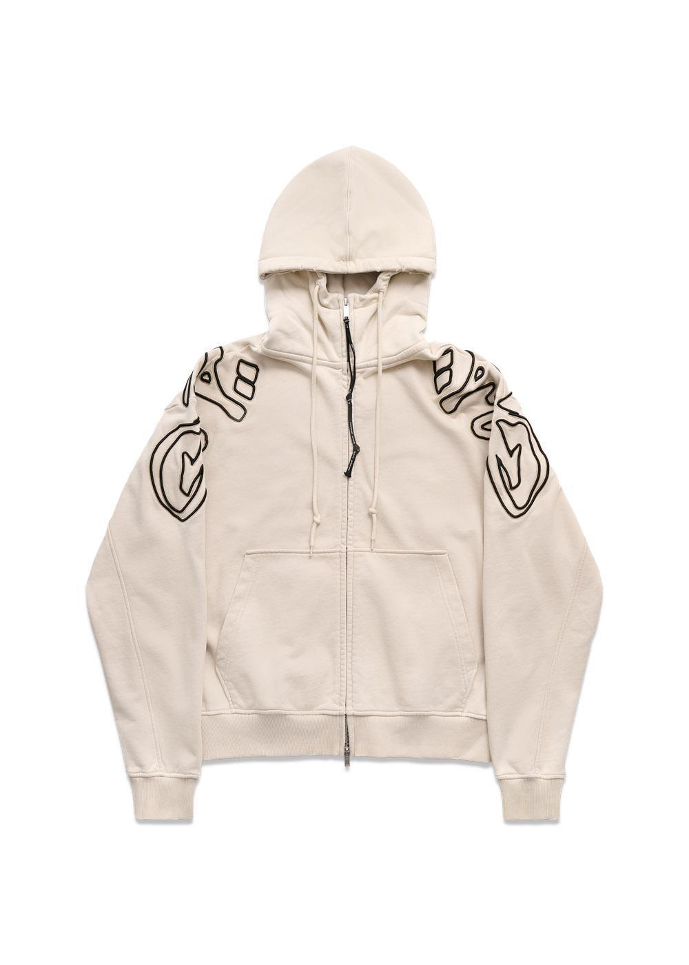 Gyll is a slightly oversized faded sand zip-hoodie, crafted from a heavy weight jersey cotton. The hoodie is soft, pre-shrunk and piece dyed for the ultimate jersey. It features a 2-way zipper, ribbed hem and cuffs for the perfect fit, finished with an original embroidery on both sleeves. - Zip-Hoodie - 2-way zipper - Ribbed hem and cuffs - Oversized fit - Looped back jersey - Material: 100% cotton