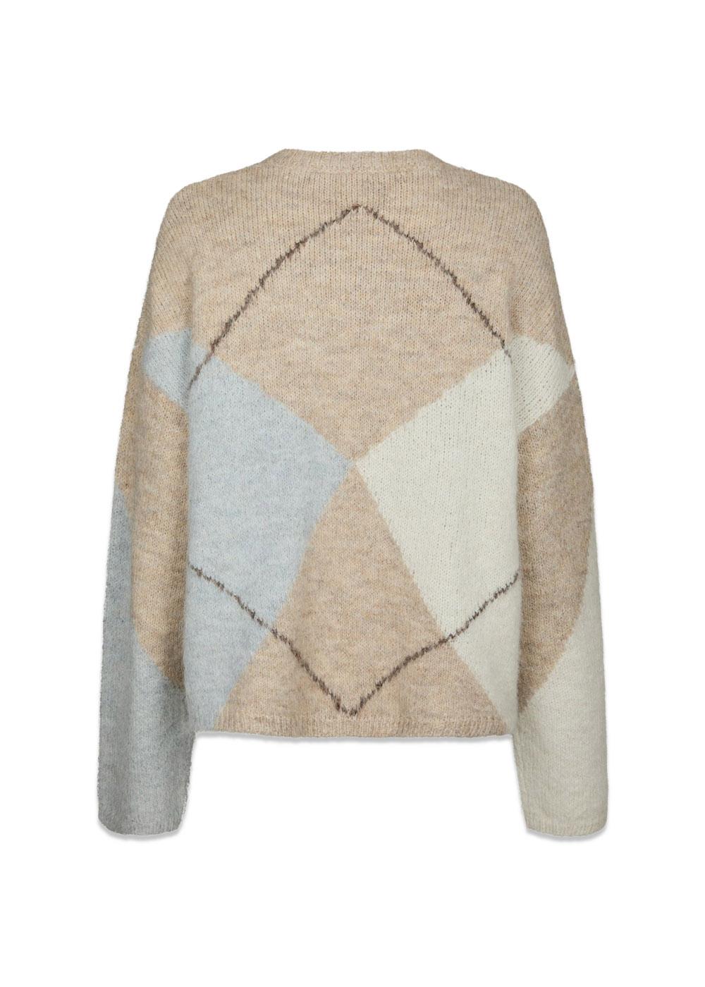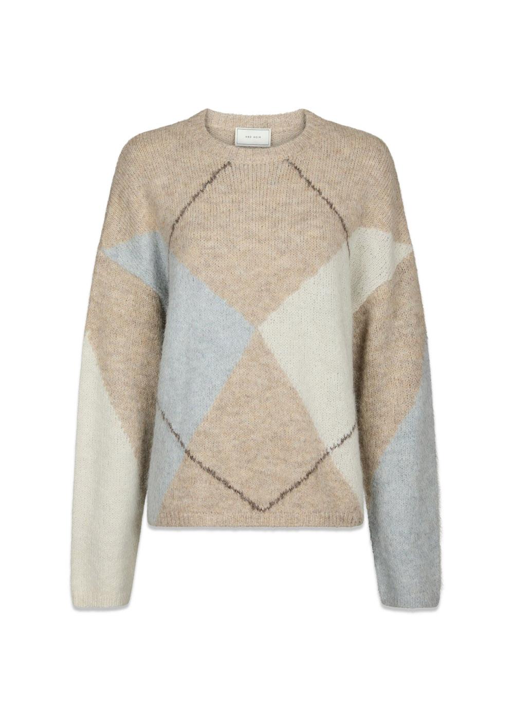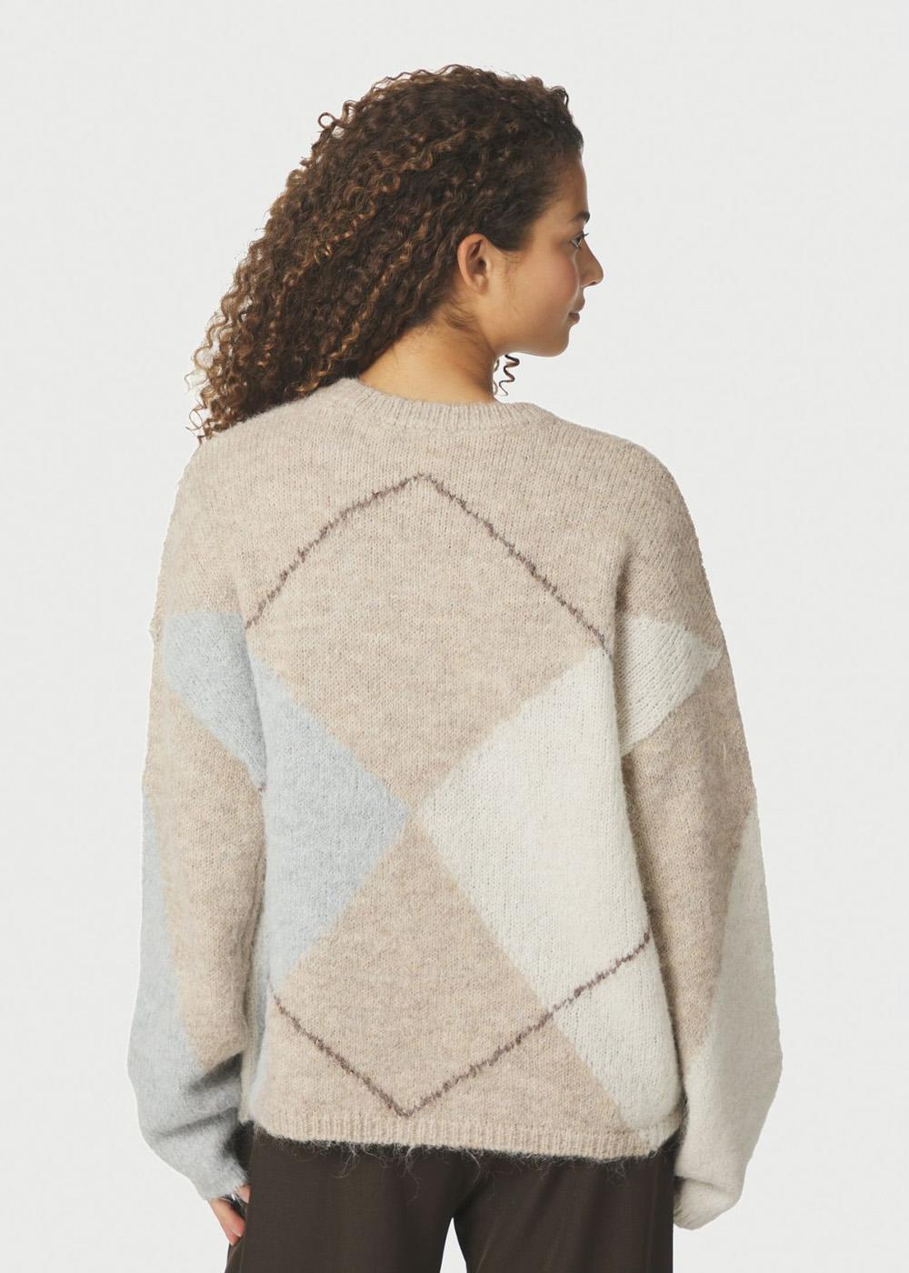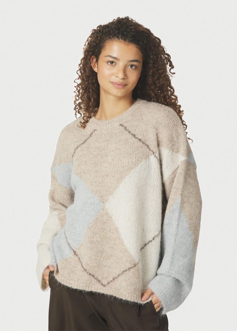 Cool oversize striktrøje i et fint argyle mønster. Kvaliteten er blød og har et nice fluffy look. Modellen er 176cm og er iført en størrelse 36.