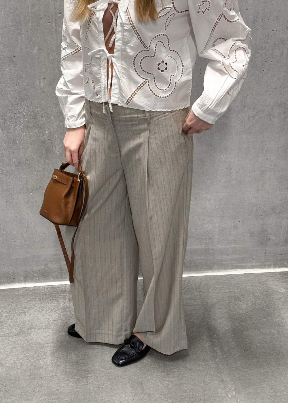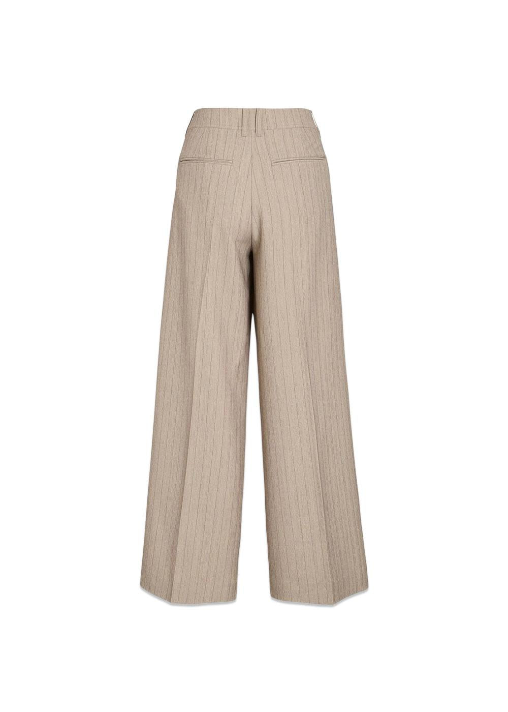 ROUSAGA er en klassisk buks i Feather Gray Melangé Herringbone med nålestribet mønster. Buksen har brede, lige ben, fast linning og er udført i en blanding af polyester, viscose og elastan.