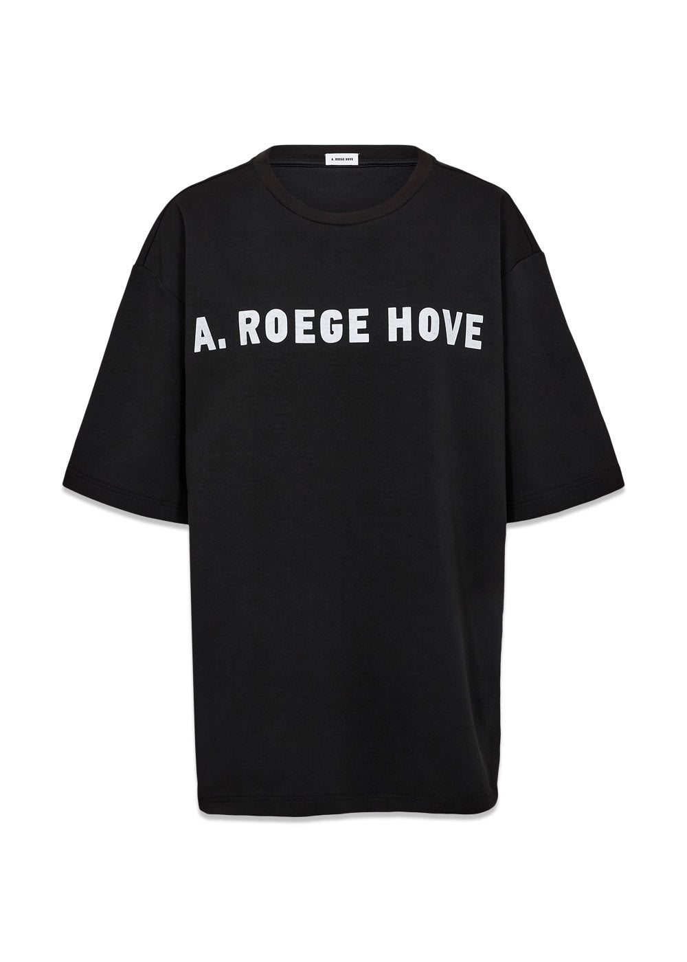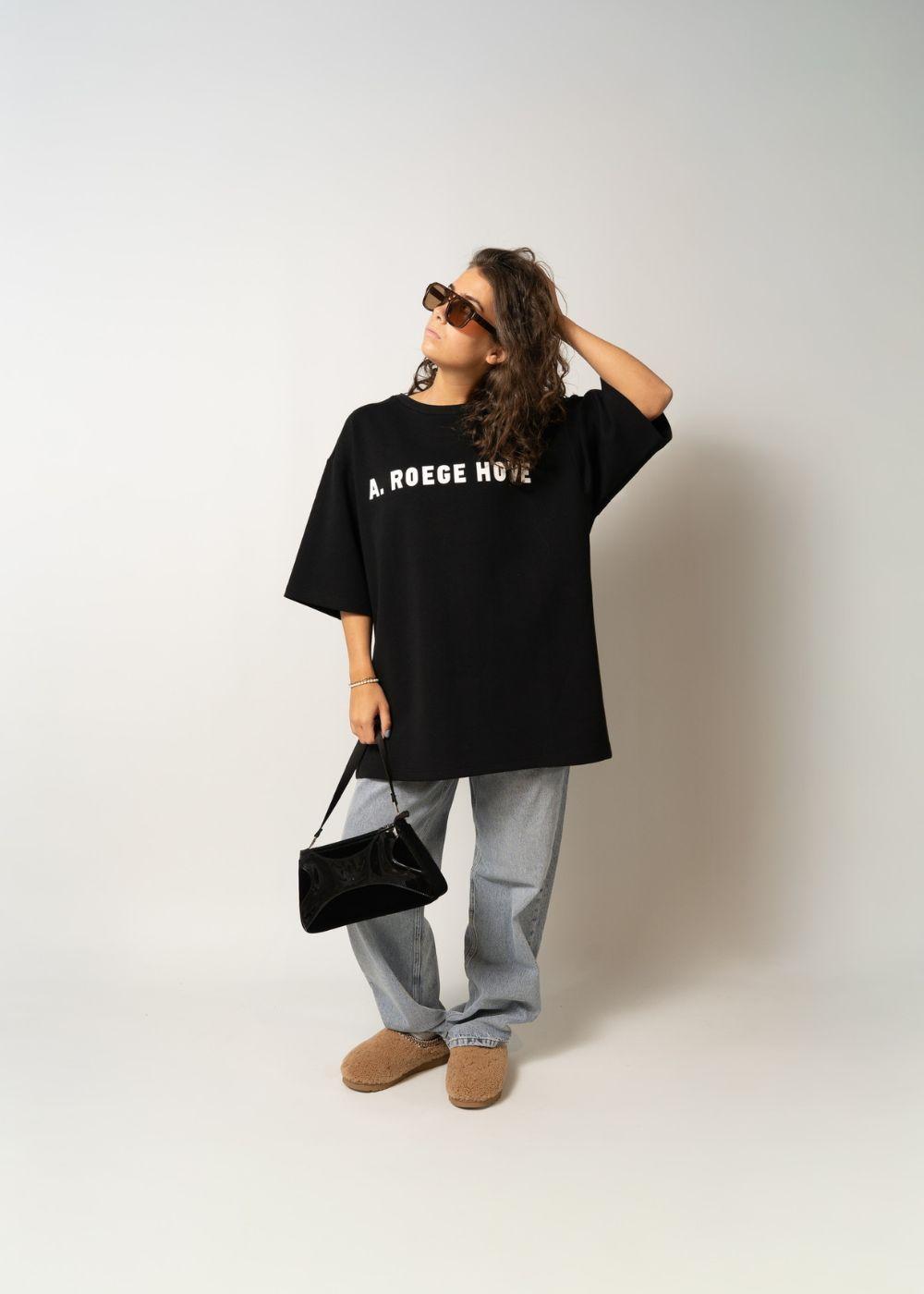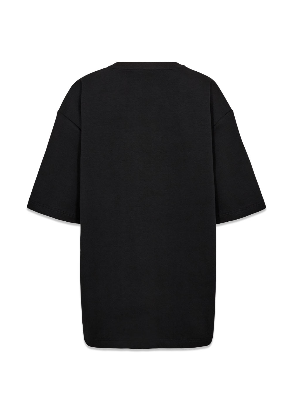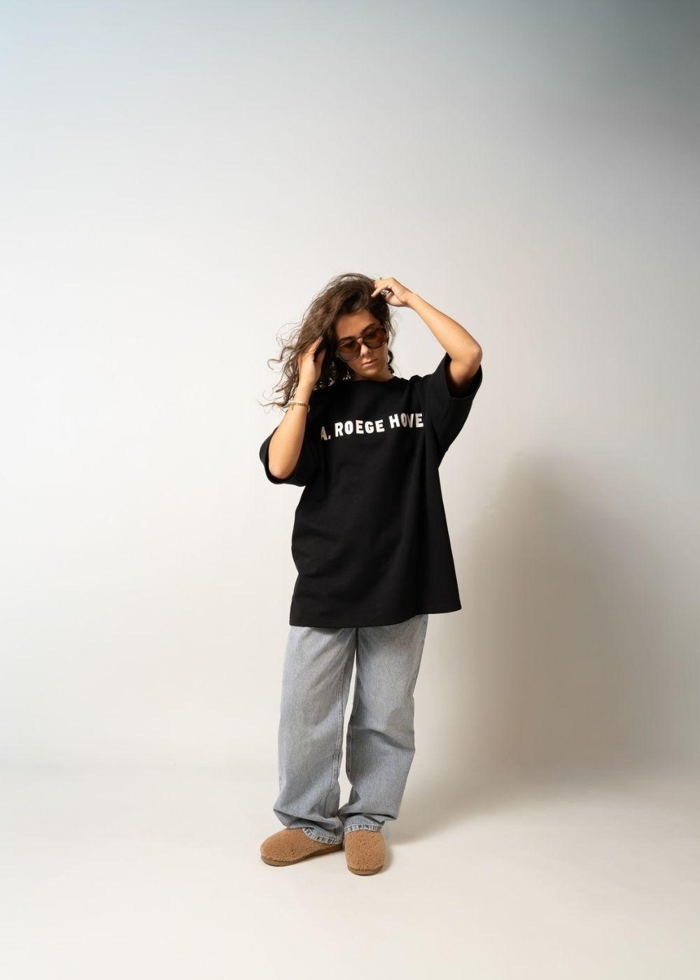 Bo Logo Tee er en sort t-shirt i et boxy snit med streetwear-udtryk. Overdelen har korte ærmer med drop-shoulder, rund halsudskæring og et hvidt logo-print på brystet.