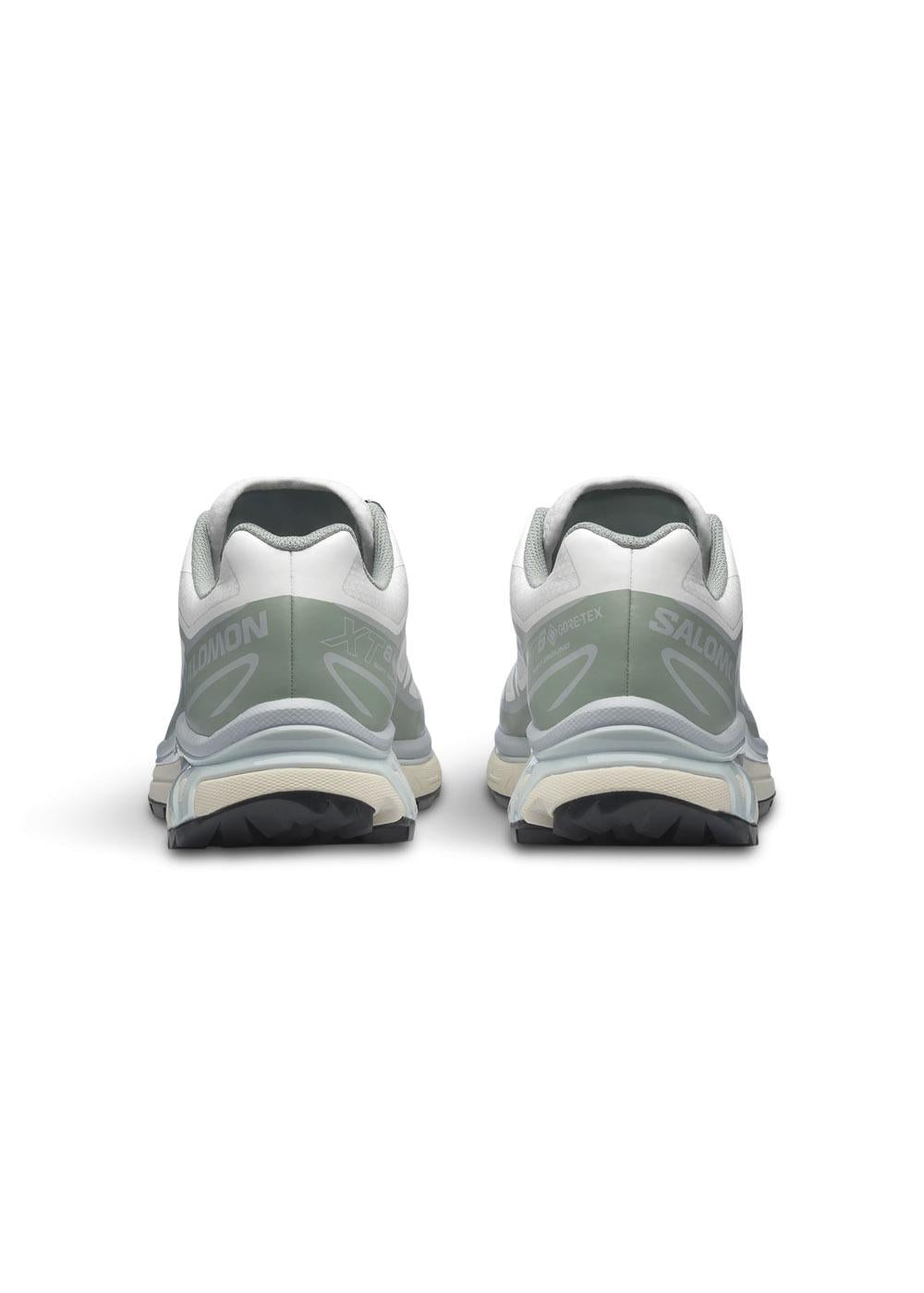 XT-6 GORE-TEX er en teknisk sneaker til blandet terræn og skiftende vejr. Skoen har en overdel i slidstærk tekstil med syntetiske forstærkninger og en vandtæt GORE-TEX membran i hvid, grøn og grå.