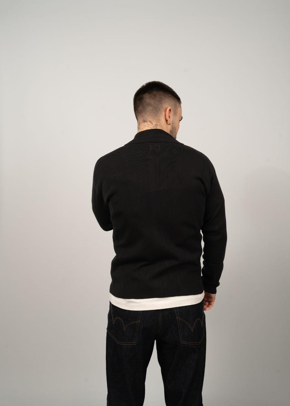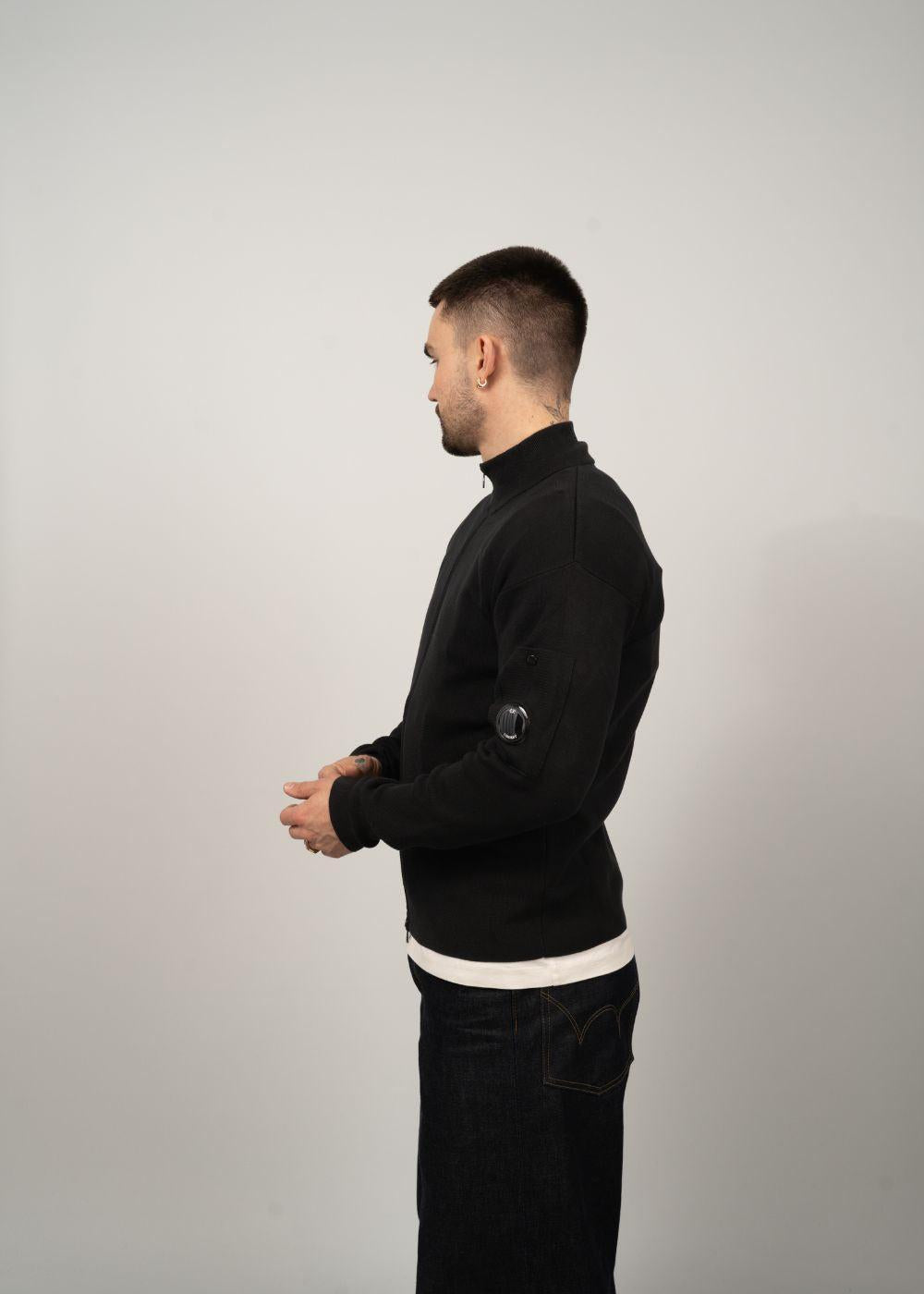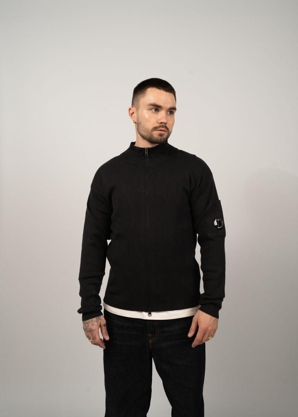 Denne ensfarvede sorte cardigan fra C.P. Company har en høj hals og et afslappet snit med drop-shoulder. Modellen er designet med lange ærmer og gennemgående lynlåslukning til hverdagsbrug og business.