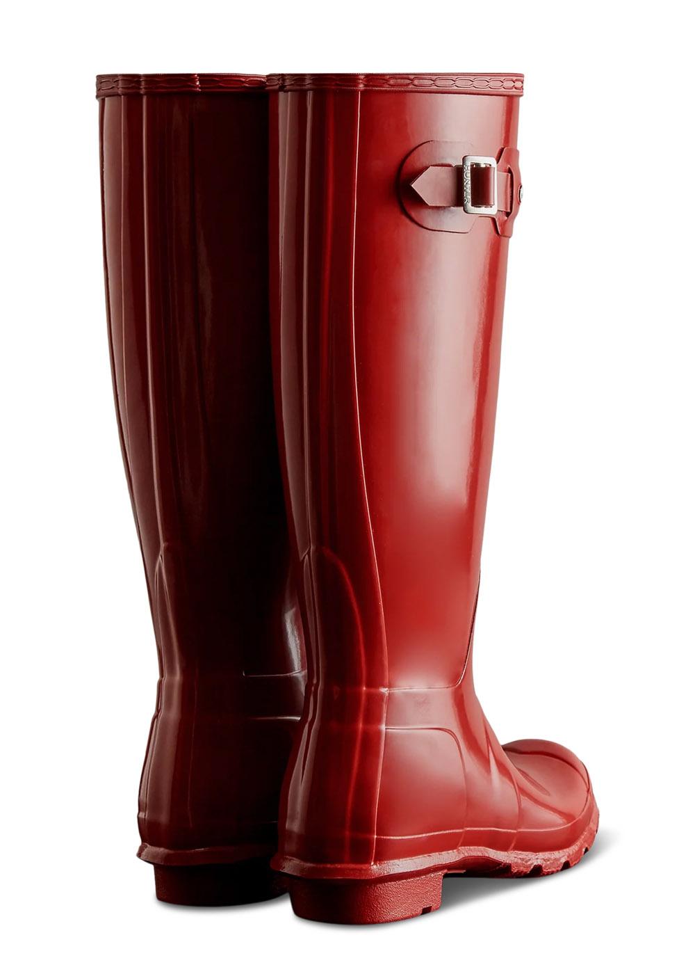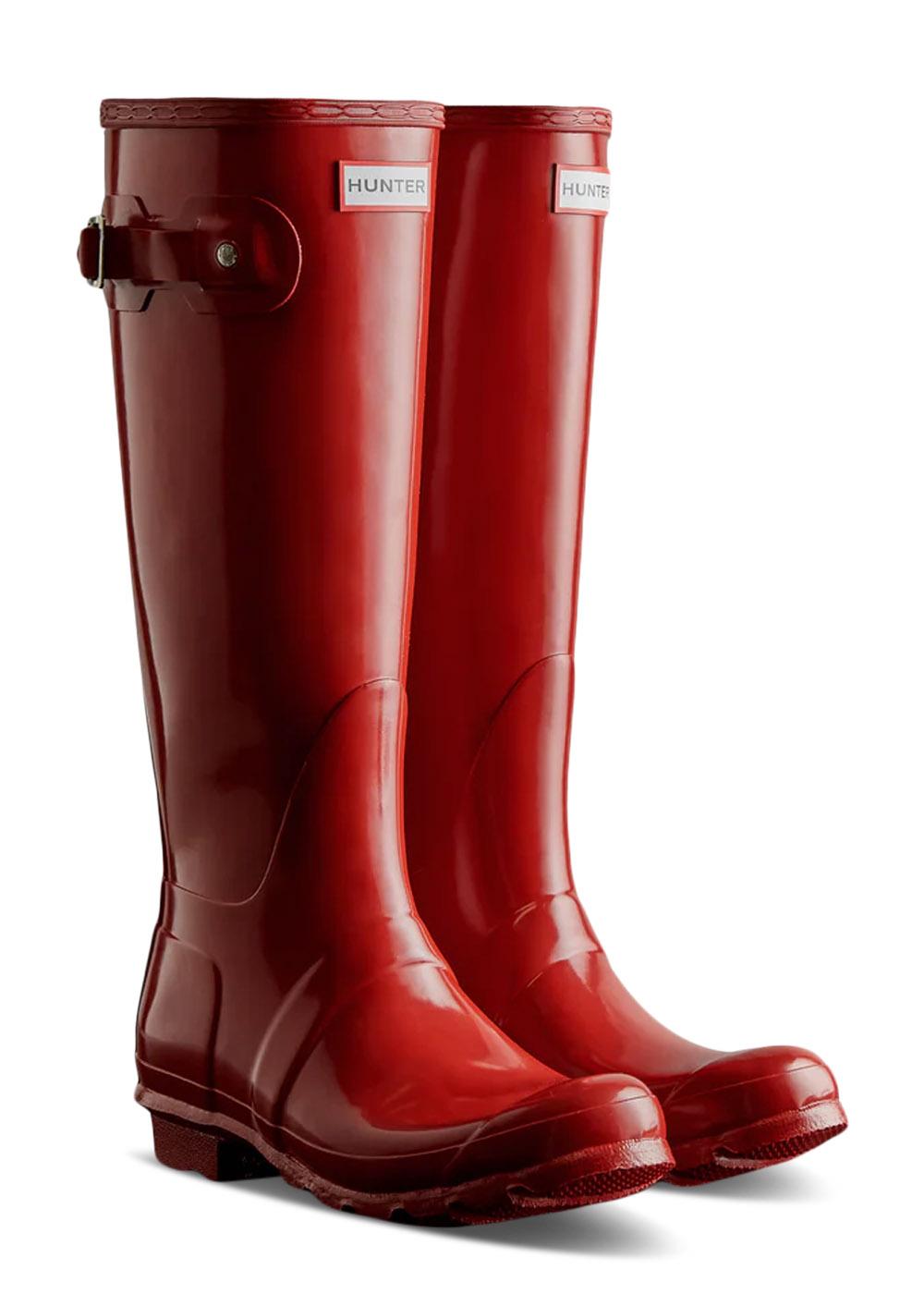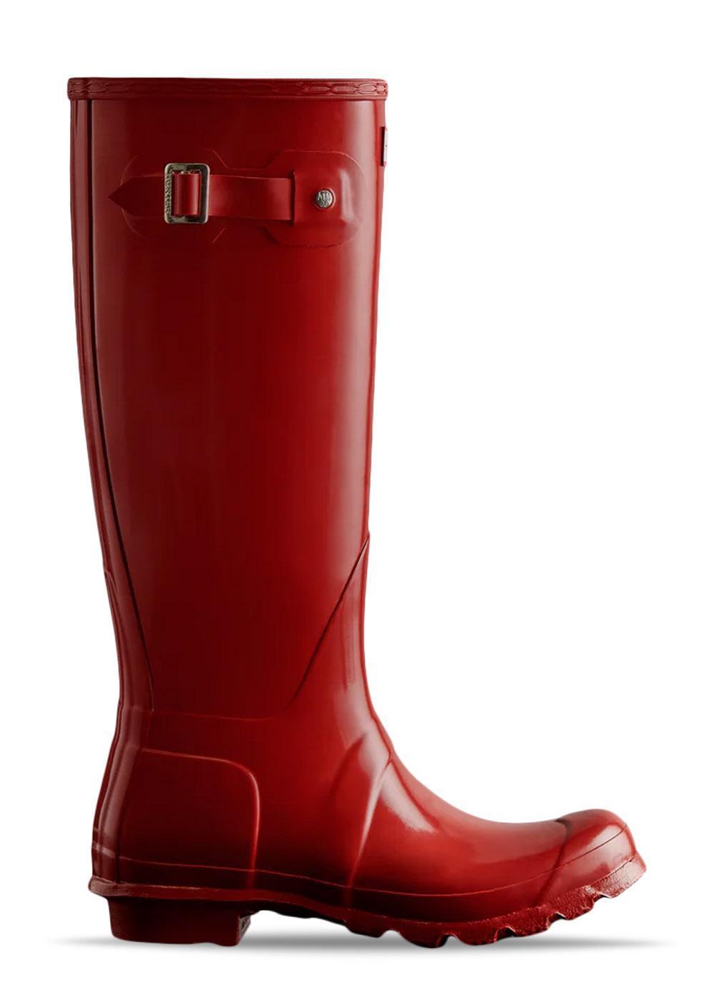 WOMENS ORIGINAL TALL GLOSS BOOT er en høj gummistøvle fra Hunter i farven Military Red. Støvlen har en blank overflade, en justerbar rem på siden og en lav blokhæl.