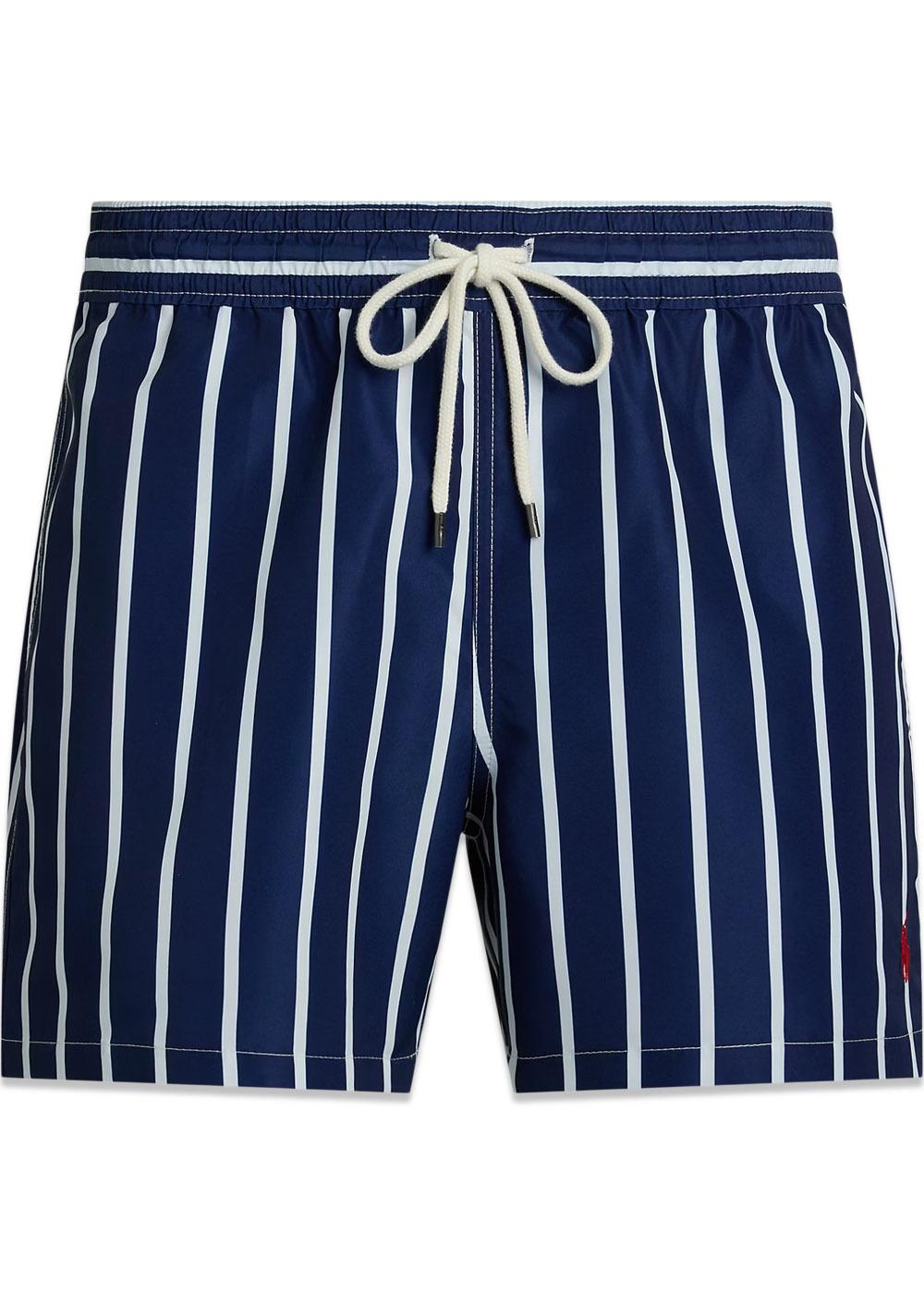 Disse Traveler badebukser fra Ralph Lauren er designet i en navyblå og hvid farvekombination med et klassisk stribet mønster. Modellen har en slank pasform og er velegnet til brug i sommerperioden.