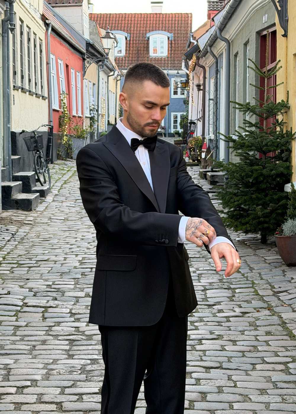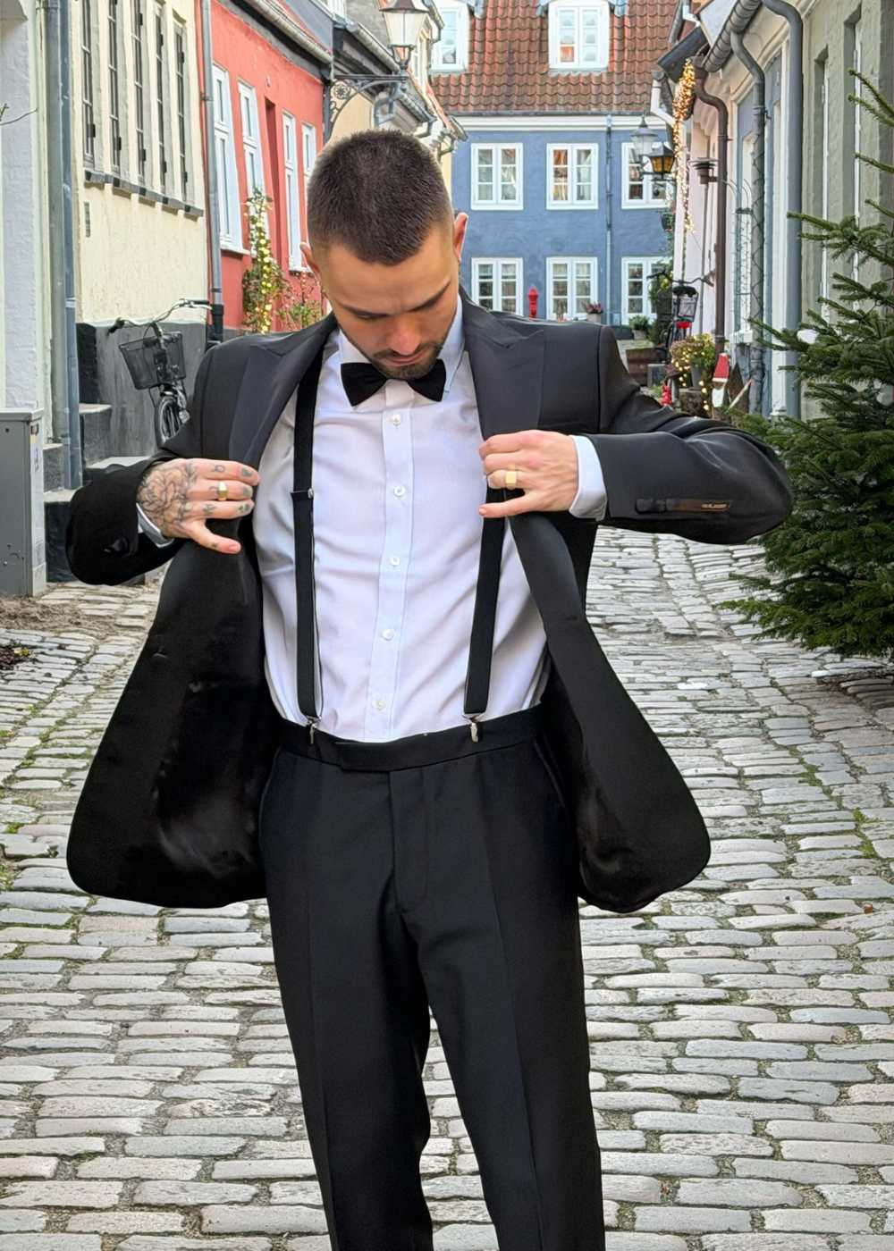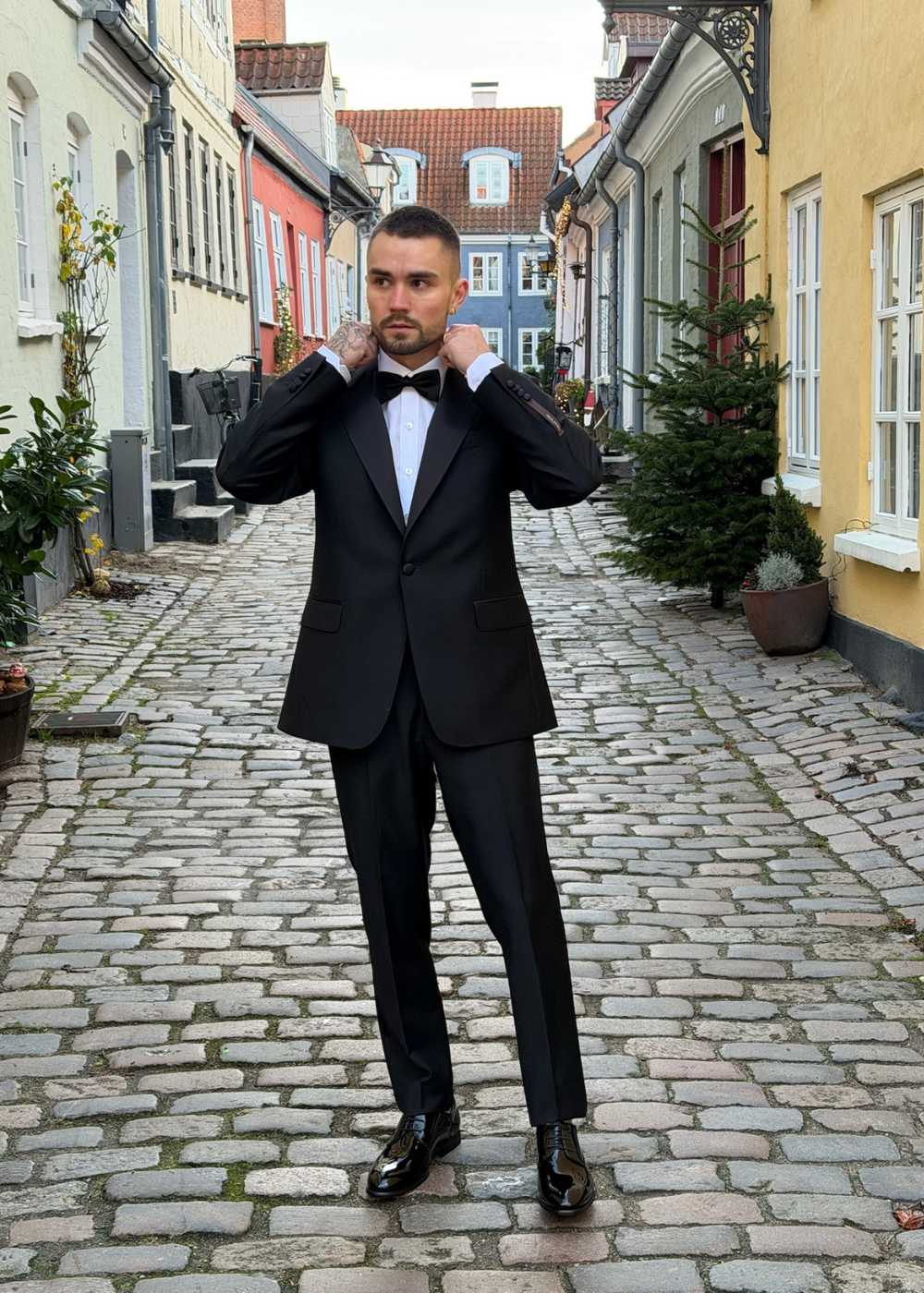 Oscar Jacobson's Frampton Tux Blazer i sort er en tidløs tilføjelse til enhver garderobe. Med sin klassiske stil og ventless rygdetalje, passer den perfekt til både formelle og afslappede lejligheder. Kombinér med jeans for et ubesværet look eller med matchende bukser for et komplet jakkesæt.