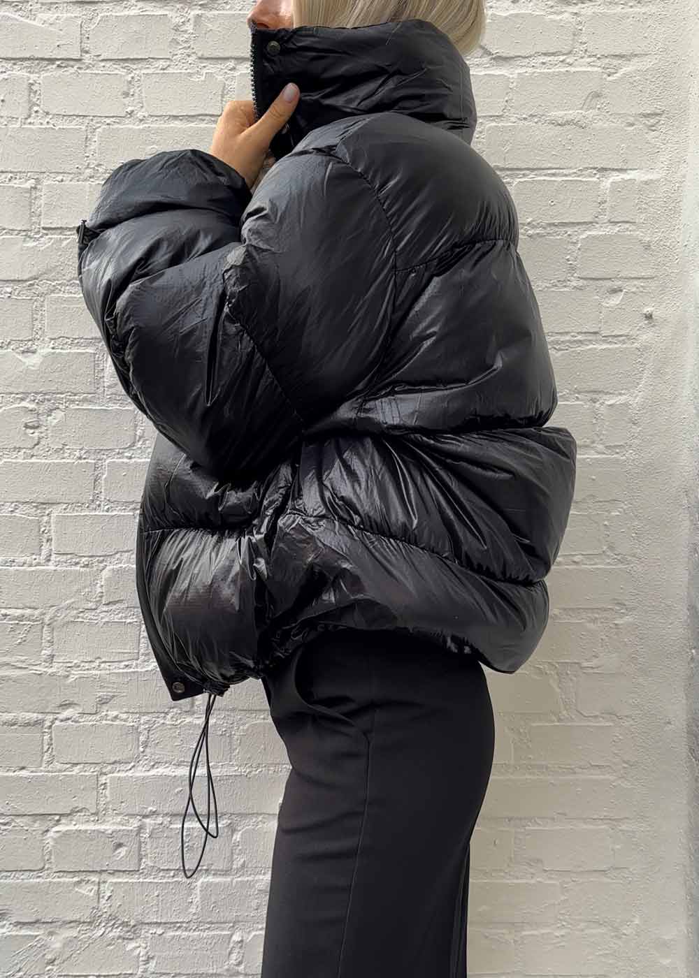 Active String Jacket er en cool pufferjakke med høj krave, lynlås foran og trykknapper. Jakken er polstret og har to skjulte sidelommer samt snørebånd ved manchetterne, taljen og forneden. Active String Jacket har en løs pasform og en voluminøs silhuet, som kan gøres mere tætsiddende ved brug af snørerne.