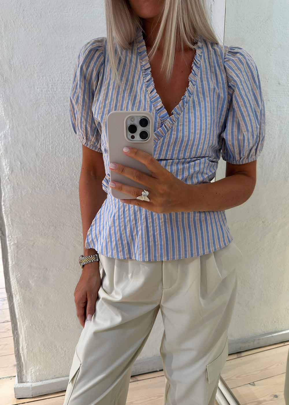 Isabella er en top fra Neo Noir med v-udskæring og kort ærmer. Toppen lukkes med bindebånd i den ene side og har en tætsiddende pasform.