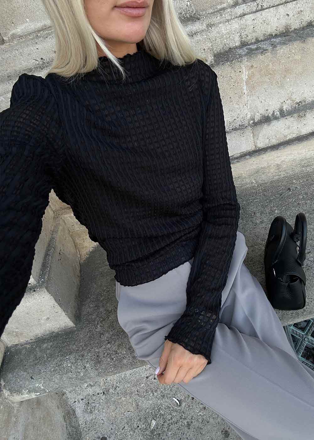 GeniferMD top er en fin top med en smule høj hals og lange ærmer. Toppen er lavet i et let transparent materiale med små firkanter all over. Toppen har et tætsiddende fit.