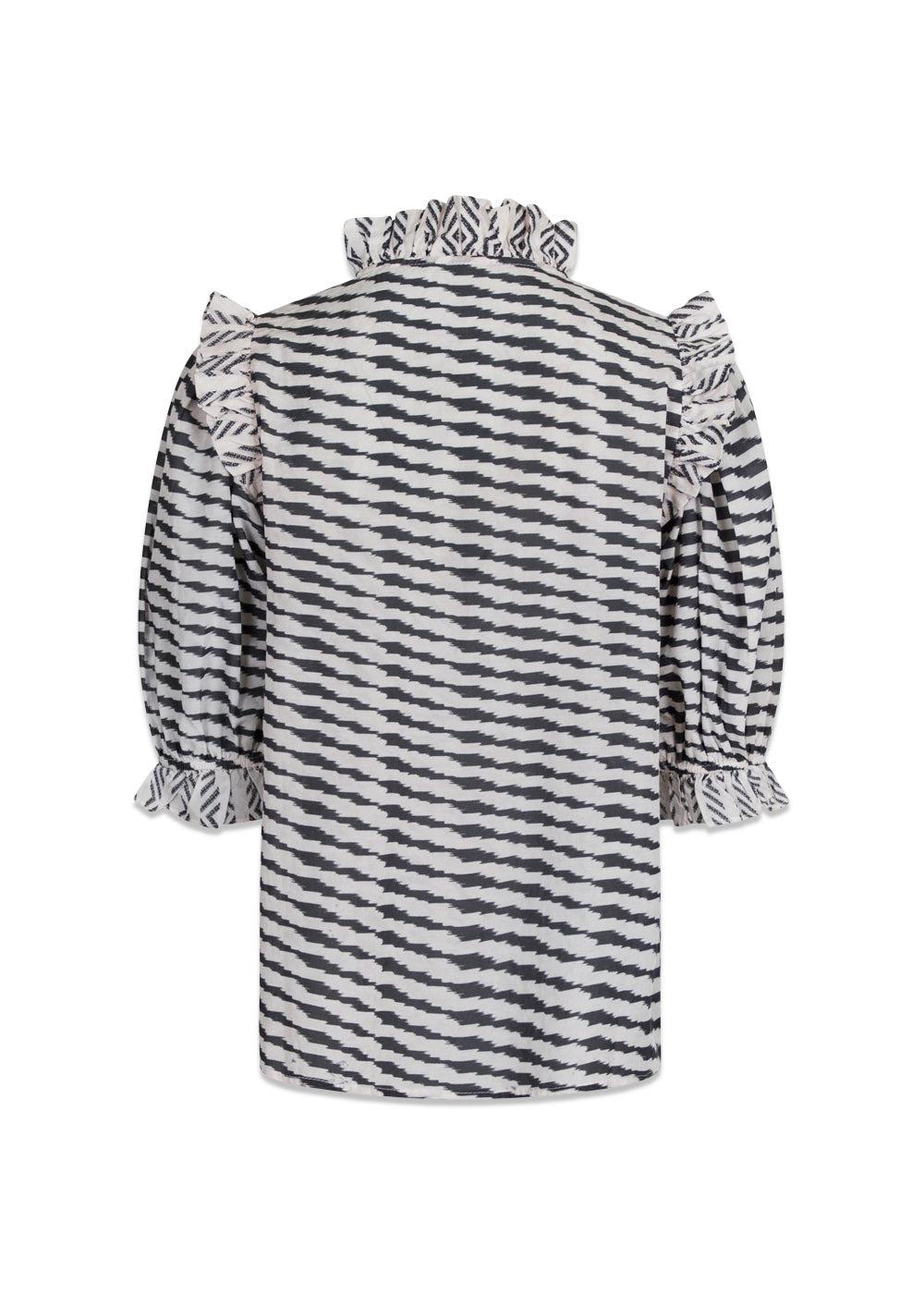 Chacha er en bluse fra Neo Noir med 3/4 ærmer og løs pasform. Blusen har høj hals, knaplukning foran og flæsedetaljer.